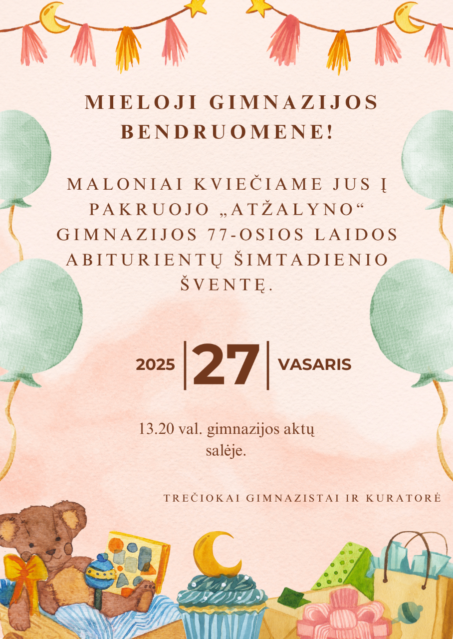 Vasario 27 d. 13.20 val. maloniai kviečiame Jus stebėti „Atžalyno“ gimnazijos 77-osios abiturientų laidos Šimtadienio šventę nuotoliniu būdu.