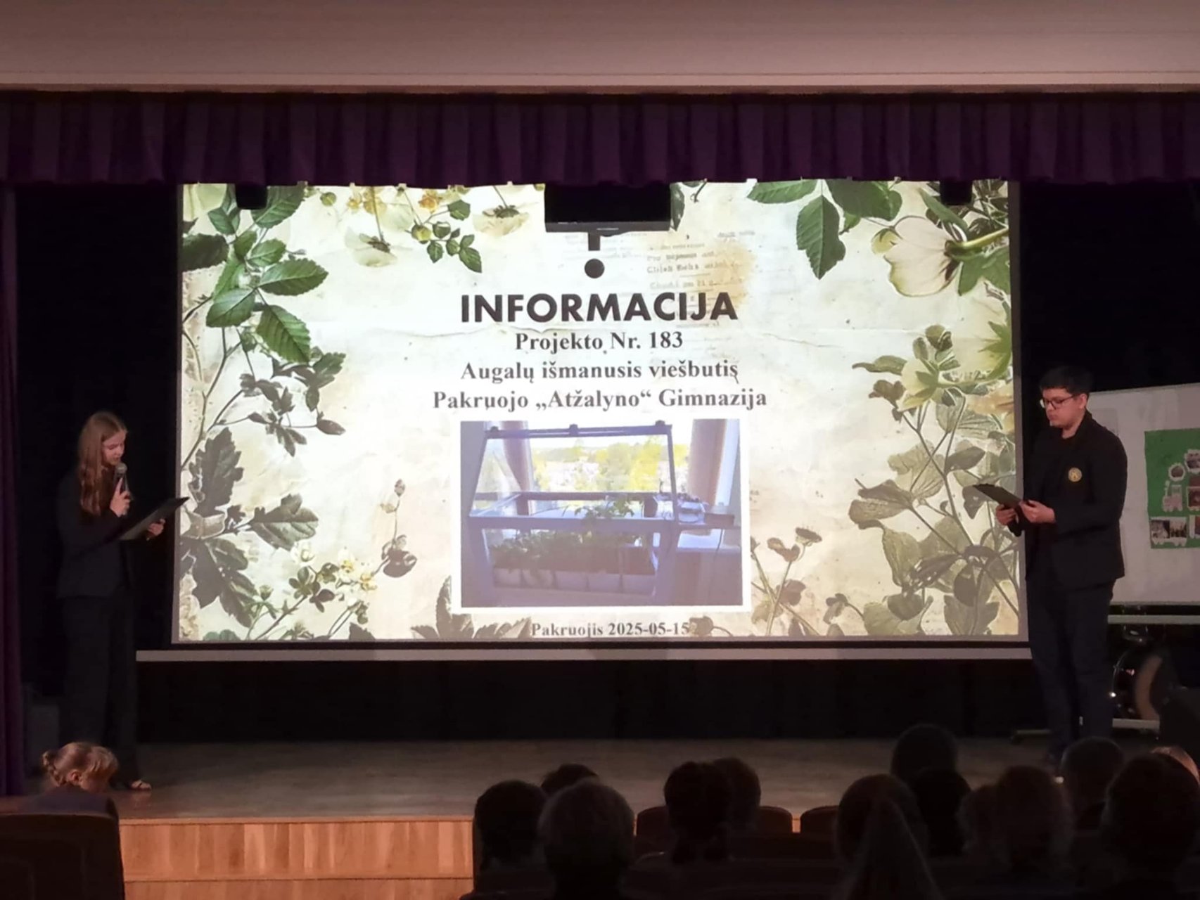 Mūsų gimnazija jau antrus metus dalyvauja Vilniaus TECH nuotolinio ugdymo programoje „Ateities inžinerija“. Šiais metais fizikos mokytoja Vida Imanavičiūtė ir III c klasės mokiniai Monika Kavarskaitė, Lukrecija Beinoraitė, Rytis Rimkus ir Karolis Grušas iš dvidešimt vienos siūlomos krypties pasirinko temą „Išmanusis šiltnamis“ ir ėmėsi veiklos. Nuo spalio mėnesio gimnazijoje buvo kuriamas išmanusis šiltnamis. Prieš šv. Velykas komisijai išsiuntėme vaizdo įrašą, plakatą ir aprašą. Po dviejų savaičių sužinojome, kad patekome į „Ateities inžinerijos“ 8-ojo sezono uždarymo šventę-finalą. Gegužės 21 d. vykome į Vilniaus TECH, kur visi dalyviai pristatė savo darbus komisijai. Mūsų komanda užėmė I vietą!
