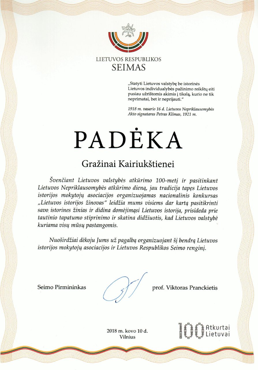 Kovo 10 d. Seime vyko nacionalinio konkurso „Lietuvos istorijos žinovas“ II turas, kuriame dalyvavo ir mūsų gimnazijos IVa klasės mokinė Gabija Lampickaitė, I etapo gimnazijoje nugalėtoja. Abiturientė vyko kartu su savo istorijos mokytoja ir auklėtoja Gražina Kairiūkštiene, kuri dar dirbo ir vertinimo komisijoje. Du šimtai I turo nugalėtojų žinias demonstravo Kovo 11-osios Akto salėje. Gabija šauniai atstovavo gimnazijai ir gavo padėkos raštą. Šis konkursas - puiki galimybė sužinoti įdomių ir gana netradicinių istorinių faktų apie Lietuvą, be to, buvo organizuota ekskursija po Seimą. Mokytoja Gražinai Kairiūkštienei dėkota už aktyvų dalyvavimą įvairiuose projektuose bei konkursuose.