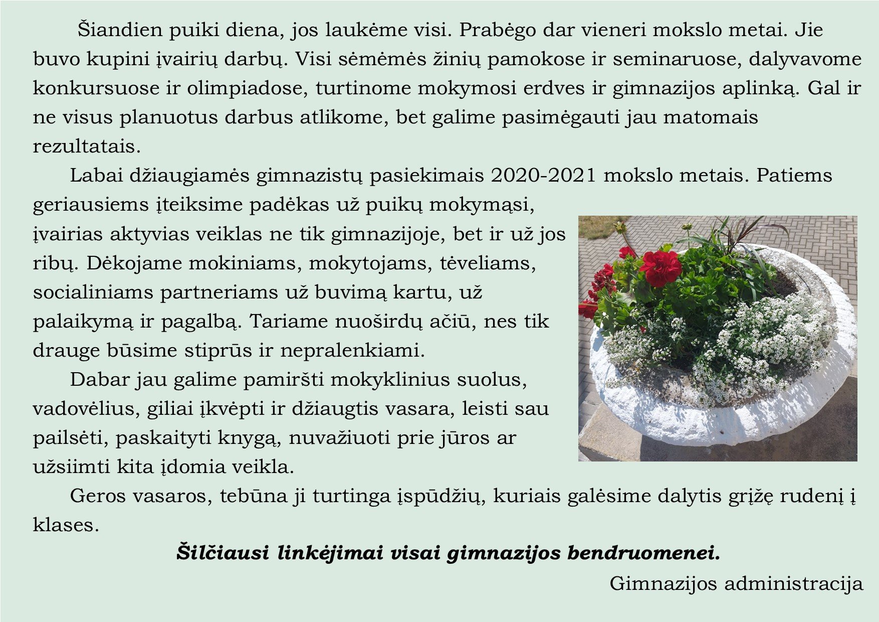 Ačiū visiems plaukusiems, dėkingi administracijai už palaikymą bei kolegoms Romai B. ir Aurimui A., kurie įsijungė į mūsų būrį ir kartu ryžosi pasinerti į šį įspūdingą nuotykį. Ačiū tėveliams už pasitikėjimą, kuris leido vaikams įgyti daug naujos patirties.