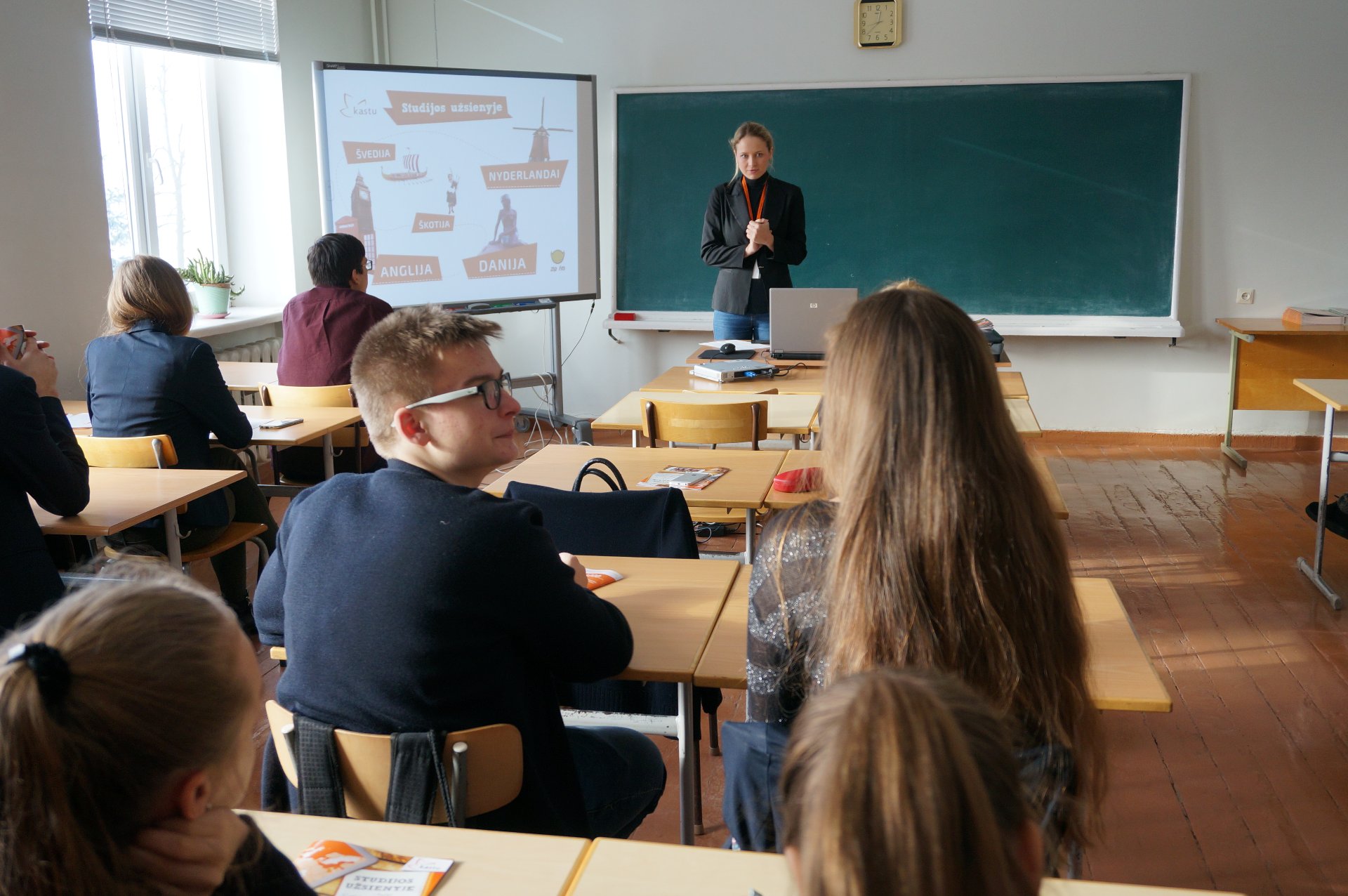 Lapkričio 9 dieną gimnazijoje svečiavosi projekto ,,Kurk Savo Ateitį!“ organizacijos „KASTU International“ atstovė Monika Elijošienė, kuri pasidalijo aktualia bei naudinga informacija apie studijų užsienyje galimybes, stojimo į aukštąsias mokyklas procesą, finansavimo galimybes. Gimnazistai buvo supažindinti su Danijos, Švedijos, Nyderlandų, Anglijos bei Škotijos švietimo sistema, jiems papasakoti jau studijavusių šiose šalyse atsiliepimai. Atstovė pateikė ir kitos vertingos medžiagos, pavyzdžiui, kaip užpildžius vieną anketą internetu galima įstoti net į kelis skirtingus universitetus. Gimnazistai susidomėjo tuo, kad yra organizuojamos kelionės į Danijos ir Nyderlandų aukštąsias mokyklas, kada mokiniai patys gali pabendrauti su dėstytojais ir studentais. Tikimės, kad susitikimas padės jauniems žmonėms apsispręsti, kokį kelią rinktis ateityje.