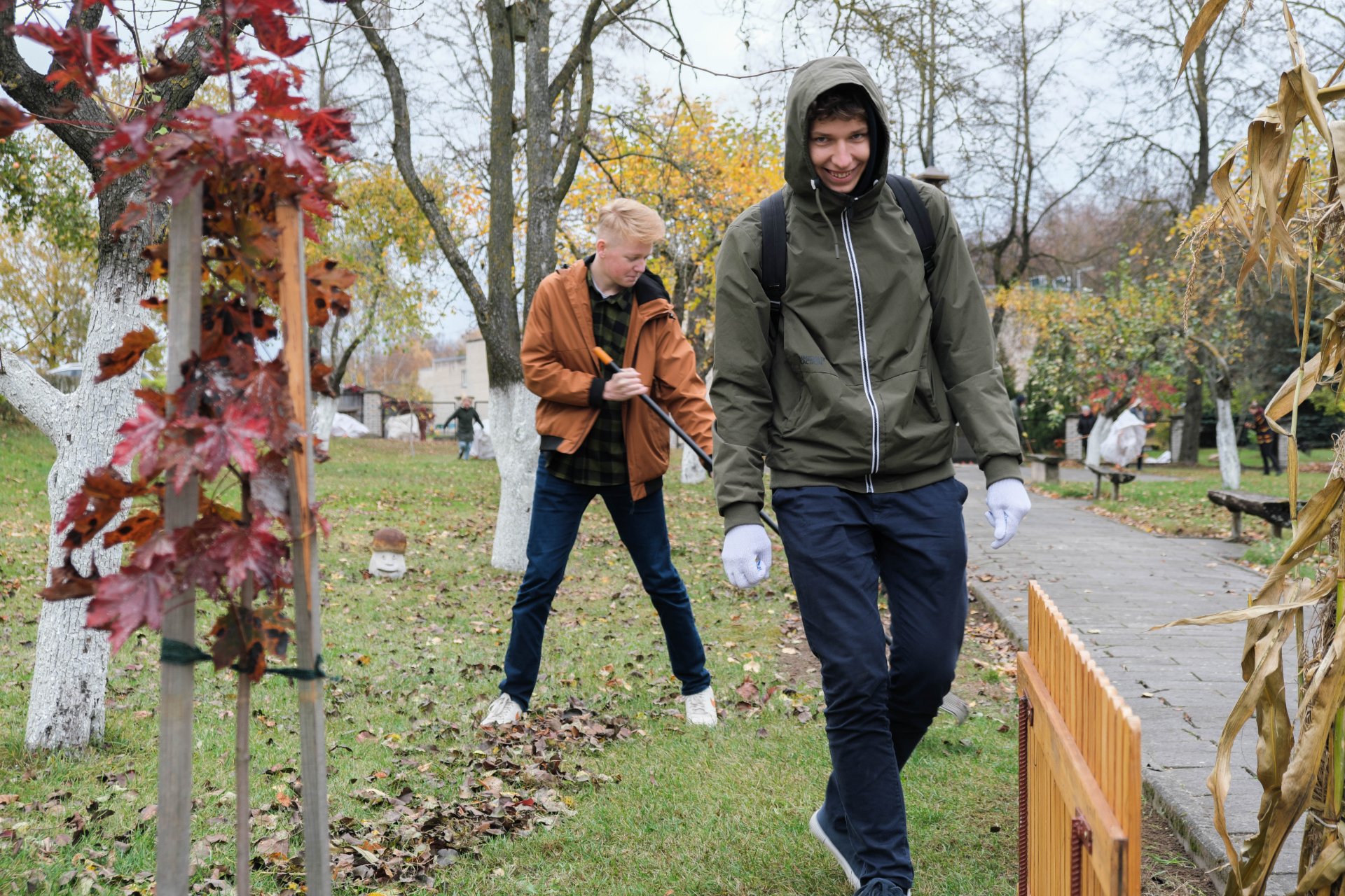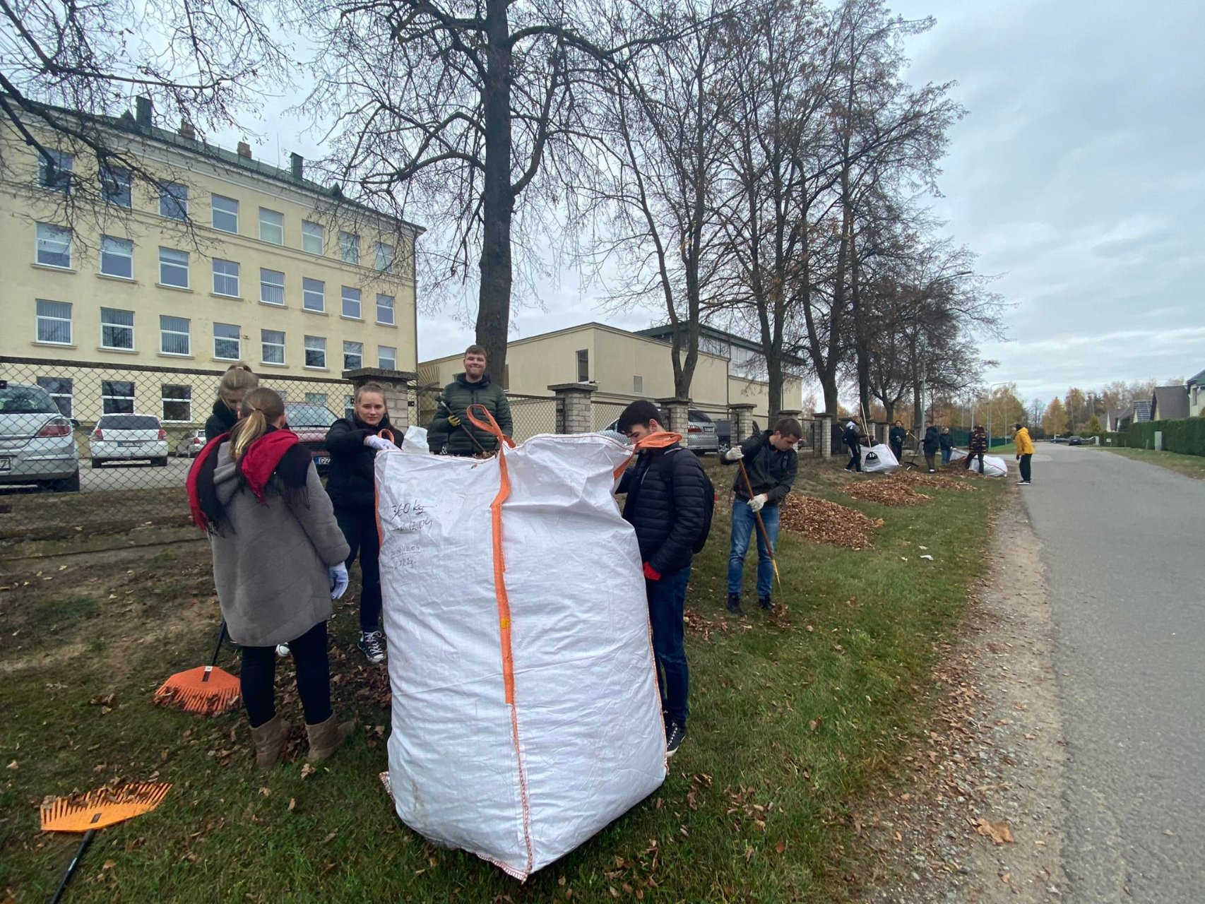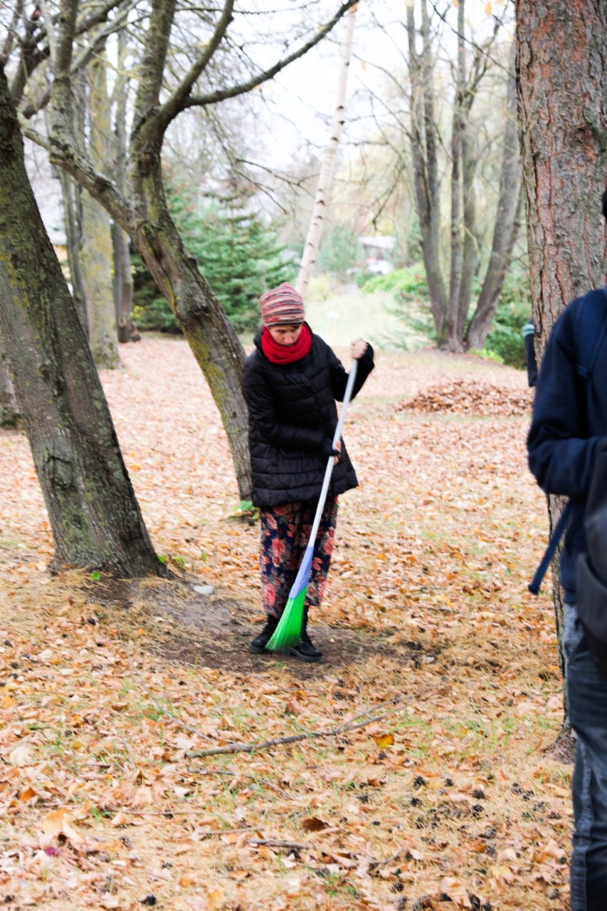 Penktadienio popietę muzikos garsai viliojo išeiti į lauką, o kad greičiau gautume pasmaguriauti gardžių blynų, turėjome visi kartu susitelkti ir smagiai padirbėti. Gimnazijos bendruomenė ir šį sykį uoliai darbavosi grėbdama lapus: vieni gražino gimnazijos sodą, o kiti švarino už tvoros esančią teritoriją. Visi plušėjo iš peties. Buvo gražu žiūrėti, kaip jauni žmonės švytruoja grėbliais, dirbdami šnekučiuojasi, rikiuoja kupinus lapų maišus. Gera visiems kartu pajusti bendrystę! Ech, tas ruduo, maloniai vėsu ir nuo užsidegusios klevo viršūnės tyliai leidžiasi auksiniai lapai... Nepaprastai mielas reginys... Bet pasidžiaugėme ir reikia susitvarkyti. Tokia gyvenimo proza.