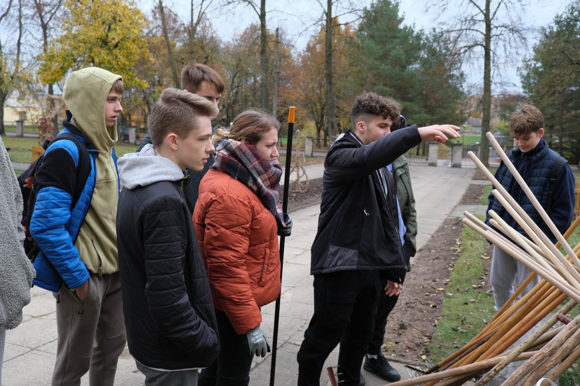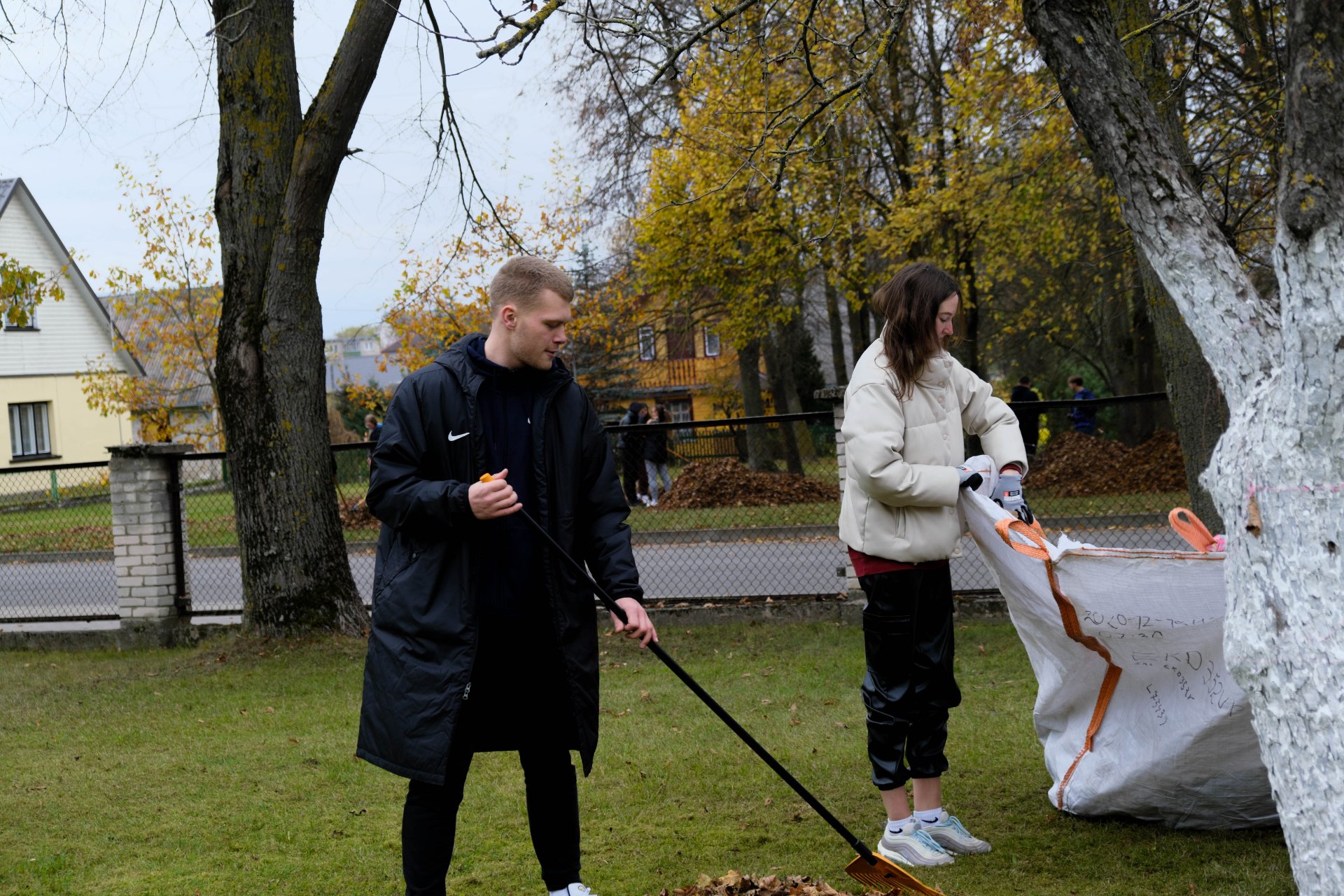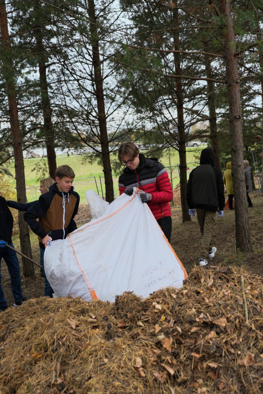 Penktadienio popietę muzikos garsai viliojo išeiti į lauką, o kad greičiau gautume pasmaguriauti gardžių blynų, turėjome visi kartu susitelkti ir smagiai padirbėti. Gimnazijos bendruomenė ir šį sykį uoliai darbavosi grėbdama lapus: vieni gražino gimnazijos sodą, o kiti švarino už tvoros esančią teritoriją. Visi plušėjo iš peties. Buvo gražu žiūrėti, kaip jauni žmonės švytruoja grėbliais, dirbdami šnekučiuojasi, rikiuoja kupinus lapų maišus. Gera visiems kartu pajusti bendrystę! Ech, tas ruduo, maloniai vėsu ir nuo užsidegusios klevo viršūnės tyliai leidžiasi auksiniai lapai... Nepaprastai mielas reginys... Bet pasidžiaugėme ir reikia susitvarkyti. Tokia gyvenimo proza.