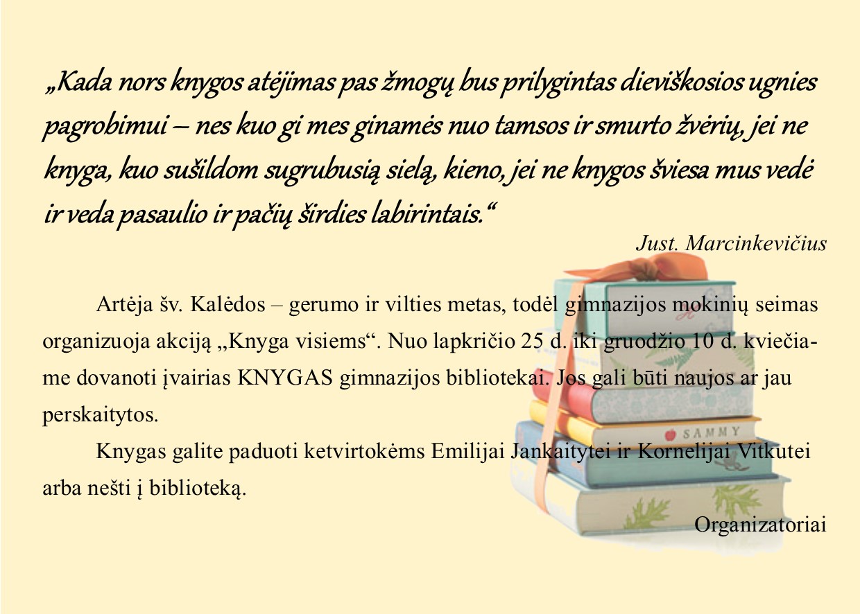 Mielieji mūsų gimnazistai, laukiame jūsų kūrybos ir tikimės gražaus bendradarbiavimo. Artėja šv. Kalėdos, galbūt mokytojos paskatins.