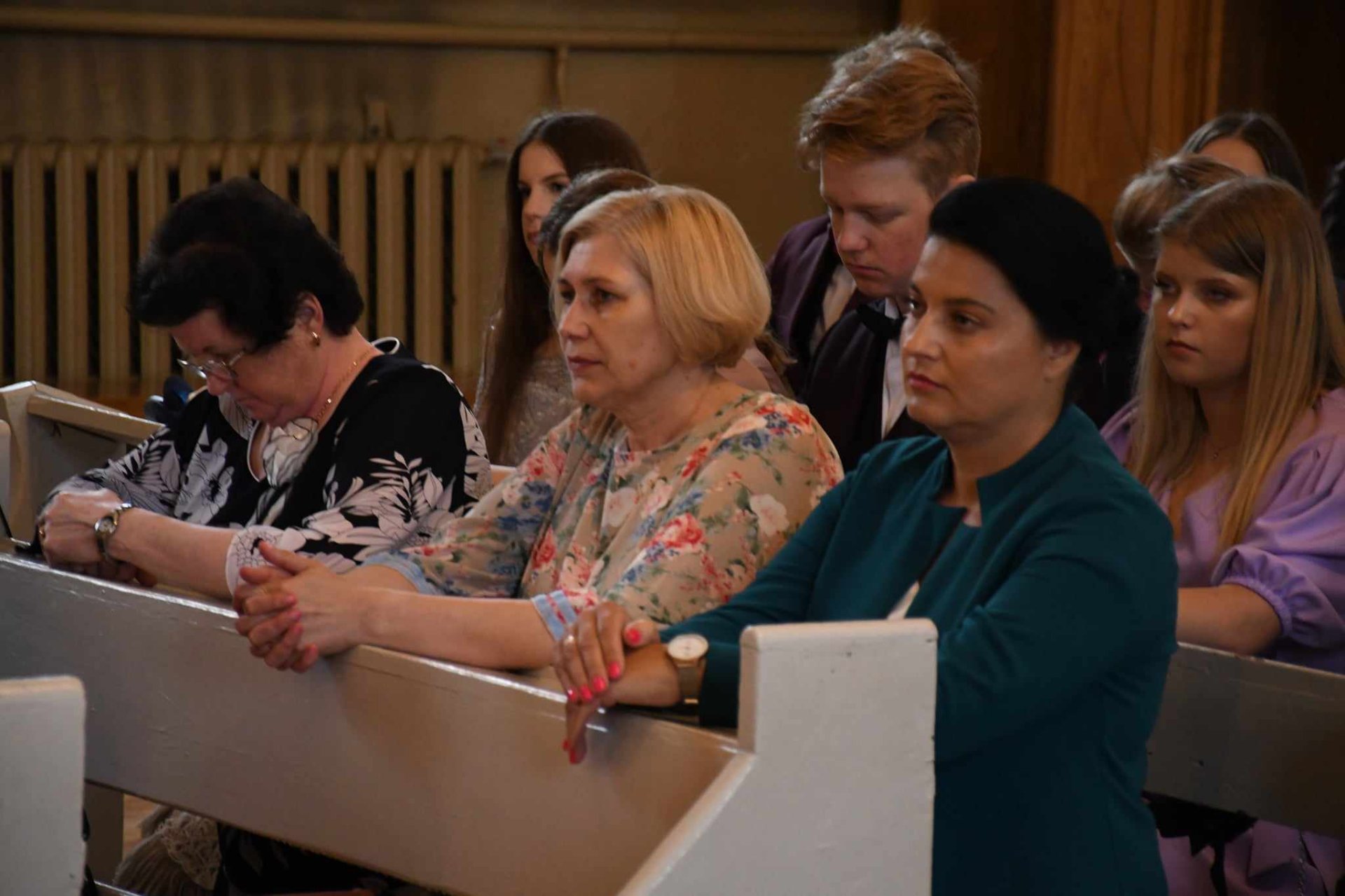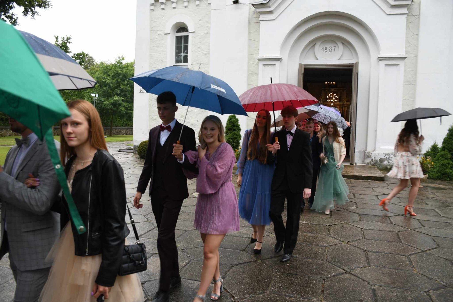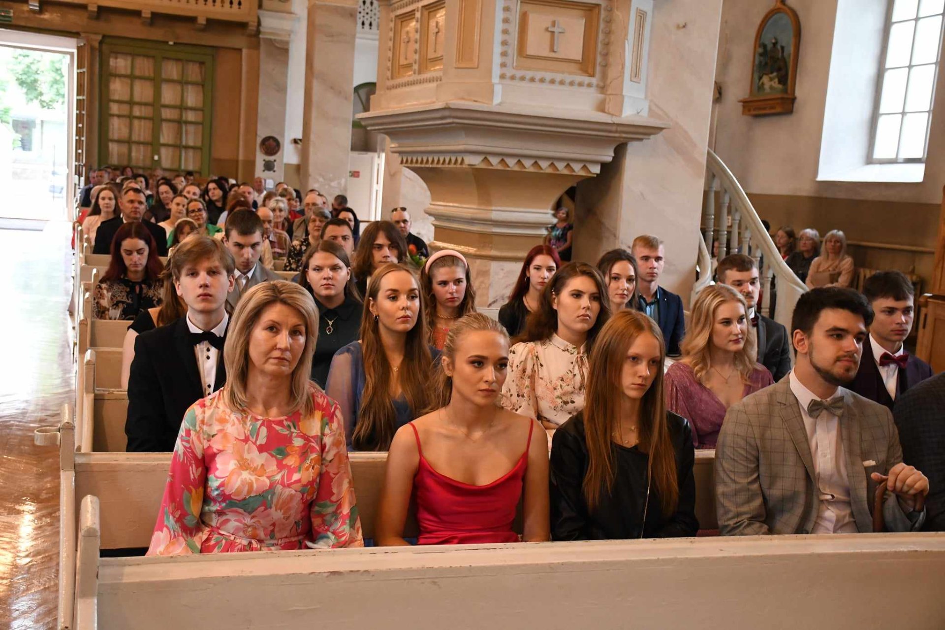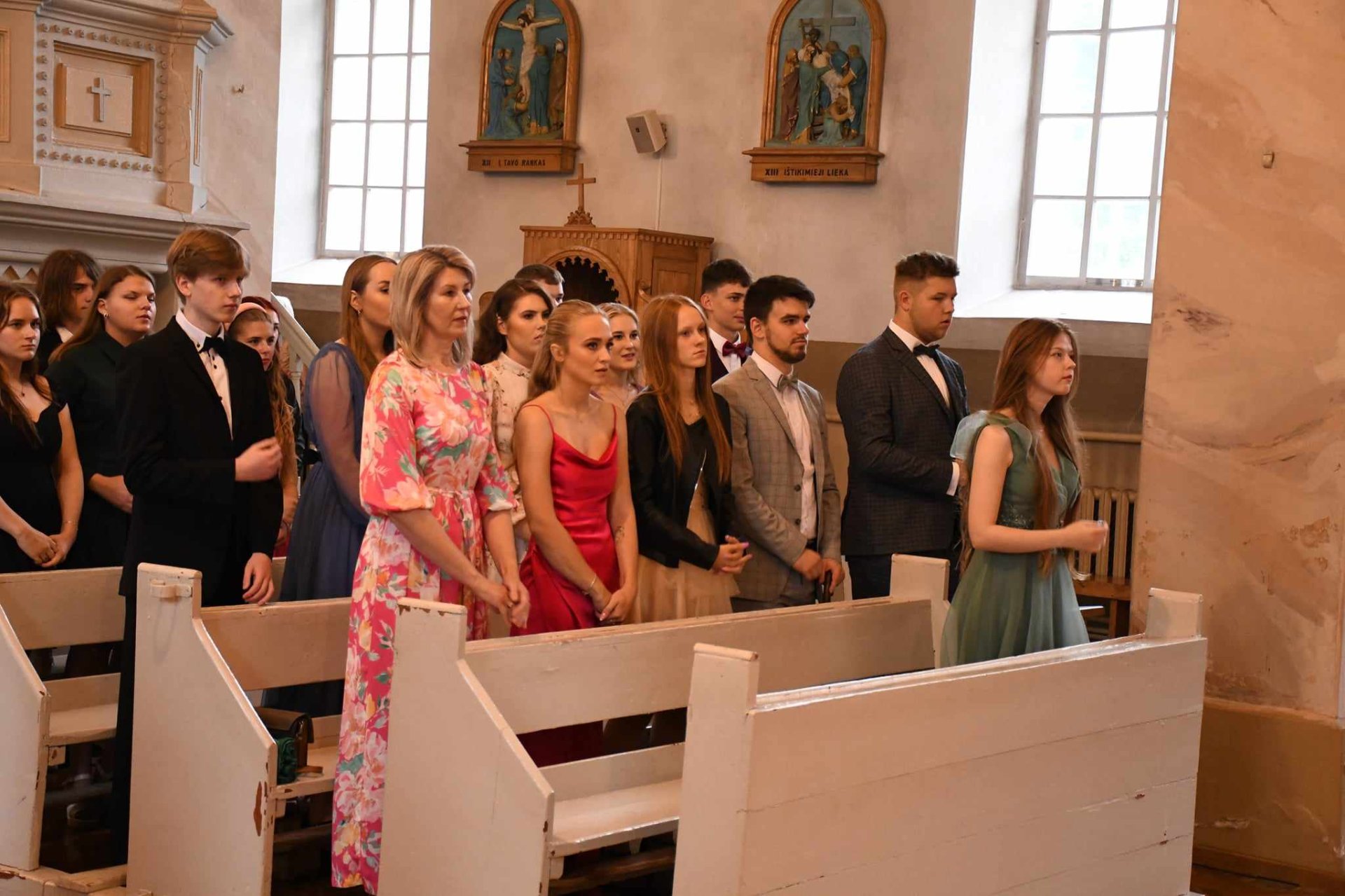 Kiek vėliau abiturientai, lydimi auklėtojų, įsikibę vienas kitam į parankę, patraukė į Pakruojo Šv. Jono Krikštytojo bažnyčią dalyvauti šv. Mišiose. Pakruojo dekanas, klebonas, kunigas Remigijus Čekavičius pasveikino abiturientus, gimnazijos direktorę, administraciją, mokytojus, abiturientų tėvelius, rajono valdžios atstovus, politikus, svečius, parapijiečius. Dekanas drąsino jaunus žmones, kalbėjo apie gėrį ir blogį, derliaus tiesioginę ir perkeltinę prasmę, palaimino abiturientų tolimesnį gyvenimo kelią.