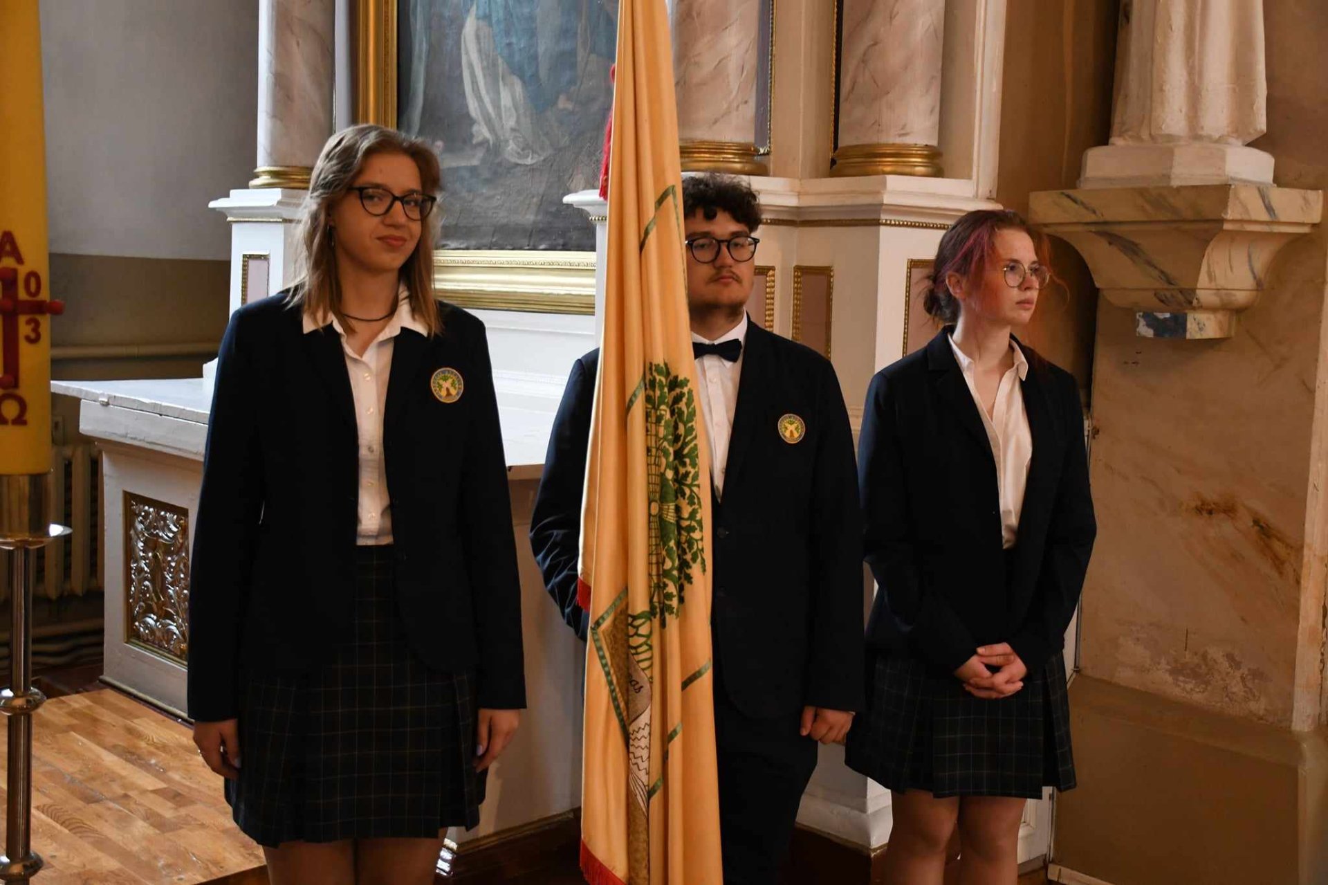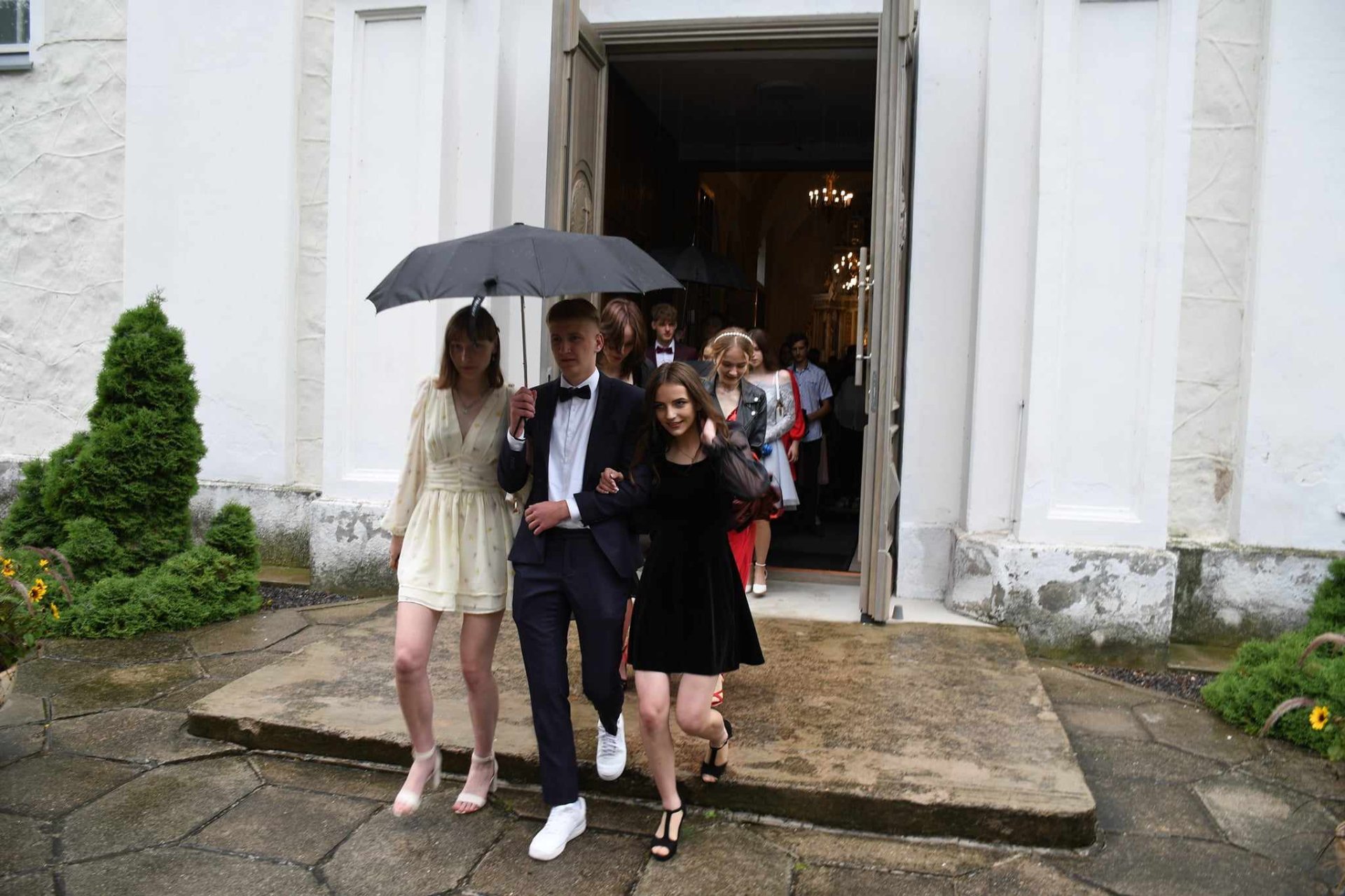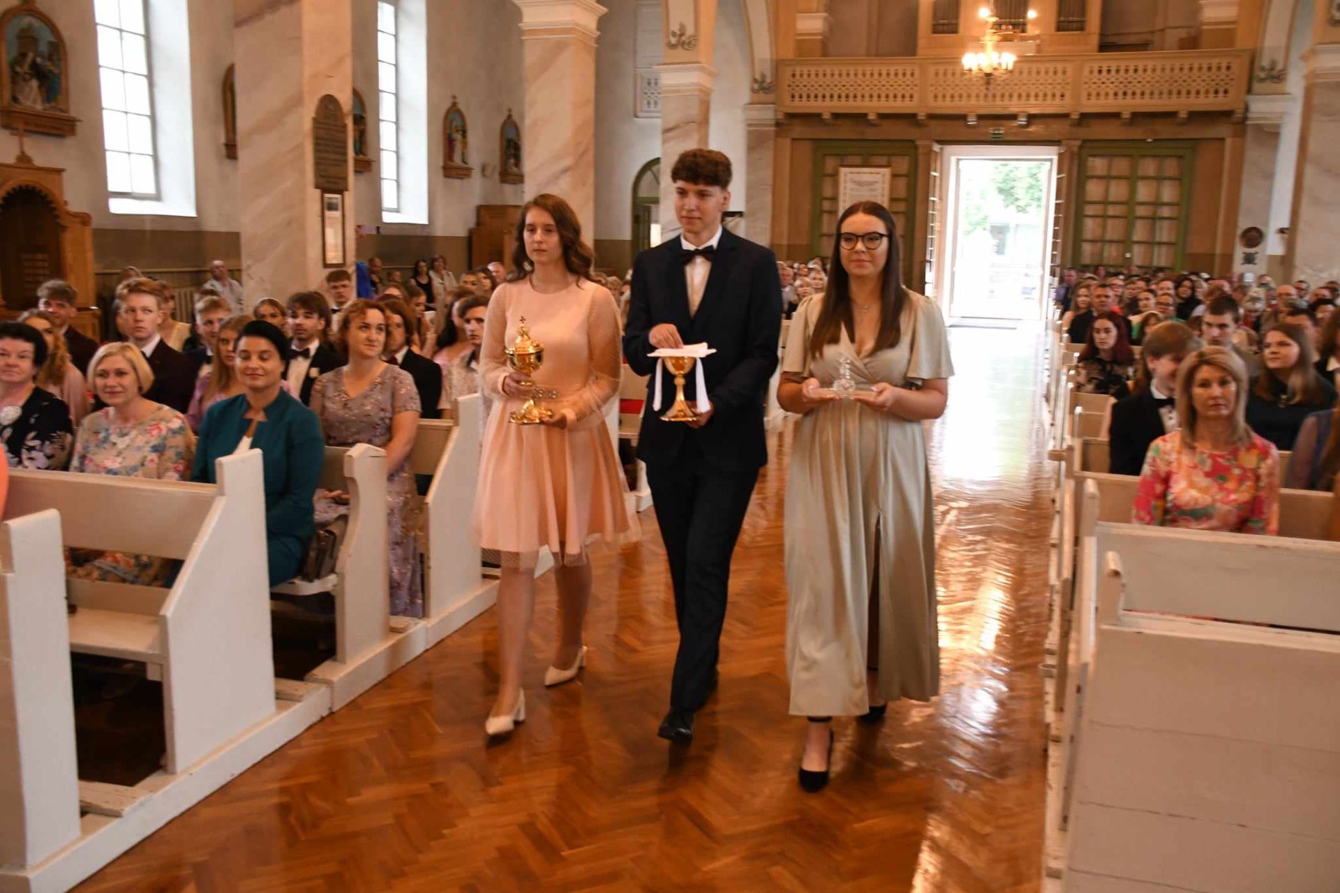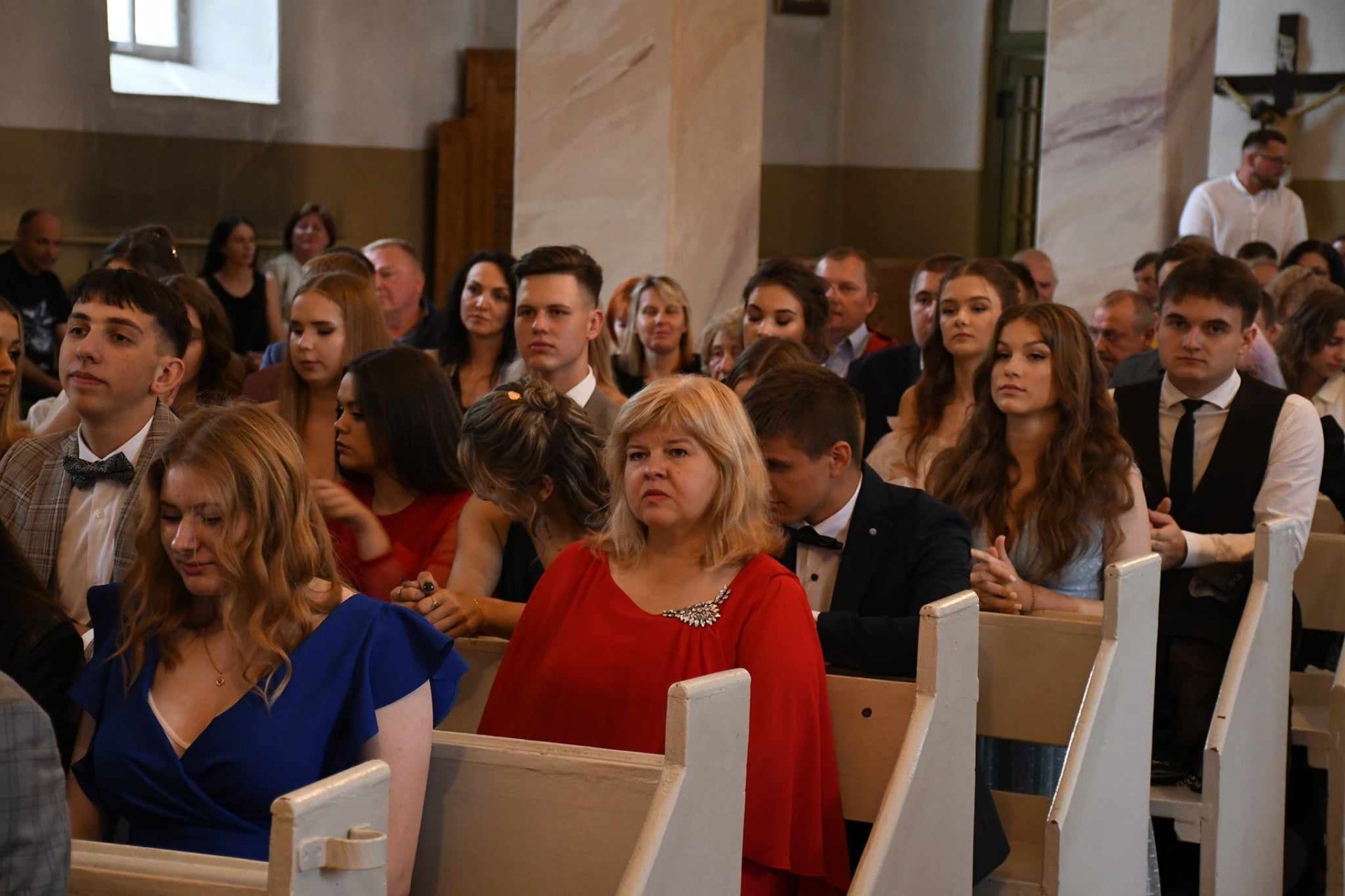 Kiek vėliau abiturientai, lydimi auklėtojų, įsikibę vienas kitam į parankę, patraukė į Pakruojo Šv. Jono Krikštytojo bažnyčią dalyvauti šv. Mišiose. Pakruojo dekanas, klebonas, kunigas Remigijus Čekavičius pasveikino abiturientus, gimnazijos direktorę, administraciją, mokytojus, abiturientų tėvelius, rajono valdžios atstovus, politikus, svečius, parapijiečius. Dekanas drąsino jaunus žmones, kalbėjo apie gėrį ir blogį, derliaus tiesioginę ir perkeltinę prasmę, palaimino abiturientų tolimesnį gyvenimo kelią.