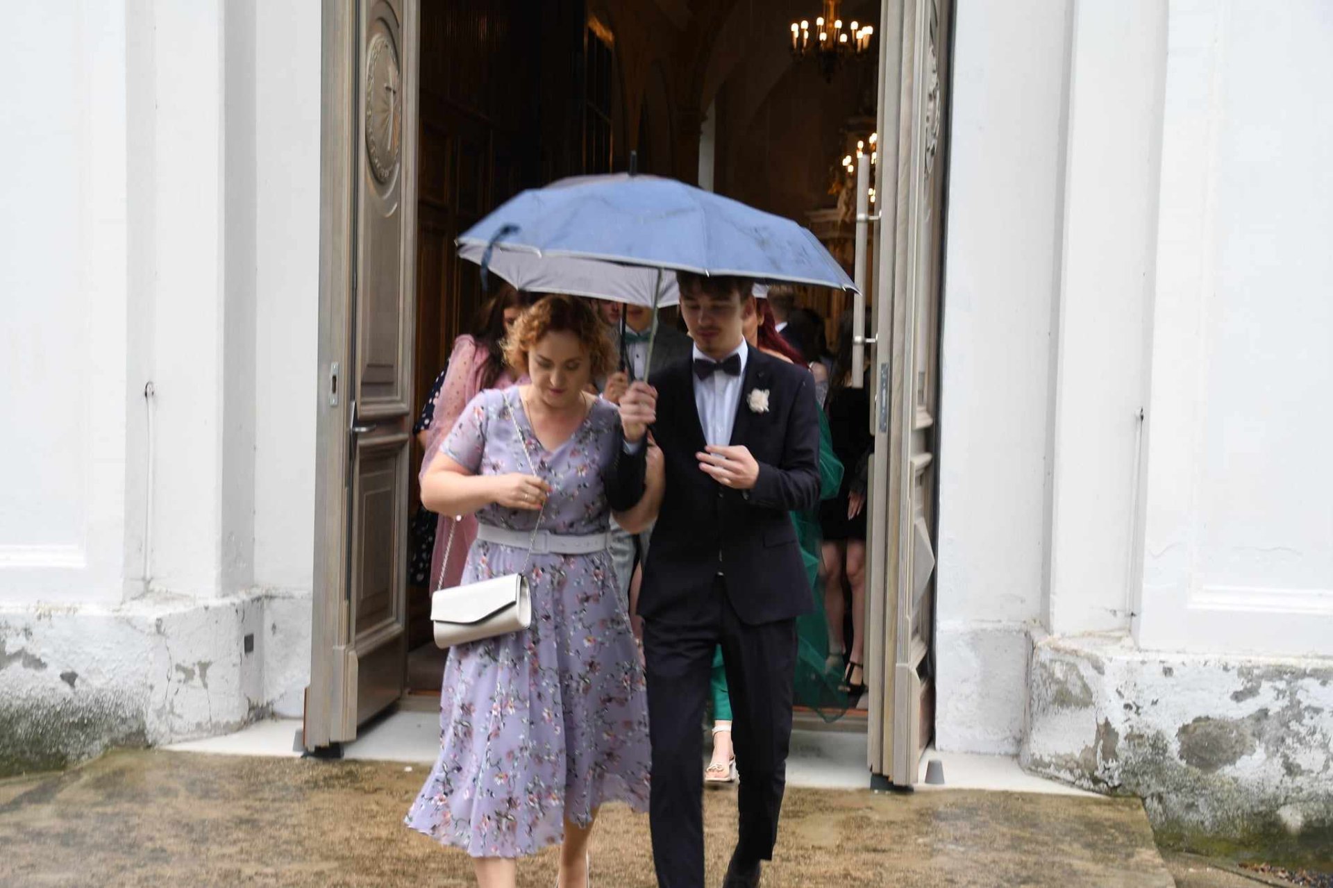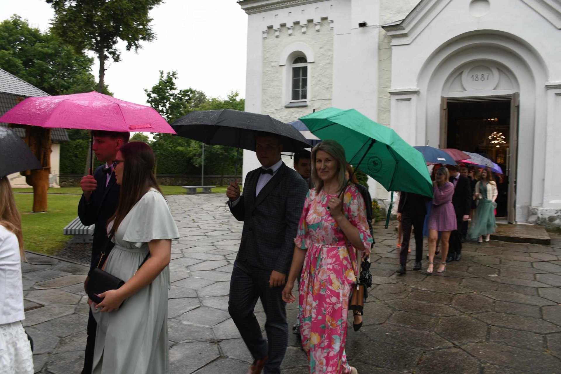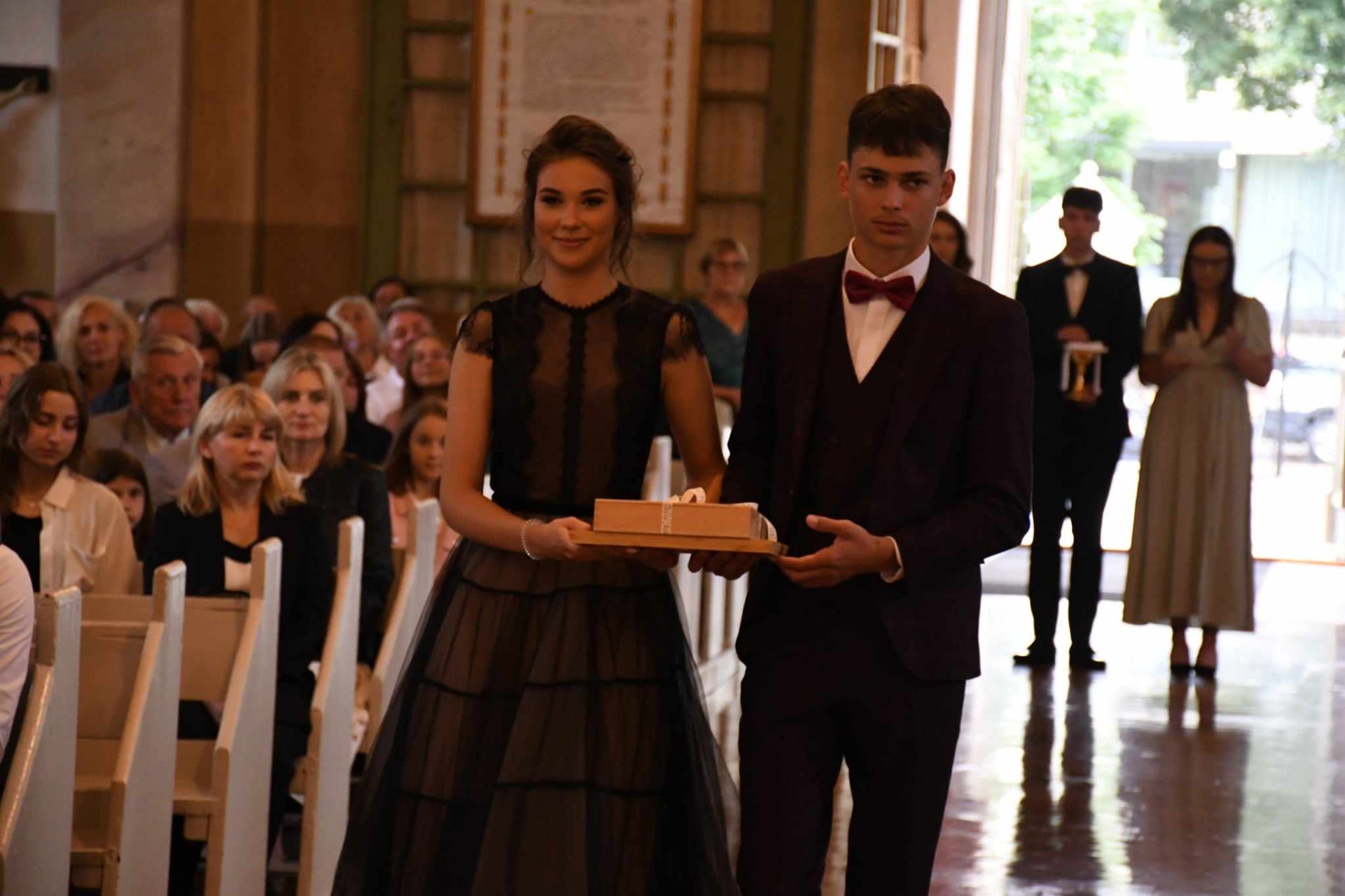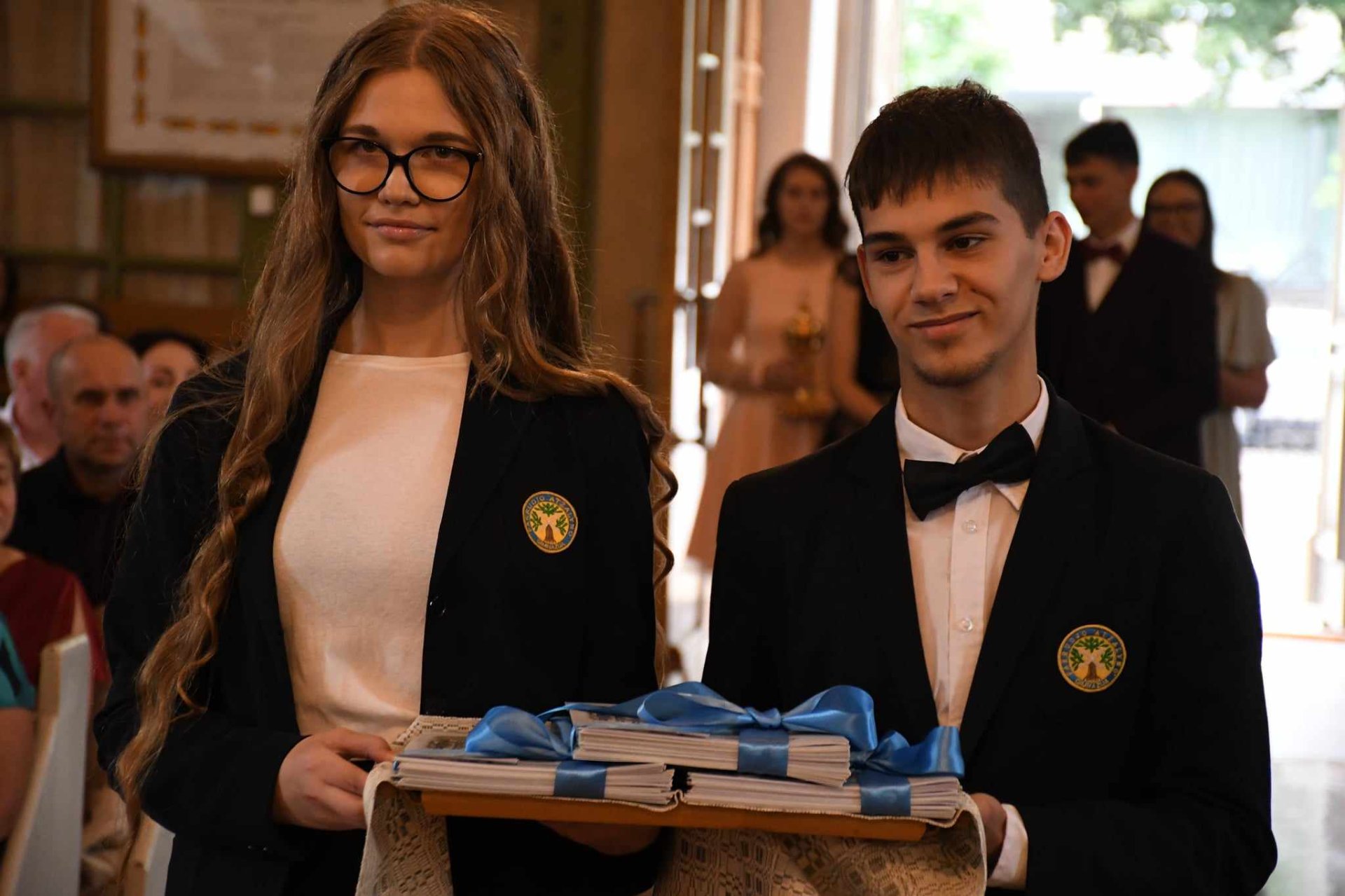 Kiek vėliau abiturientai, lydimi auklėtojų, įsikibę vienas kitam į parankę, patraukė į Pakruojo Šv. Jono Krikštytojo bažnyčią dalyvauti šv. Mišiose. Pakruojo dekanas, klebonas, kunigas Remigijus Čekavičius pasveikino abiturientus, gimnazijos direktorę, administraciją, mokytojus, abiturientų tėvelius, rajono valdžios atstovus, politikus, svečius, parapijiečius. Dekanas drąsino jaunus žmones, kalbėjo apie gėrį ir blogį, derliaus tiesioginę ir perkeltinę prasmę, palaimino abiturientų tolimesnį gyvenimo kelią.