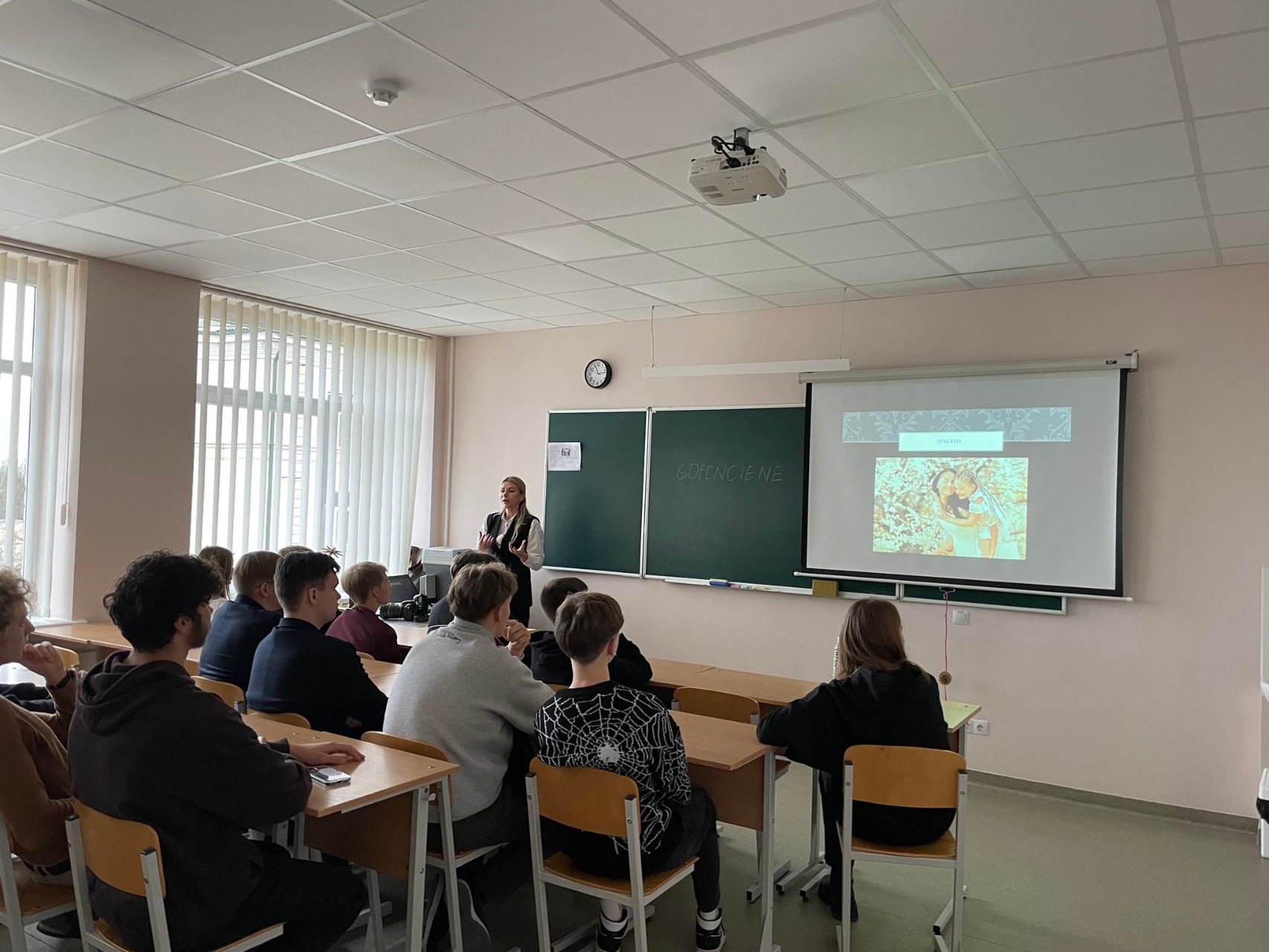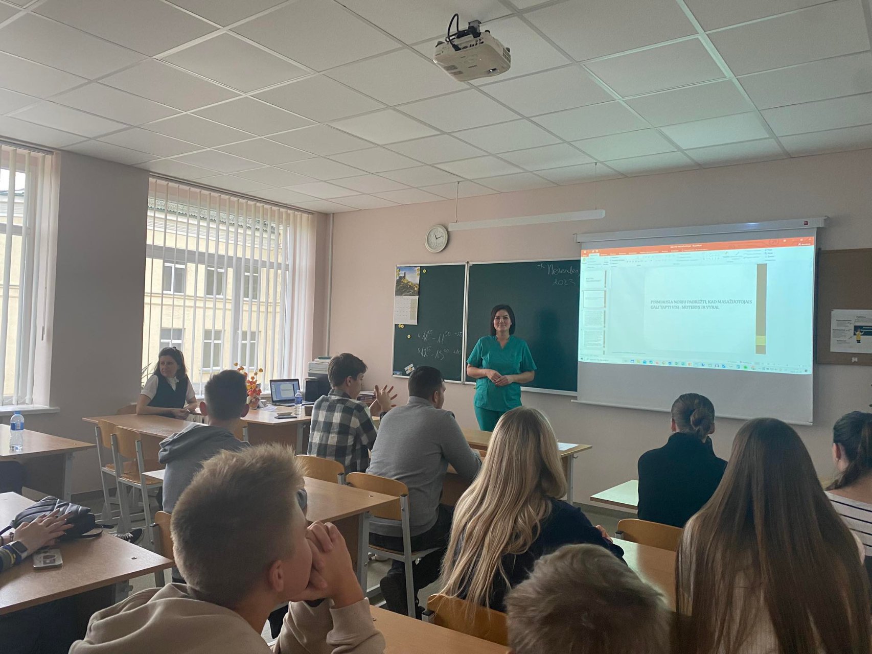 UAB „Eurovaistinė“ vaistininkė-farmacininkė KAROLINA GIRDZIJAUSKIENĖ pasakojo apie savo darbo pobūdį. Gimnazistams patiko pateikiamos medžiagos informatyvumas ir mokėjimas sudominti. Mokiniai sužinojo daug naudingų dalykų apie studijas, suprato, ką reiškia teiginys, kad mokslo šaknys karčios, o vaisiai saldūs.