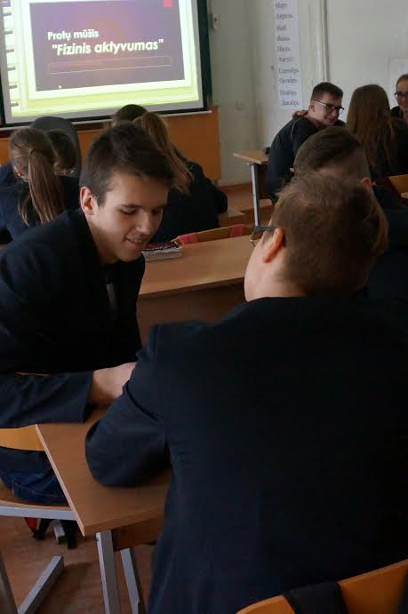 Prasidėjus „Mankštiados“ semestrui nusprendėme patreniruoti ir smegenis. Pirmokai gimnazistai noriai susirinko į protmūšį „Fizinis aktyvumas“. Susiskirstę į penkias komandas mokiniai aktyviai atsakinėjo į pateiktus klausimus. Vieni džiaugėsi pasirinkę teisingą atsakymą, kiti sužinojo ir naujų faktų. Laimėjo komanda „Johni skirmy“.