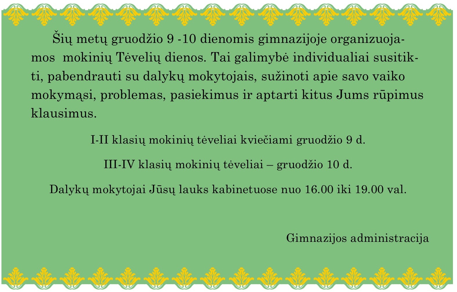 Lapkričio 23 dieną mūsų gimnazijoje lankėsi psichologas, socialinių mokslų daktaras, Kauno jaunimo mokyklos direktorius Tomas Lagūnavičius. Jis mokiniams skaitė paskaitą ,,Kaip mokiniams mokytis su malonumu: mokėjimo mokytis kompetencijos ugdymas (-is)“. Lektorius papasakojo apie įvairius metodus, kurie padeda susisteminti mokomąją medžiagą, tekste atsirinkti svarbiausią informaciją, patarė, kaip lengviau mokytis užsienio kalbos, kas geriau padėtų įsiminti knygoje nupieštos iliustracijos elementus, supažindino su pasiruošimo egzaminams metodika. Gimnazistai buvo mokomi formuluoti tikslus, kelti klausimus – problemas, ieškoti alternatyvių sprendimų, naudojant 200 strategijų.