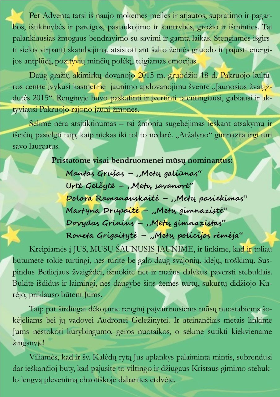 Mokiniams buvo įdomu dalyvauti viktorinoje. Geriausiai išmanančios mūsų regiono etnokultūros papročius ir tradicijas IIa klasės merginos Vykinta Č. ir Neringa L. buvo apdovanotos gimnazijos direktoriaus padėkos raštais, tokie patys apdovanojimai įteikti ir Ia bei Ib klasių mokiniams už šaunų liaudies dainų atlikimą.