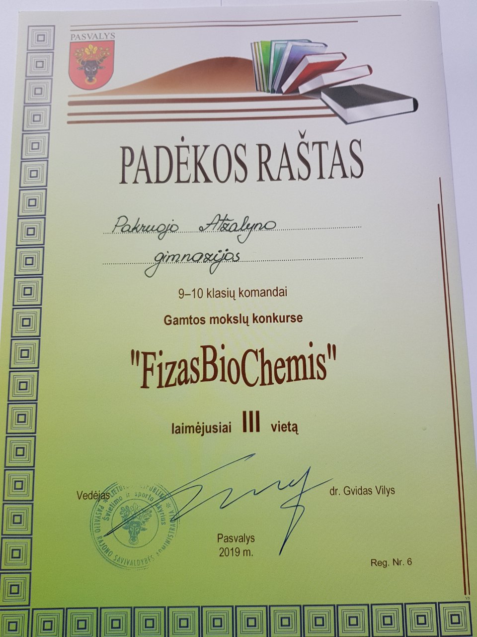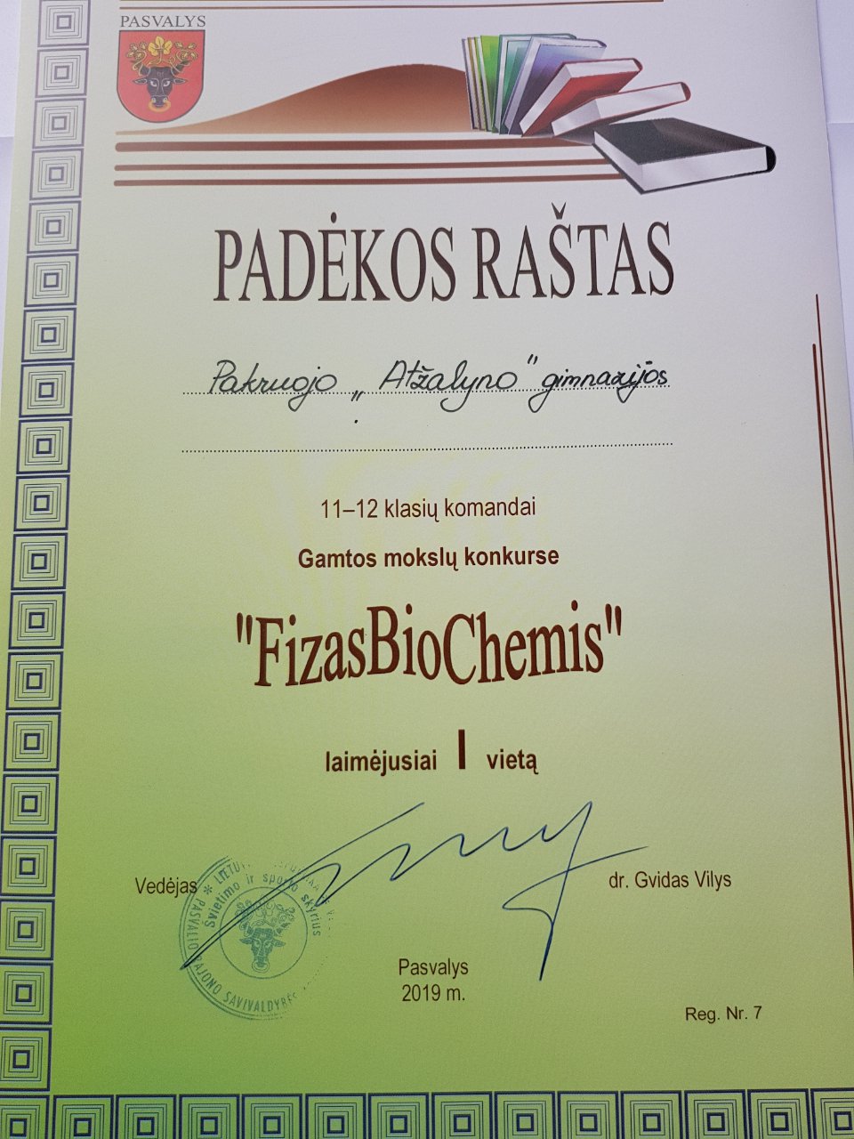 Kovo 15 d. dvi mūsų gimnazistų komandos (mokytojos Daiva Makauskienė, Danutė Stočkūnienė, Vita Gudonienė ir Vida Imanavičiūtė) dalyvavo gamtos mokslų konkurse „FizasBioChemis“, kuris vyko Joniškėlio Gabrielės Petkevičaitės-Bitės gimnazijoje. Mokinius lydėjo pedagogė Danutė Stočkūnienė.