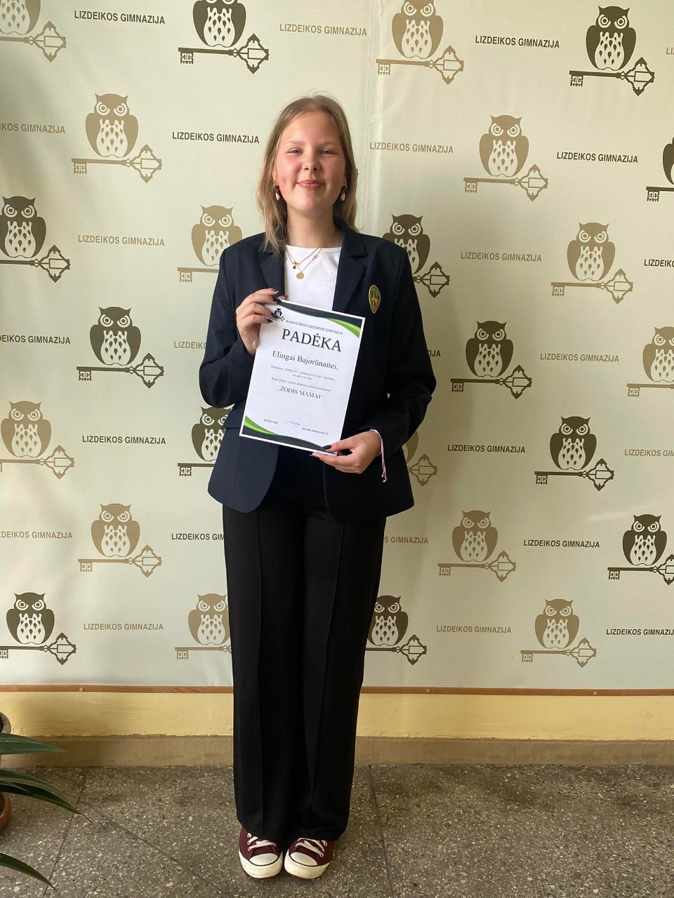 Ne pirmi metai Radviliškio Lizdeikos gimnazijos lietuvių kalbos ir literatūros mokytoja ekspertė Rita Šimkuvienė inicijuoja gražų rašinių konkursą – šiais metais jo tema buvo „ŽODIS MAMAI“. Paskatinta lietuvių kalbos ir literatūros mokytojos metodininkės Romutės Juknevičienės jame dalyvavo ir „Atžalyno“ gimnazijos I a klasės mokinė Elinga Bajorūnaitė. Džiaugiamės, kad mergina panoro sukurti rašinį apie savo mamą. Gimnazistė kartu su mokytoja artėjant Motinos dienai vyko į Radviliškio Lizdeikos gimnaziją, kur buvo sukviesti visi dalyviai ir jų mokytojai. Tradicinėje apdovanojimų šventėje maloniai nudžiugino direktorės Inos Bajarauskaitės ir konkurso iniciatorės, vertinimo komisijos pirmininkės, lietuvių kalbos ir literatūros mokytojos ekspertės Ritos Šimkuvienės dėmesys ir atminimo dovanos, padėkos raštai. Buvo nuoširdžiai pasidžiaugta Elingos iniciatyva dalyvauti Radviliškio rajono mokinių rašinių konkurse. Anot direktorės Inos Bajarauskaitės, mūsų gimnazistės dalyvavimas konkursą padarė net respublikinį. Mokinių darbai sugulė į knygelę, kurioje galima rasti ir Elingos žodį Mamai. Šventė dovanojo daug gražių akimirkų – žavėjo mokinių kompozijos „Dainuok, širdie!“ akimirkos (gimnazistus ruošė teatro mokytoja Rasa Atkočiūnienė), puikiai skambėjo abituriento Roko Mickaus skaitomos romano ištrauka (lietuvių kalbos ir literatūros mokytoja Jurgita Plukienė), širdį virpino lizdeikietės abiturientės Augustinos Motekaitytės atliekamos melodijos.