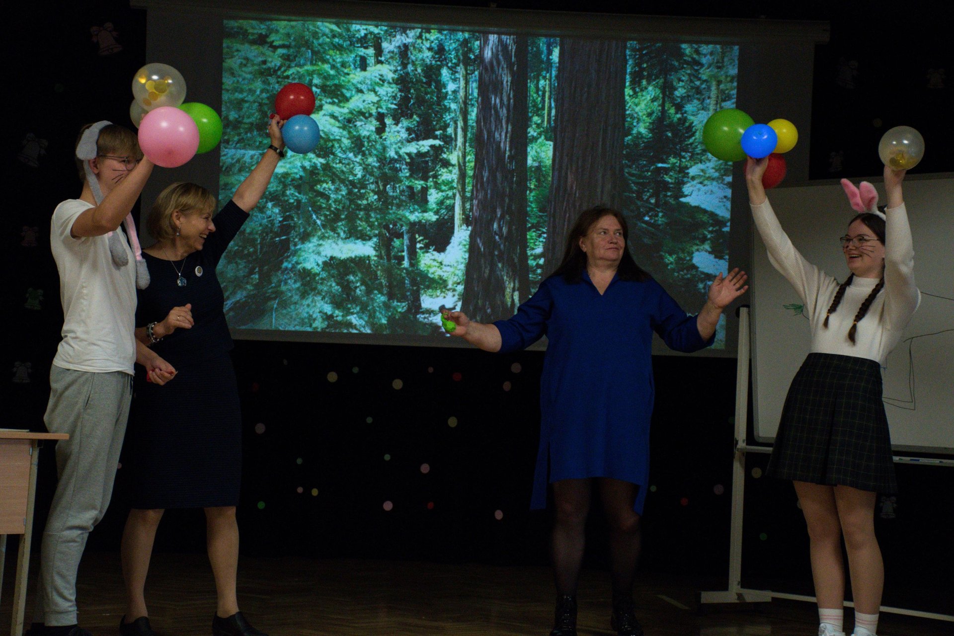 Po trijų pamokų pedagogai rinkosi į aktų salę – „zuikių“ mokyklą. „Zuikienė“ vedė mokytojams keturias pamokas. Fizinio ugdymo mokytojai rideno kopūstus, matematikos - sprendė loginius uždavinius. Per technologijų pamoką užmerktomis akimis reikėjo nupieštam žmogučiui „įdėti“ širdį, o biologijos žinių prireikė norint pripūsti balionus – buvo atliktas praktinis darbas ,,Plaučių tūrio matavimas“. Už puikius pasiekimus „zuikių“ mokyklos direktorius apdovanojo ,,mokinius" morkomis. Muzikinį kūrinį pianinu atliko Kajus. Gimnazijos pirmokai mokytojams padovanojo per technologijų pamokas „išaugintas“ gėles.