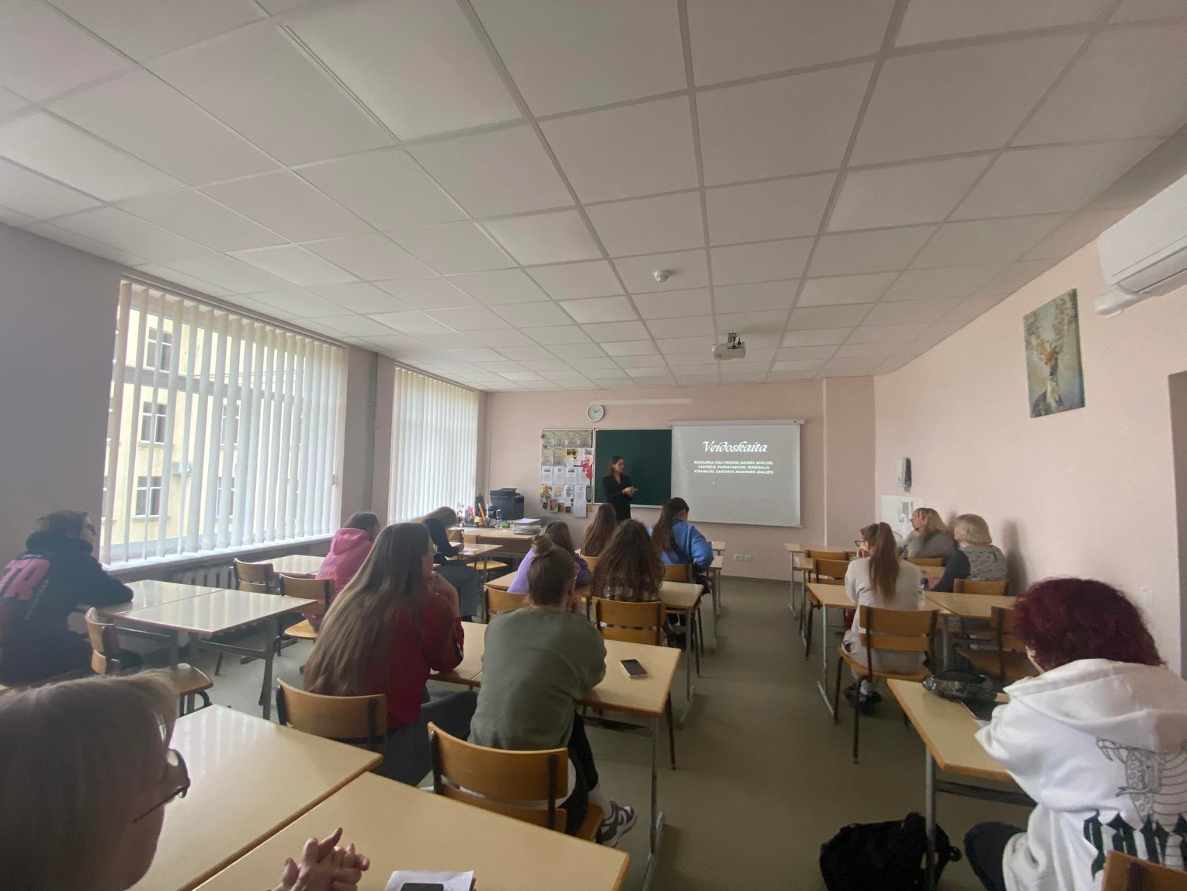 Veidoskaitos specialistė AINA VADAPALAITĖ buvo paruošusi labai kokybiškas pateiktis ir išsamiai stengėsi paaiškinti, kas yra veidoskaita, pateikė pavyzdžių. Mokiniai sužinojo, kad tai nėra tik atskiri veido bruožai, iš kurių galima sužinoti žmogaus charakterį. Būtina išmanyti daug teorijos, reikia daug dalykų susieti į vieną. Šios srities specialistams nemažai galimybių atsiveria užsienyje, veidoskaitininkus samdo įmonių, pardavimų vadovai, tai individuali veikla.