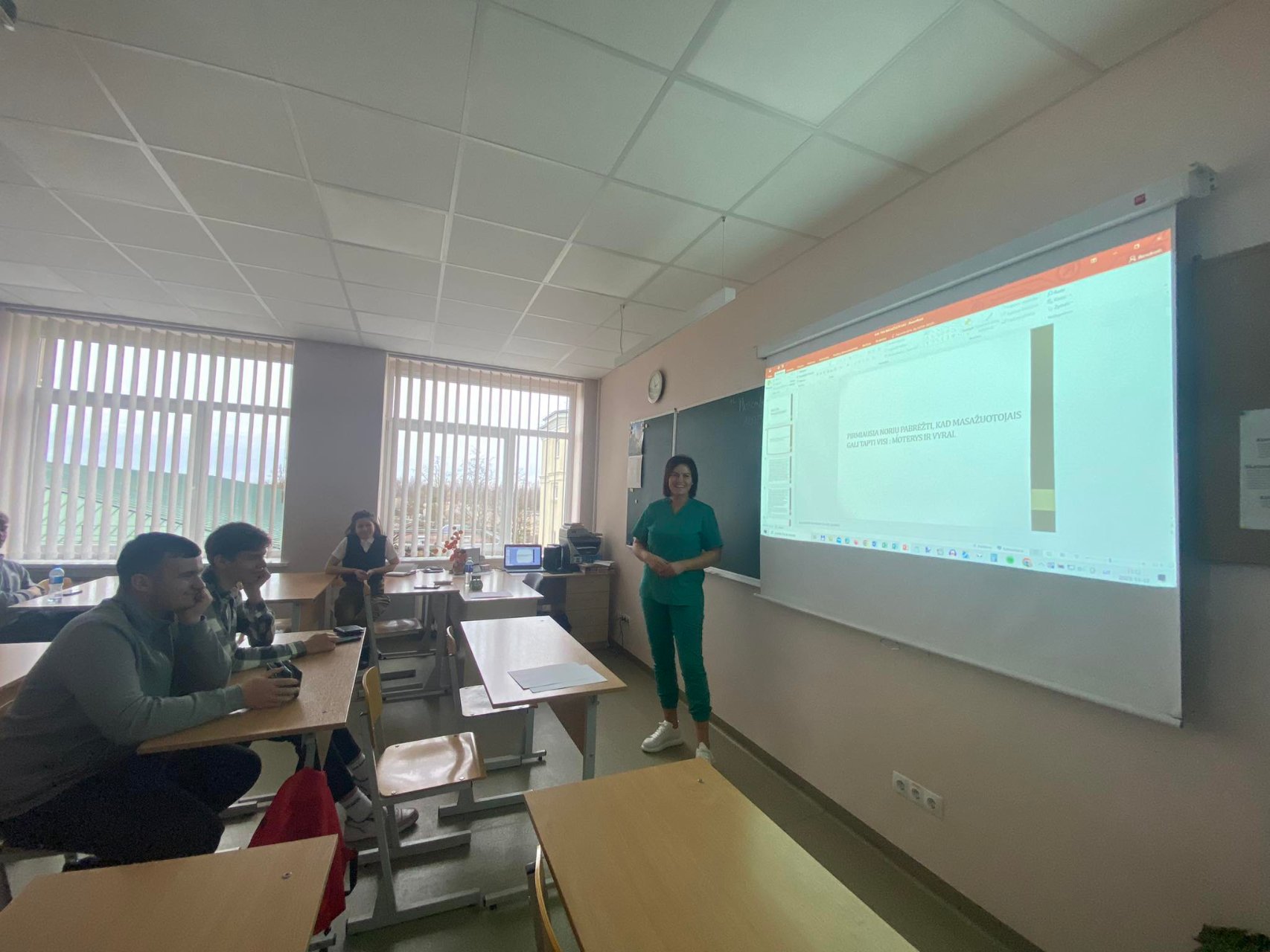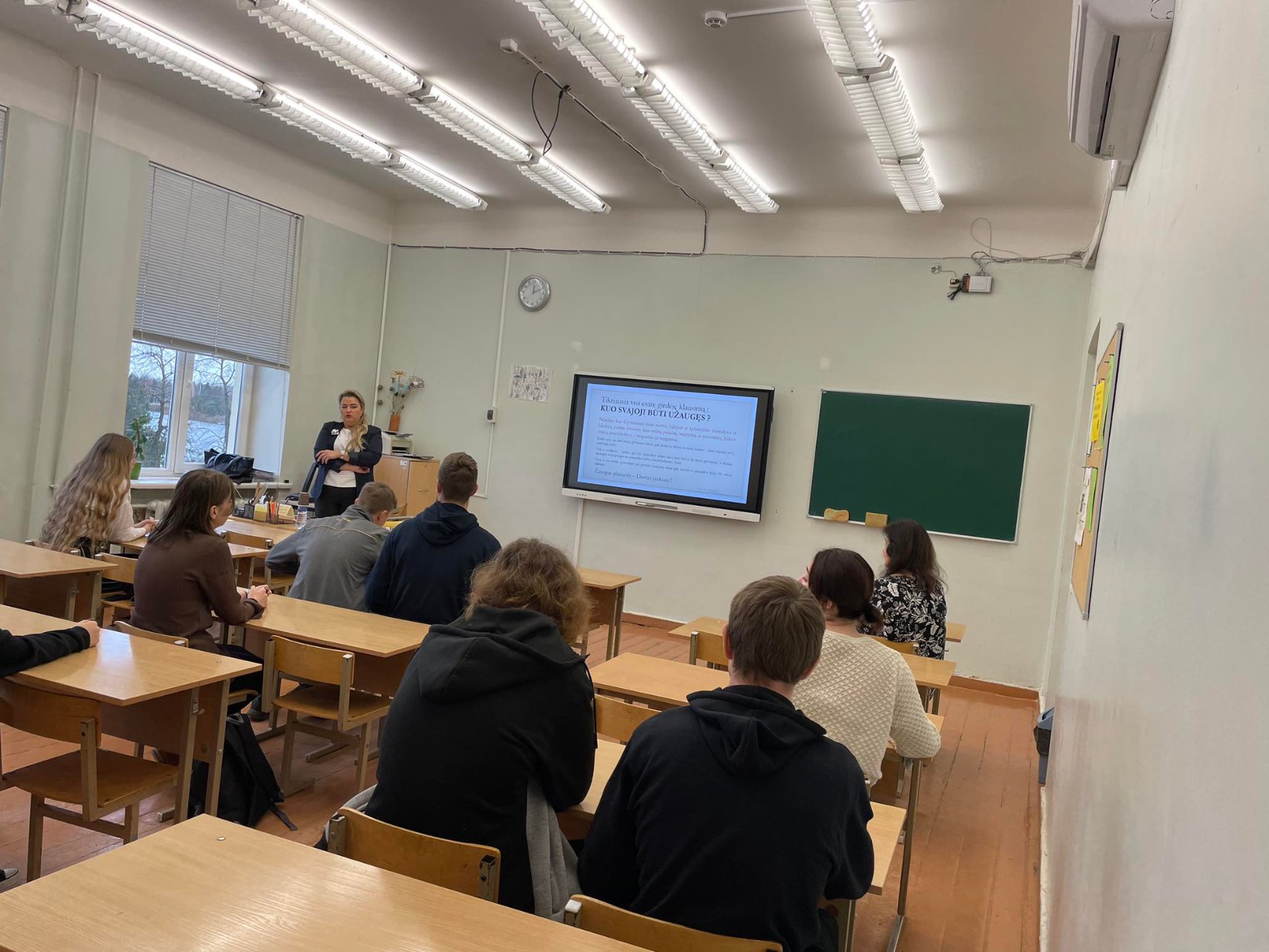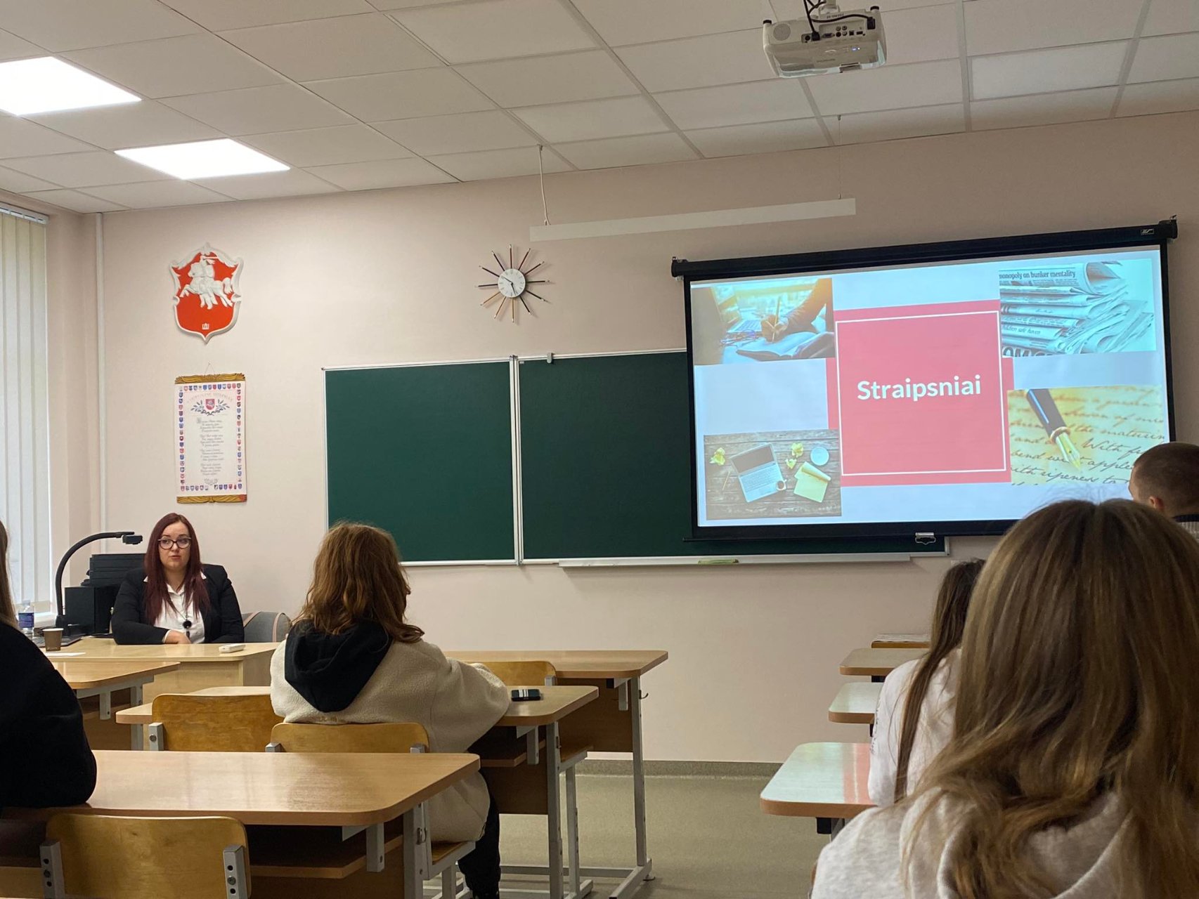UAB „Eurovaistinė“ vaistininkė-farmacininkė KAROLINA GIRDZIJAUSKIENĖ pasakojo apie savo darbo pobūdį. Gimnazistams patiko pateikiamos medžiagos informatyvumas ir mokėjimas sudominti. Mokiniai sužinojo daug naudingų dalykų apie studijas, suprato, ką reiškia teiginys, kad mokslo šaknys karčios, o vaisiai saldūs.