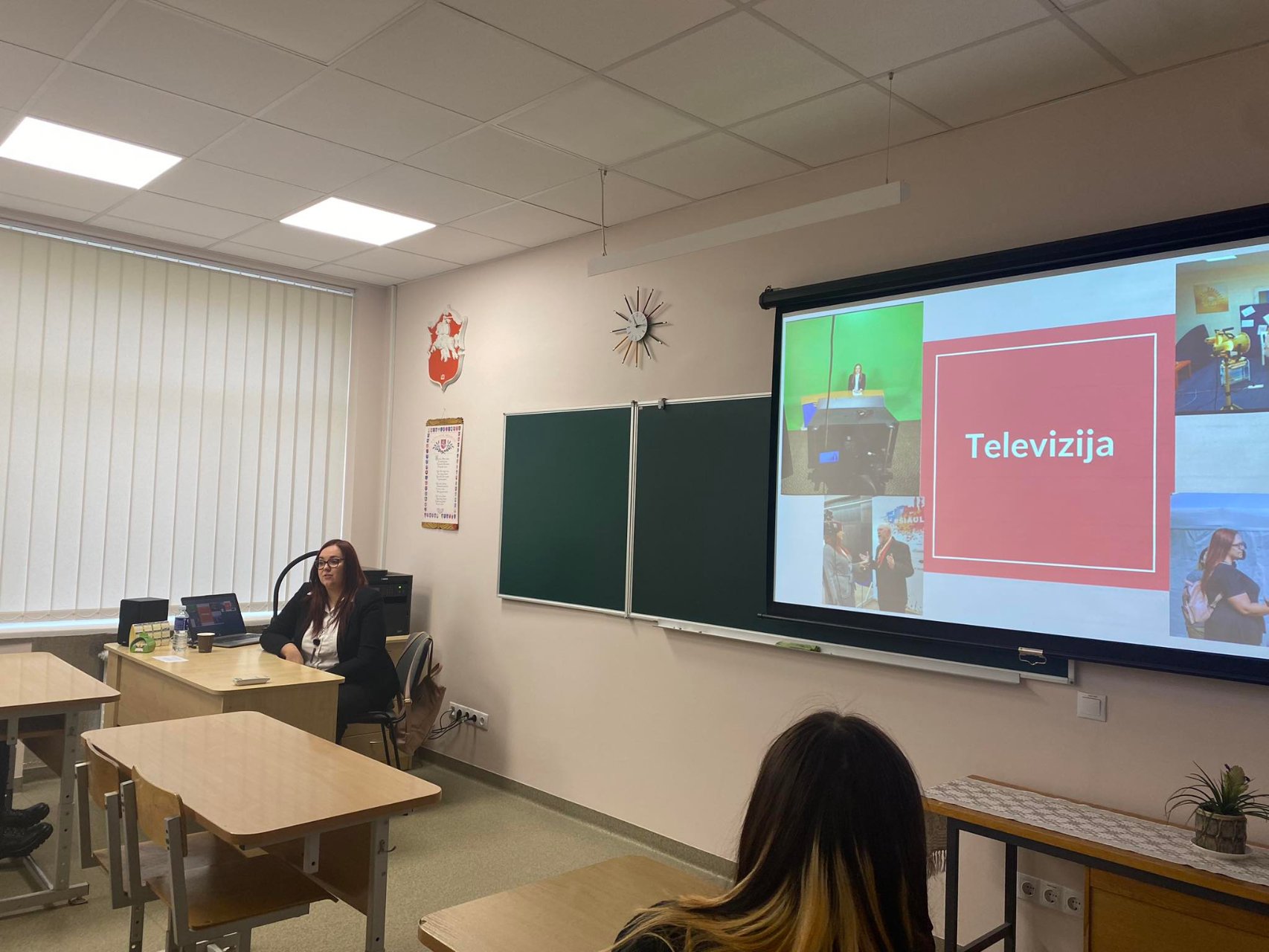 EVELINA MAŽEIKIENĖ, dirbanti programų ir žinių tarnybos vadove UAB „Šiaulių televizija“ ir radijo laidų vedėja UAB „Saulės radijas“ supažindino jaunus žmones su savo darbo ypatumais, atvėrė duris į paslaptingą žurnalisto kasdienybę, apie kurią nesusimąstome. Evelina pasidalijo, su kokiais iššūkiais tenka susidurti, papasakojo ir šmaikščių istorijų, atsakė į klausimus. Be to, kvietė rinktis operatoriaus darbą, nes Lietuvoje tokios srities specialistų labai trūksta. Beje, maloniai pakvietė atvykti į studiją. Gyvenime, anot Evelinos, reikia nebijoti būti savimi ir aktyviai veikti, siekti užsibrėžtų tikslų. Buvo akcentuota, kad darbas nėra nuobodus, aptartos atsakingos veiklos, kurias tenka atlikti. P.S. Evelina rašo straipsnius ir dar jos balsas skamba reklamose...