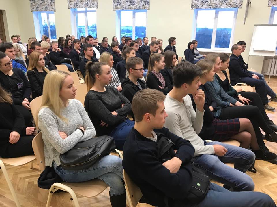 2017-01-10 gimnazistai su gimtosios kalbos ir literatūros mokytojomis rinkosi į konferencijų ir posėdžių salę, kur vyko susitikimas su skaitovu Raimundu Lukšu.