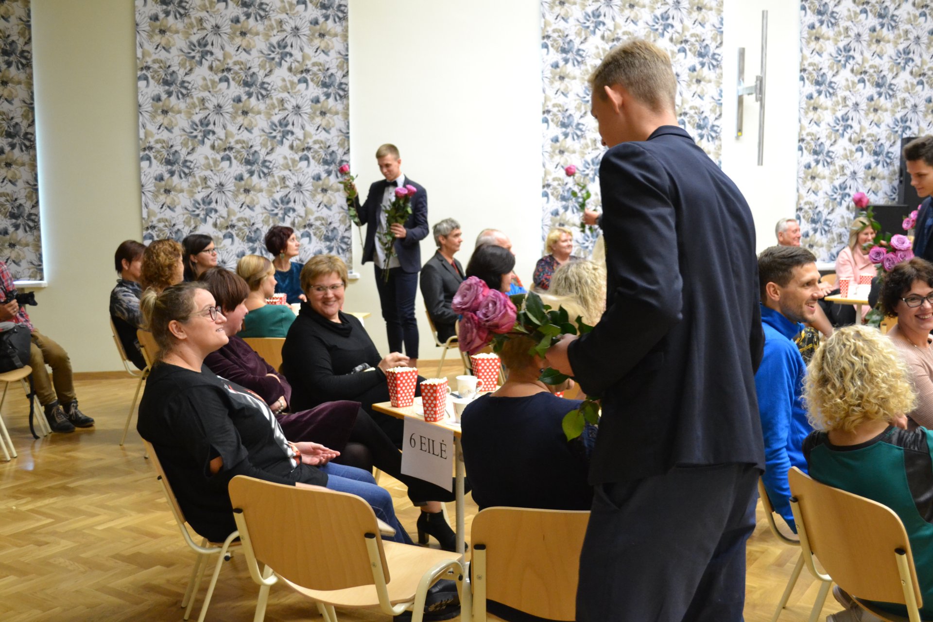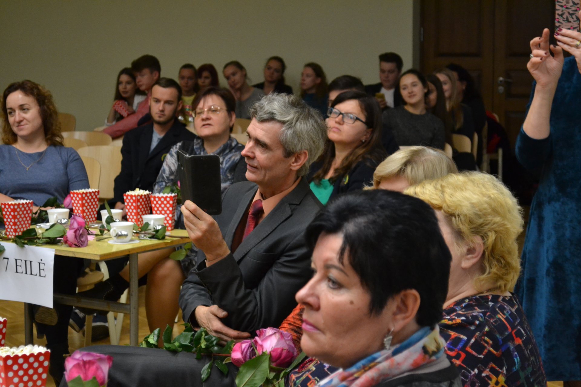 Po 4 pamokų visi pedagogai skubėjo į posėdžių ir konferencijų salę. Išsirinkę mėgstamų kukurūzų spragėsių, jie buvo maloniai palydėti prie biliete nurodytos vietos. Filmą kūrė, galima sakyti, visi gimnazistai, nes vieni dėkojo mokytojams, kiti deklamavo eilėraščius, treti rado įvairių minčių, kurių pirmosios raidės atitiko žodžio MOKYTOJAS raides, buvo ir tokių, kurie dainavo, vaidino. Originalūs vaikų pasveikinimai pedagogus nudžiugino, galbūt net ir nustebino. Po kino filmo peržiūros merginų ansamblis visiems dovanojo skambią dainą. Sveikinimo žodžius tarė abiturientai Dinas ir Titas Majauskai, mokytojų rankose pražydo kvapnūs rožių žiedai, kuriuos įteikė kiti ketvirtokai vaikinai. Vėliau ugdytojai galėjo prie kavos ir arbatos pasišnekučiuoti bei pasivaišinti tortu. Labai tikimės, kad mokytojai džiaugsmingai prisimins šią dieną, į atmintį įsirėš išgyventos emocijos...