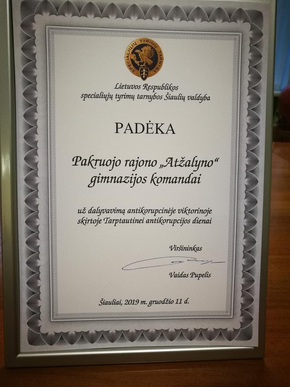 Gruodžio 11 d. „Atžalyno“ mokinių komanda išskubėjo į Pakruojo rajono savivaldybę, kur dalyvavo viktorinoje, skirtoje paminėti Tarptautinę antikorupcijos dieną. Mokiniai pasitikrino žinias apie korupcijos apraiškas ne tik šiais laikais, bet ir tarpukario Lietuvos laikotarpiu, daugiau sužinojo apie STT veiklą. Dalyvius pasveikino Pakruojo rajono savivaldybės administracijos direktorė Ilona Gelažnikienė, mero pavaduotojas Virginijus Kacilevičius, Švietimo skyriaus vedėja Irena Mažulienė. Patirtimi apie darbo ypatumus dalijosi Specialiųjų tyrimų tarnybos Šiaulių valdybos viršininkas Vaidas Pupelis ir STT Šiaulių valdybos Korupcijos prevencijos poskyrio viršininkė Rita Šikšnienė. Anot gimnazistų, tokie renginiai skatina domėtis korupcijos prevencija.