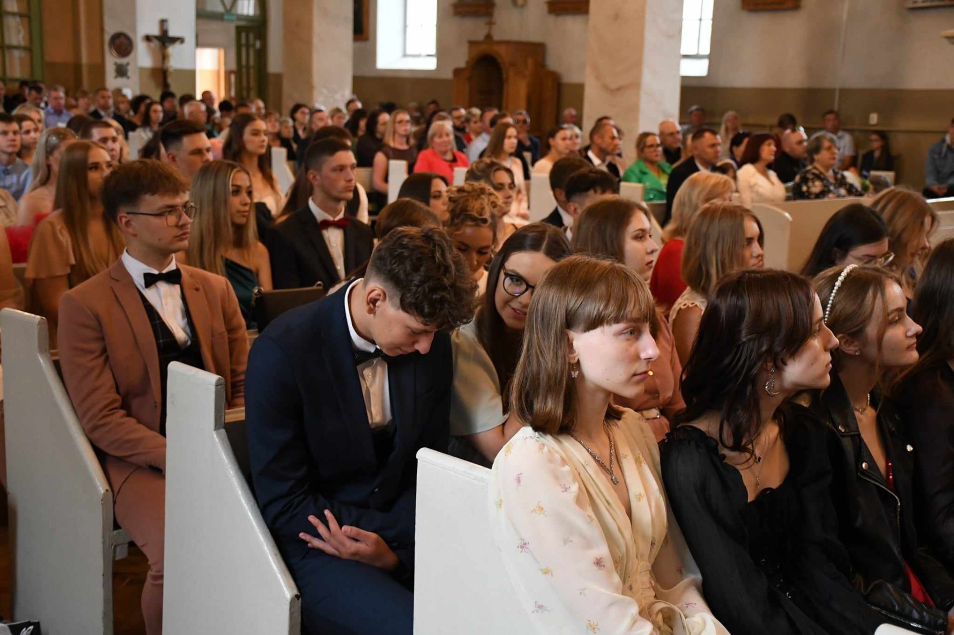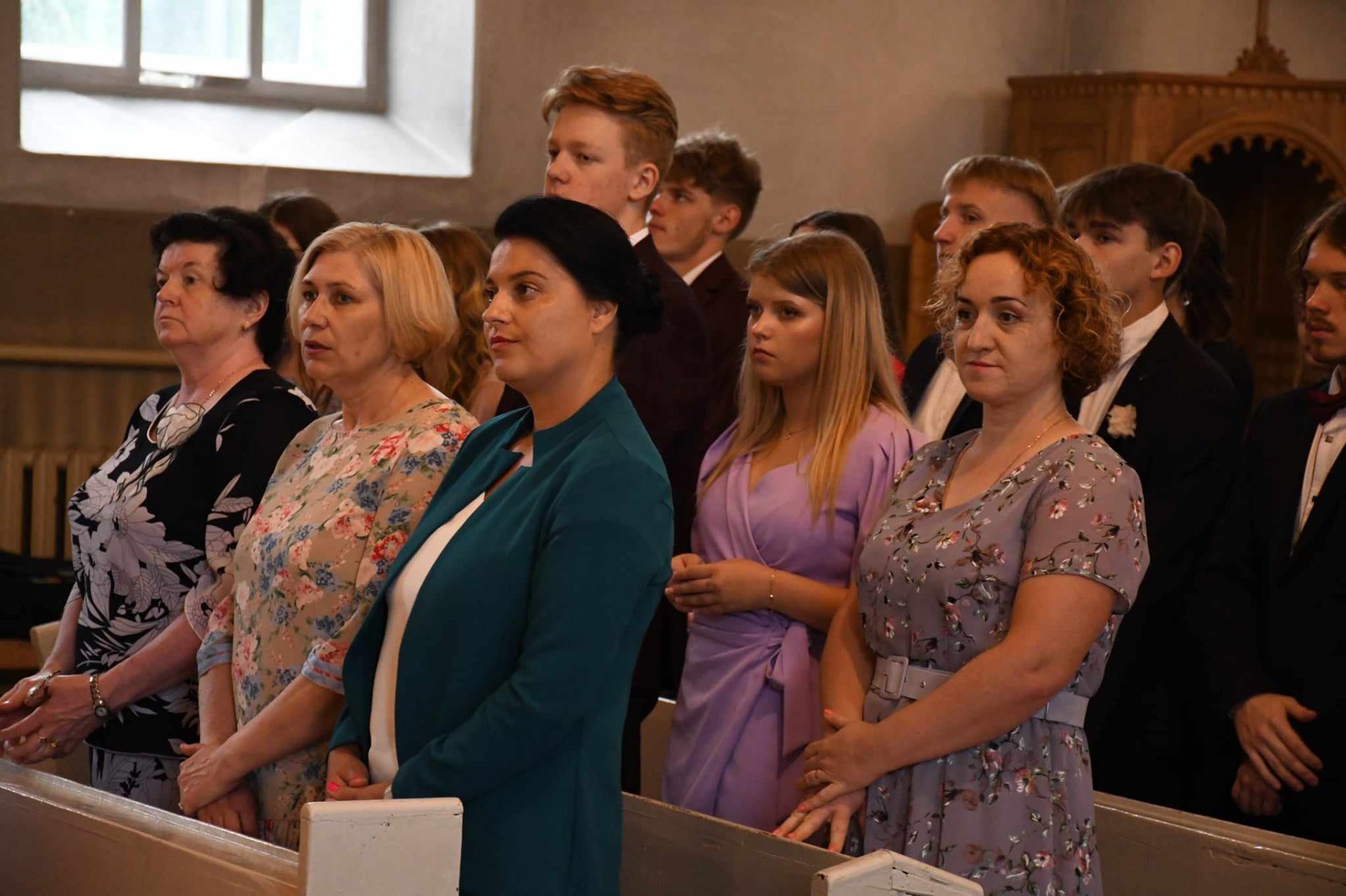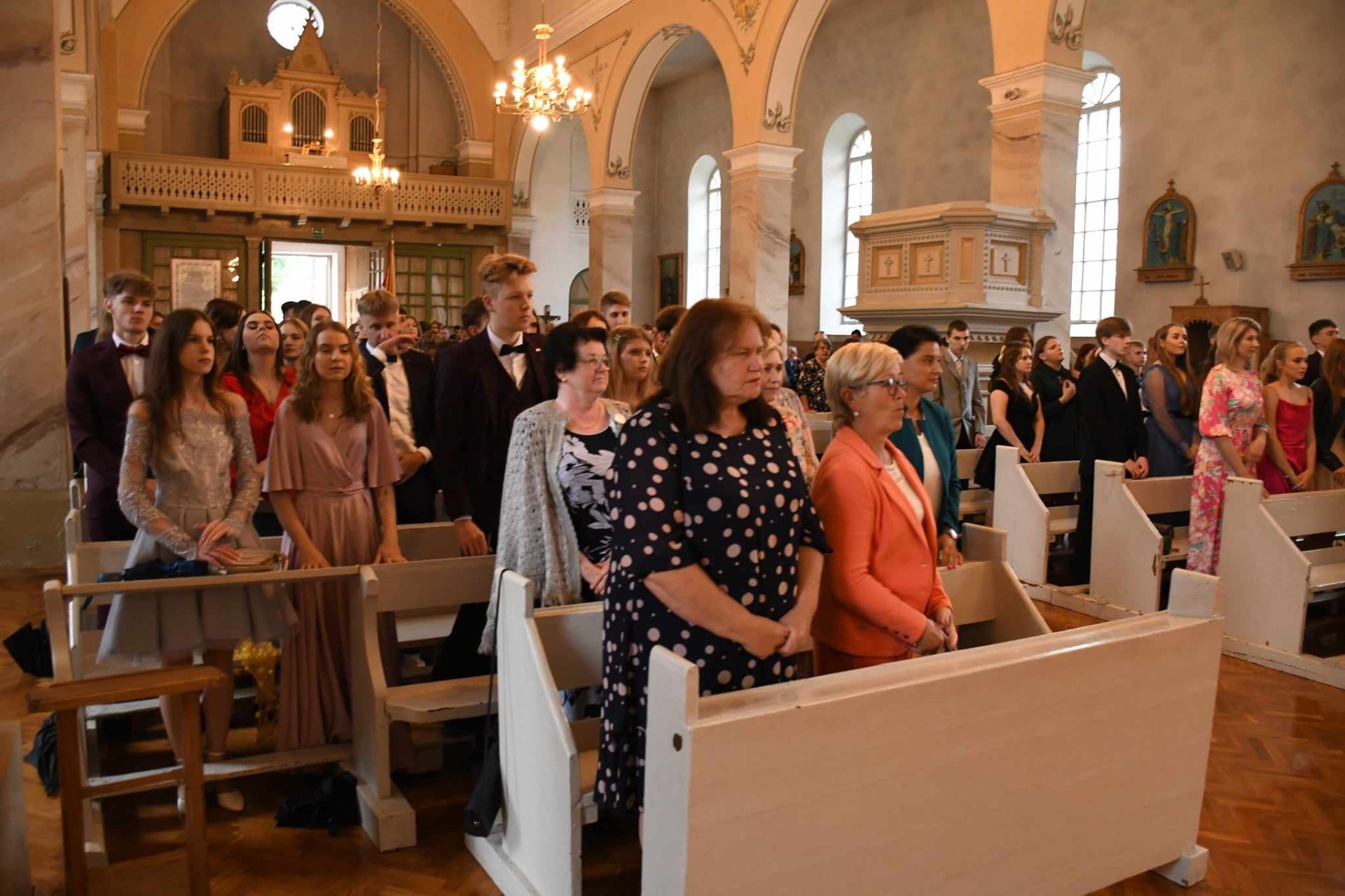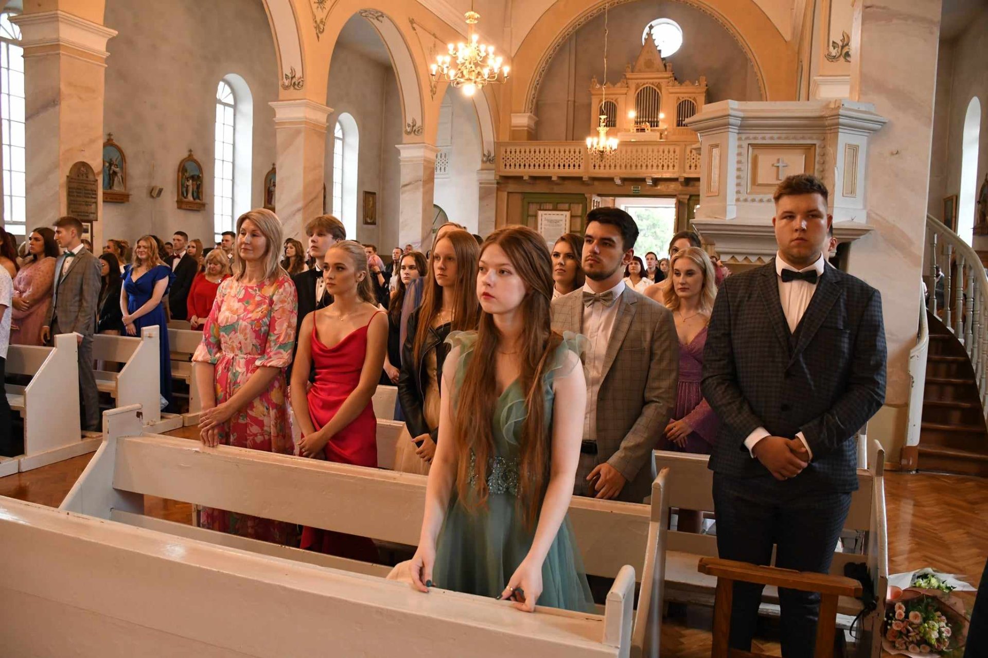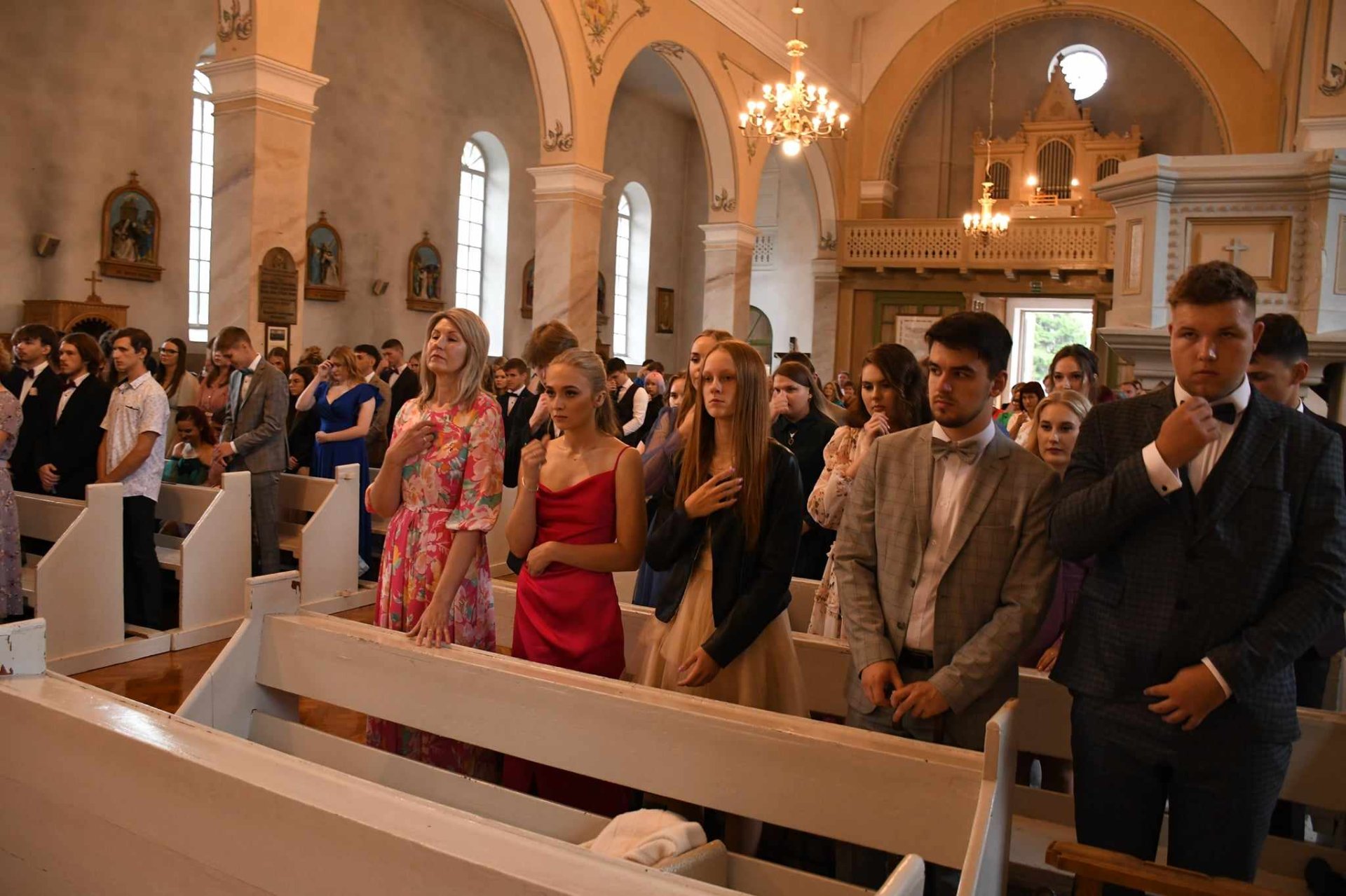 Kiek vėliau abiturientai, lydimi auklėtojų, įsikibę vienas kitam į parankę, patraukė į Pakruojo Šv. Jono Krikštytojo bažnyčią dalyvauti šv. Mišiose. Pakruojo dekanas, klebonas, kunigas Remigijus Čekavičius pasveikino abiturientus, gimnazijos direktorę, administraciją, mokytojus, abiturientų tėvelius, rajono valdžios atstovus, politikus, svečius, parapijiečius. Dekanas drąsino jaunus žmones, kalbėjo apie gėrį ir blogį, derliaus tiesioginę ir perkeltinę prasmę, palaimino abiturientų tolimesnį gyvenimo kelią.