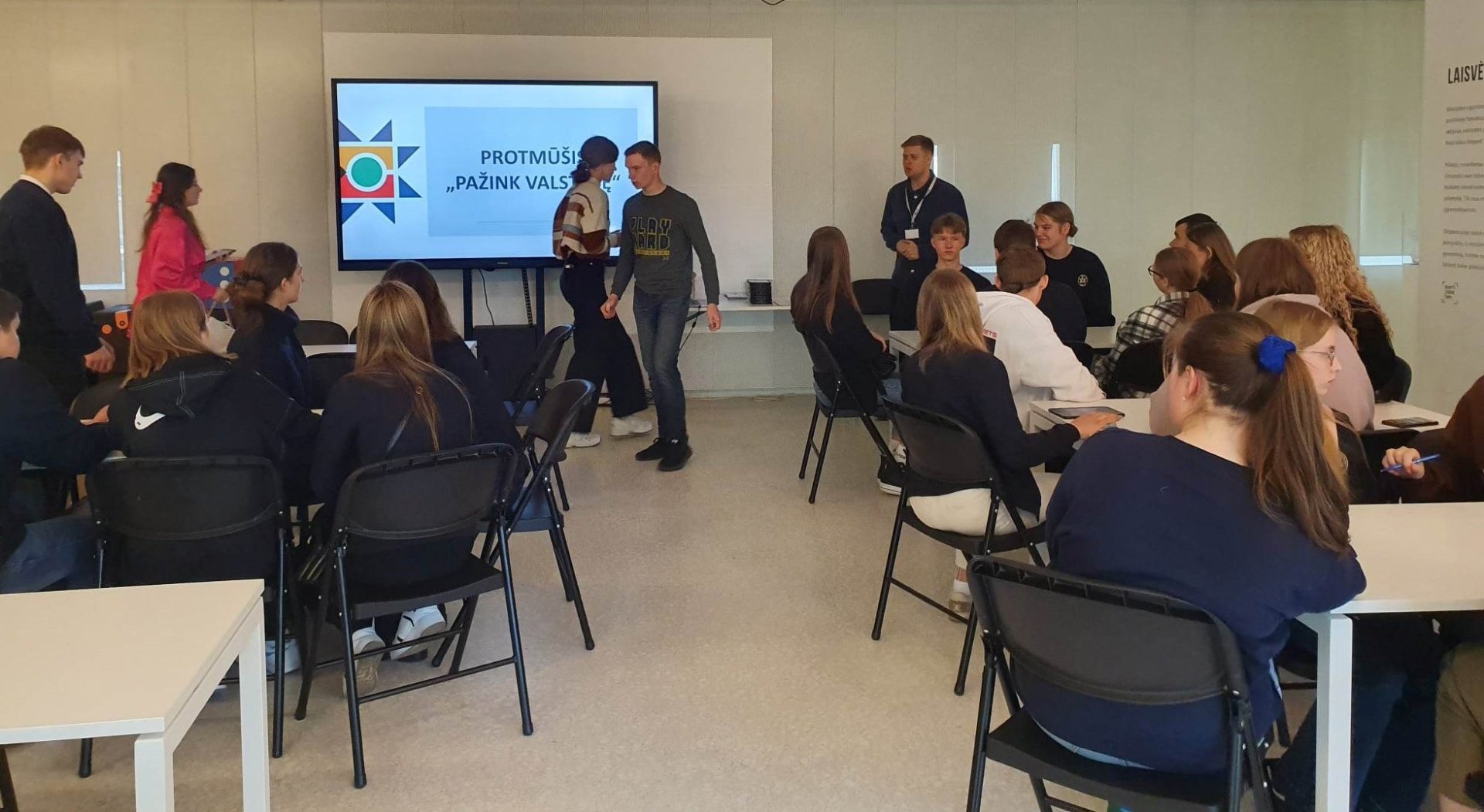 Po mugės mokiniai grįžo į Kultūros centrą ir klausėsi paskaitos: „Startuolio kūrimas ir valdymas“, kurią skaitė Saulėtekio slėnio mokslo ir technologijų parko lektorius Laurynas Braškus.