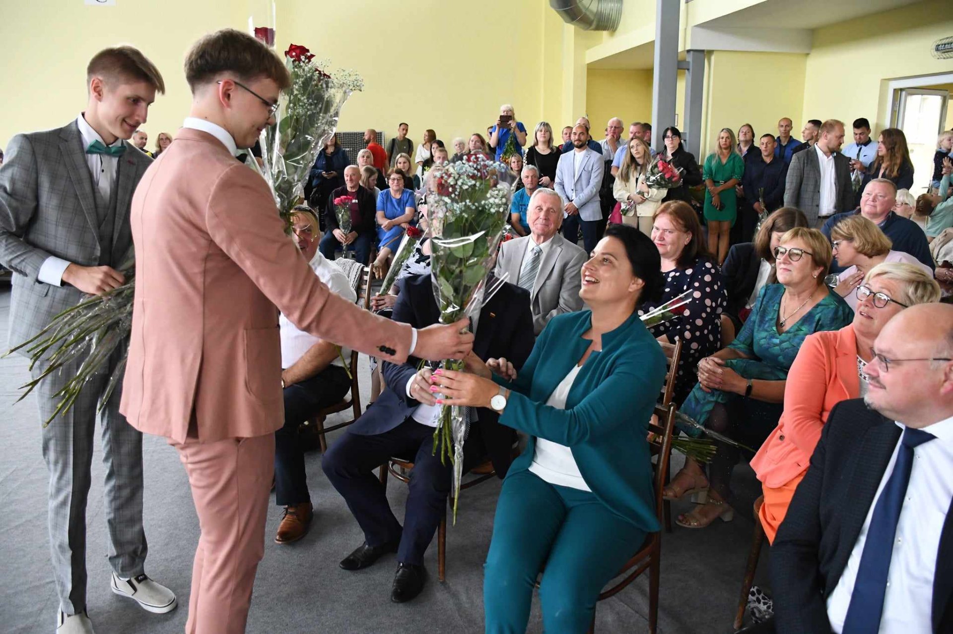 Po šv. Mišių gražus abiturientų būrys pasuko gimnazijos link, kur vyko iškilminga brandos atestatų įteikimo šventė. Sveikinimo žodį tarė gimnazijos direktorė Asta Valuntienė. Vadovė pasidžiaugė brandžiais abiturientais, pasiruošusiais savarankiško gyvenimo kelionei, dėkojo mokytojams, auklėtojoms, tėveliams. Direktorė pasveikino abiturientes Agnę Milaknytę (IV a kl.), Gerdą Bertulytę (IV b kl.) ir  Gabiją Grinaitę (IV b kl.), kurios už lietuvių kalbos ir literatūros VBE gavo 100-ukus. Renginyje dalyvavo Pakruojo rajono savivaldybės meras Saulius Margis, Pakruojo švietimo skyriaus vedėja Irena Mažulienė, Seimo narys Antanas Matulas, Pakruojo rajono savivaldybės tarybos narė, Seimo nario Antano Matulo padėjėja Erika Kižienė, Pakruojo seniūnas Svajūnas Miknevičius, gimnazijos mokinių prezidentė Greta Gudaitė. Abiturientams linkėta nebijoti iššūkių, tikėti savimi, baigus studijas grįžti į gimtąjį kraštą ir gerais darbais jį garsinti. Seimo narys Antanas Matulas kiekvienam abiturientui dovanojo po Lietuvos Respublikos Konstitucijos knygelę.