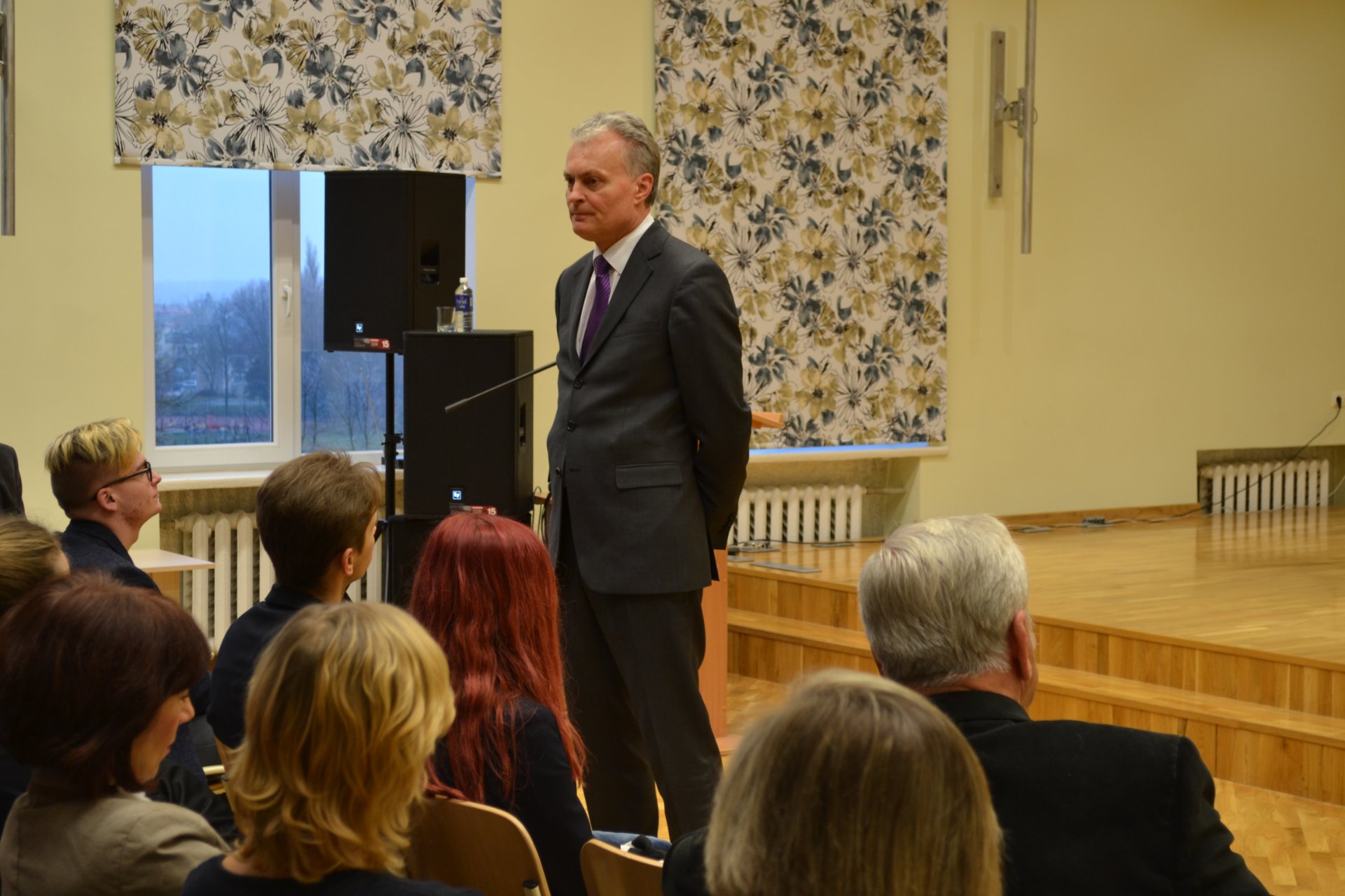 Gruodžio 12 d. į gimnaziją užsuko kandidatas į Lietuvos Respublikos Prezidentus Gitanas Nausėda. Posėdžių ir konferencijų salėje svečias susitiko su gimnazijos bendruomene. Ekonomistas papasakojo apie savo jaunystę, įvairias veiklas, sužinojome, kodėl jis neišlaikė matematikos egzamino ir kaip bandė mokytis vokiečių kalbos. Žymus asmuo drąsino nenusiminti, jei gyvenime kažkas nepasiseka, nes tai tik geras spyris veržtis į priekį. Anot finansų analitiko, Lietuvos istorijos faktai rodo, kad iš mažų miestelių kilę žmonės gyvenime nuveikia daug didelių darbų. Po susitikimo Gitanas Nausėda užsuko į gimnazijos muziejų, kur pasirašė svečių knygoje.