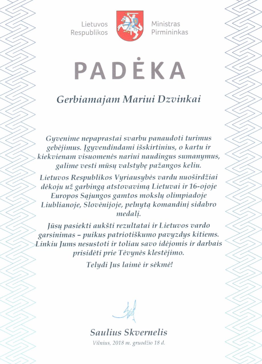 Gruodžio 18 d. Valdovų rūmuose Vilniuje rinkosi gabiausi šalies mokiniai ir jų mokytojai. Čia vyko 2018 metais tarptautinėse olimpiadose ir konkursuose dalyvavusių mokinių, juos ruošusių mokytojų ir komandų vadovų pagerbimo šventė. Didžiuojamės IVa klasės gimnazistu Mariumi Dzvinka ir dėkojame jo chemijos mokytojai Vitai Gudonienei už kruopštų darbą.