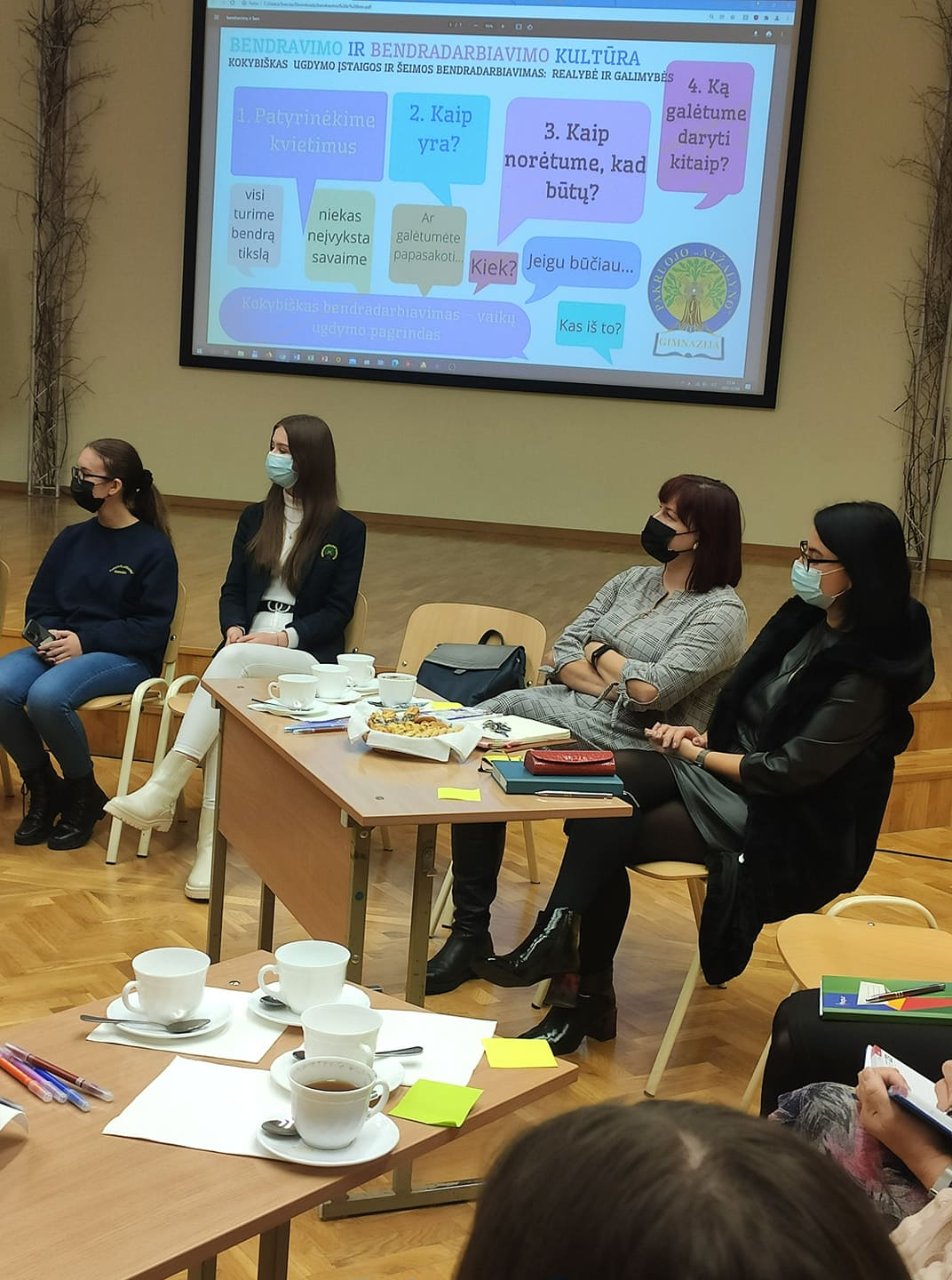 Gruodžio pabaigoje gimnazijoje įvyko apskritojo stalo diskusija „Bendravimo ir bendradarbiavimo kultūra“. Į susitikimą buvo pakviesti gimnazistai, mokinių tėvai ir globėjai, pedagogai, gimnazijos administracija. Nors buvo vėlyvas metas, susirinkusieji turėjo daug ką aptarti. Gyvas pokalbis džiugino nuomonių ir idėjų gausa.