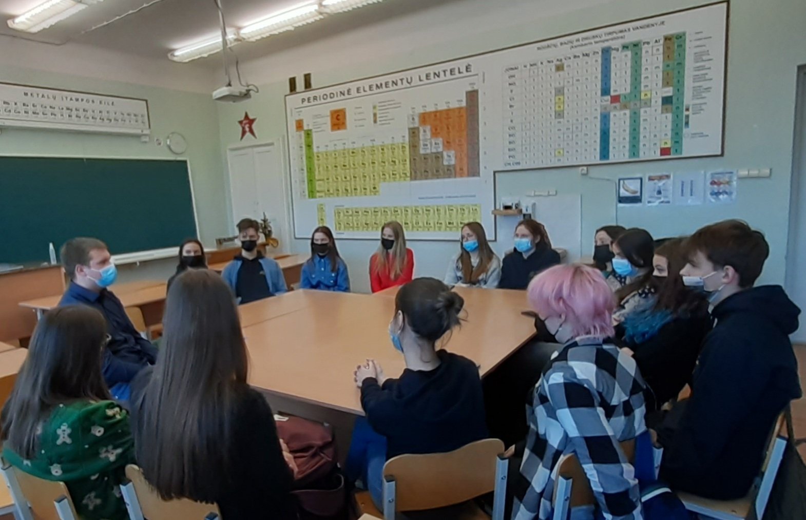 Medicina ir chemija – dvi populiarios specialybės, apie kurias galvoja mokiniai, pasirinkę mokytis chemiją A lygiu. Kuo studijos universitete skiriasi nuo pamokų mokykloje, kaip ruoštis ateičiai, ką studentai veikia laisvalaikiu?.. Atsakymų į šiuos ir kitus klausimus gimnazistai ir tikėjosi sulaukti iš buvusių mūsų gimnazijos mokinių Mariaus Dzvinkos, jau trečiakursio, studijuojančio VU chemiją, ir pirmakursio Kornelijaus Armono, pasukusio į medicinos mokslus LSMU. Džiugino nuoširdus bendravimas.