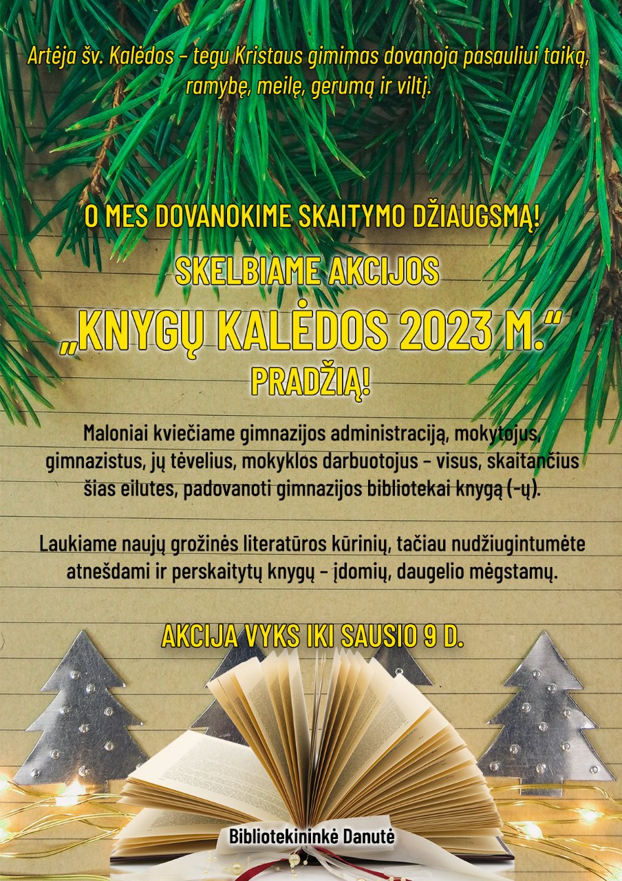 Jei pernai mūsų eglutė buvo medinė, surinkta iš detalių, tai šiemet priimtas kiek kitoks sprendimas – nutarta ją išskobti iš vientiso rąsto. Dirbta per būrelio užsiėmimus, po pamokų. Kuriant kompoziciją panaudotos jau turėtos kalėdinės dekoracijos. Nuoširdžiai tariu ačiū daugiausiai prisidėjusiam II b klasės mokiniui Ervinui Dominauskui, taip pat I a klasės gimnazistams Domantui Dzinduliui, Benui Šimkūnui, be to, I b klasės mokiniui Sauliui Jakštai ir I c klasės gimnazistams Austėjui Venciui, Martynui Jakštai, Ainiui Rauckiui, Gabrieliui Kranauskaui. Miela ir smagu, kad vaikinai negailėjo nei laiko, nei jėgų ir visi kartu dirbdami bei šnekučiuodamiesi priartėjome prie šv. Kalėdų paslapties...