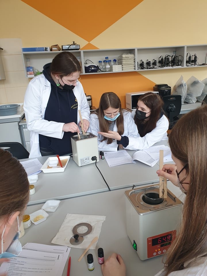 Kovo 9 dieną grupelė antrokų gimnazistų su biologijos mokytoja Daiva Makauskiene vyko į VU Šiaulių akademijos STEAM atviros prieigos centrą, kur Gyvenimo kokybės ir sveikatos technologijų laboratorijoje atliko darbą „Natūralios kosmetikos gamyba“.