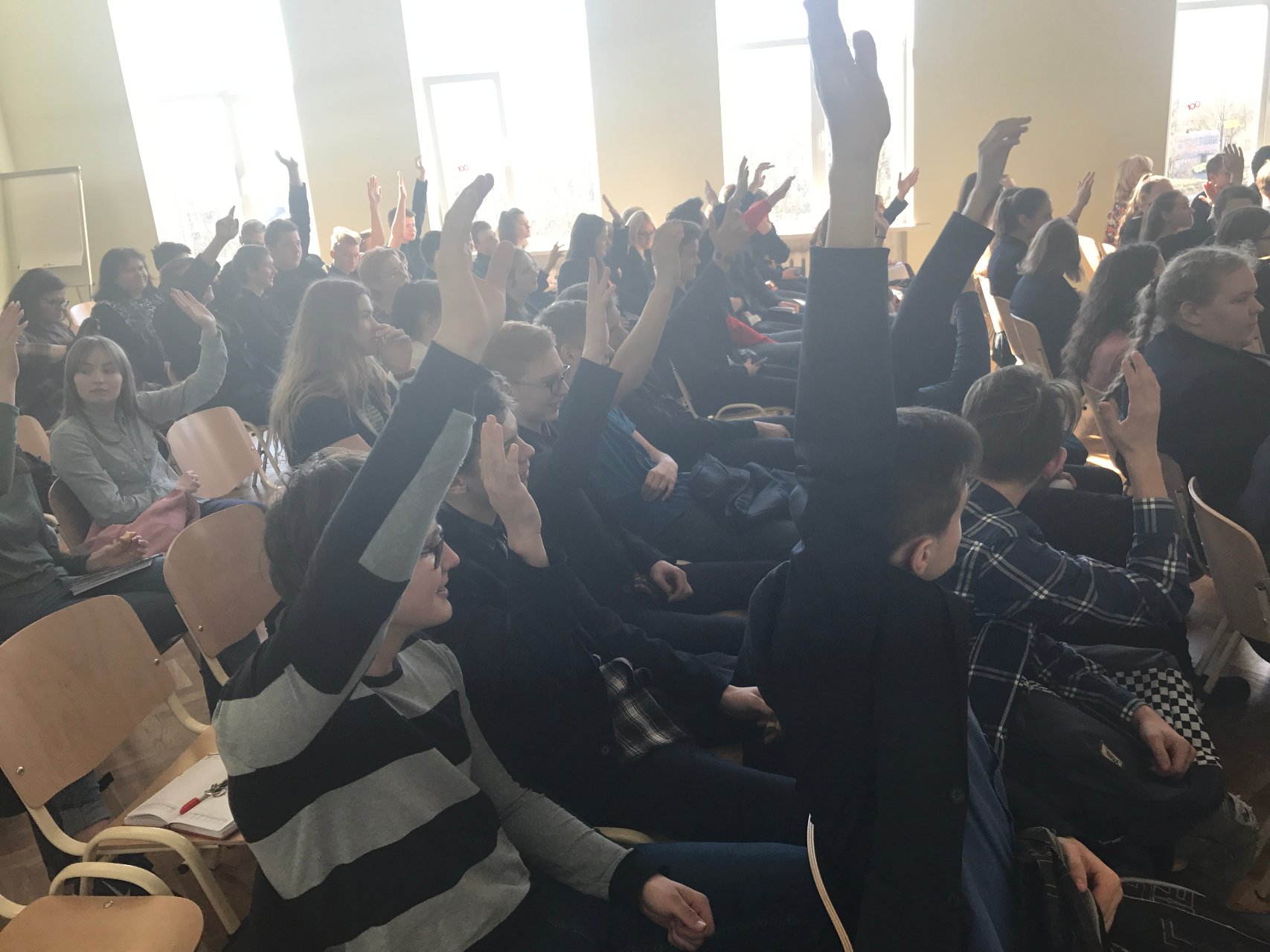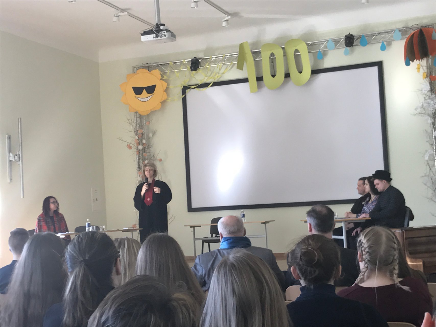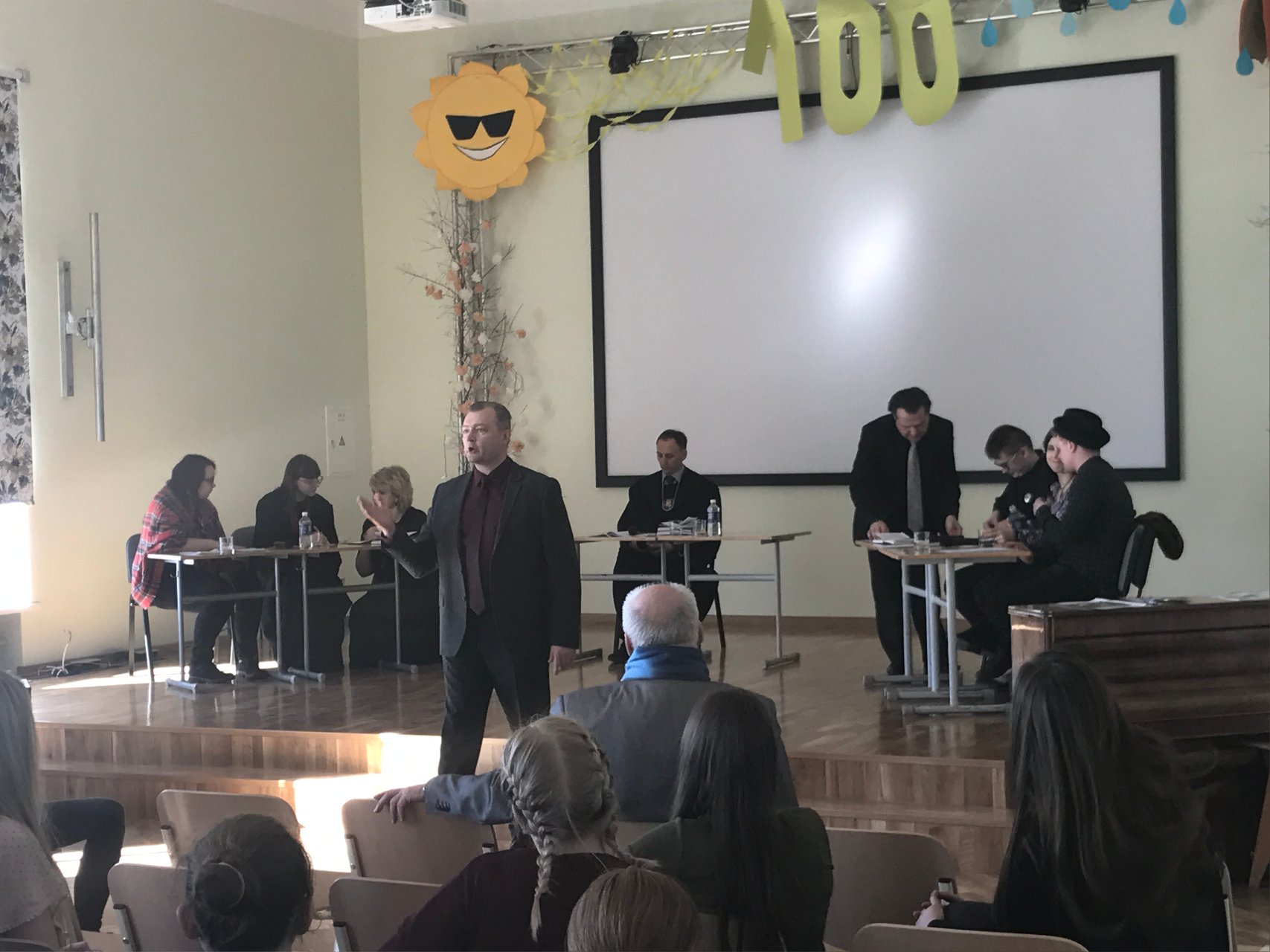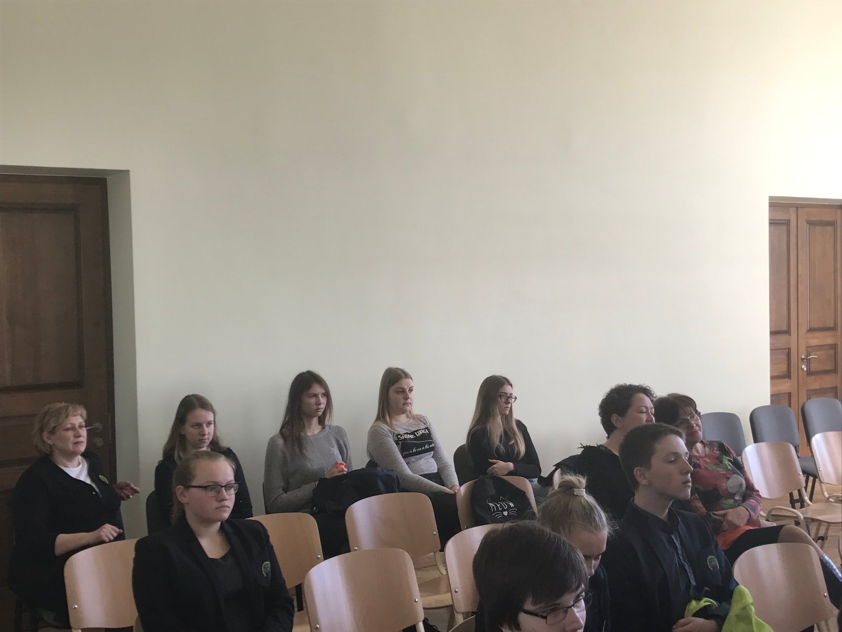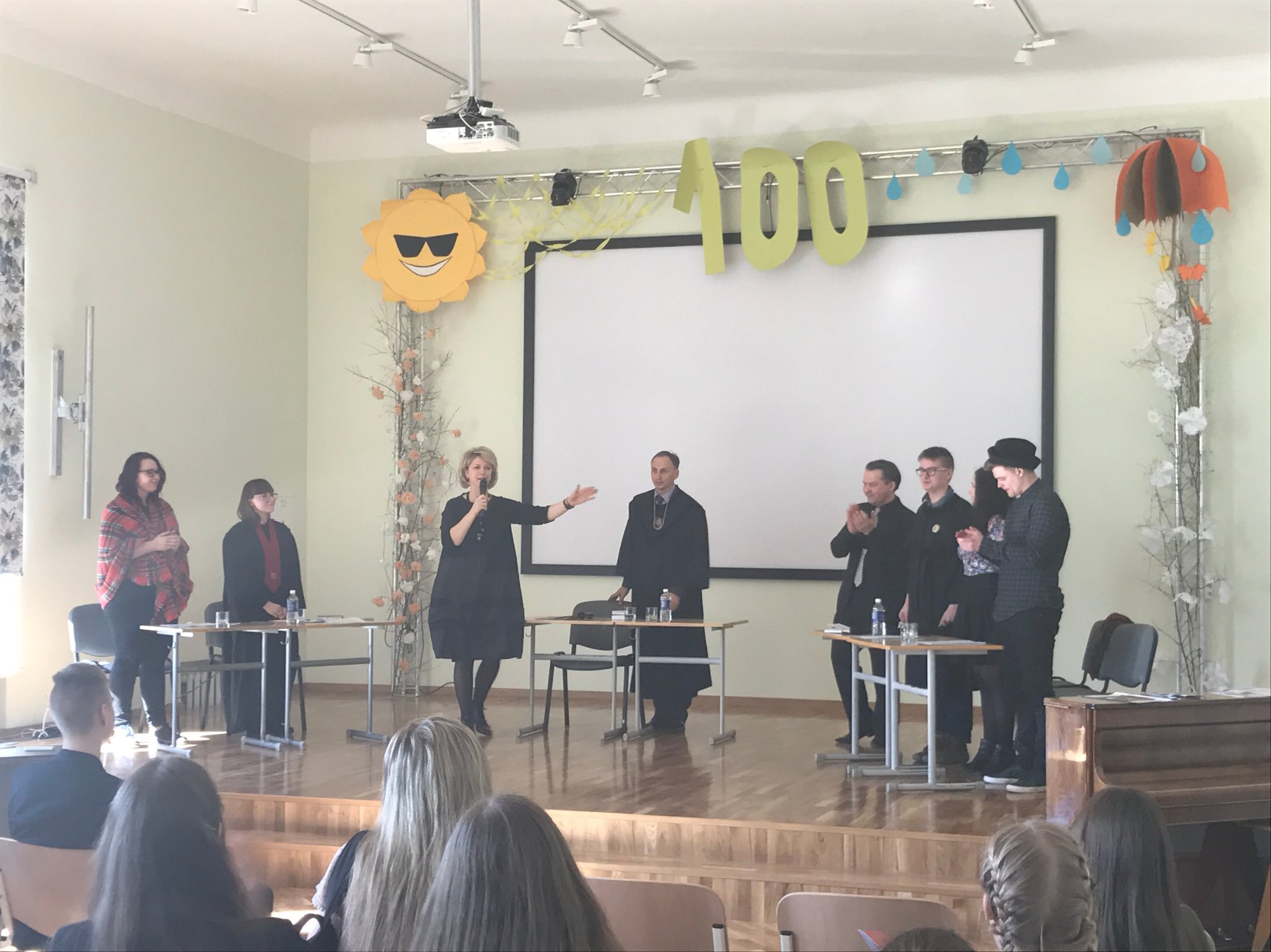 „Stot, teismas eina!“ – išgirdo mokiniai, galbūt pirmą kartą dalyvaujantys „literatūriniame teisme“. Į gimnaziją 2017-03-24 atvyko Mykolo Romerio universiteto Teisės fakulteto dėstytojai ir studentai, kurie vadovaudamiesi Lietuvos Respublikos baudžiamuoju kodeksu „teisė“ Žemaitės apsakymo „Marti“ Katrės skriaudikus. Prodekanė (studijoms) prof. dr. Snieguolė Matulienė buvo prokurorė, teisėjo vaidmuo atiteko Viešosios teisės instituto lektoriui Žydrūnui Plytnikui, lektorius dr. Pavelas Kujalis buvo senosios Vingienės ir Vingių Jono advokatas, Teisės fakulteto studentai vaidino Vingių Jonuką ir Driežienę. Teisme buvo nagrinėjama baudžiamoji byla Nr. 002-2016, kurioje ponia Vingienė kaltinama pagal Lietuvos Respublikos baudžiamojo kodekso 154 str. 1 dalį už tikrovės neatitinkančios informacijos apie Driežų Katrę paskleidimą, dėl ko buvo pakirstas Katrės pasitikėjimas savimi. Taip pat buvo kaltinamas ir Vingių Jonas pagal Lietuvos Respublikos baudžiamojo kodekso 144 str. už savo žmonos Driežų Katrės palikimą be pagalbos, kai grėsė pavojus jos gyvybei. Kūrinys virto baudžiamąja byla, gimnazistai galėjo stebėti, kaip vyksta teismo procesas, pamąstyti, įsiklausyti, mokytis argumentuotai ginti savo poziciją. Vėliau rinkodaros ir priėmimo skyriaus vedėjas Saulius Bugailiškis pristatė MRU, o drąsiausi gimnazistai galėjo užsivilkti mantijas, įsijausti į prokuroro bei advokato vaidmenis ir sakyti baigiamąsias kalbas. Turėjome unikalią galimybę stebėti teisinio proceso eigą, prisiekusieji buvo patys gimnazistai, kurių vis dėlto neįtikino sklandi advokato kalba. Mokiniai nubalsavo, kad Vingių šeima kalta, jos abejingumas pražudė Katrę. Sprendimas buvo priimtas. Džiaugiamės kartu su pirmokais ir antrokais gimnazistais, kad galėjome patirti daug įdomių atradimo akimirkų ir dalyvauti teisiniame procese. Dėkojame svečiams iš MRU už galimybę kitaip pažvelgti į kūrinį.