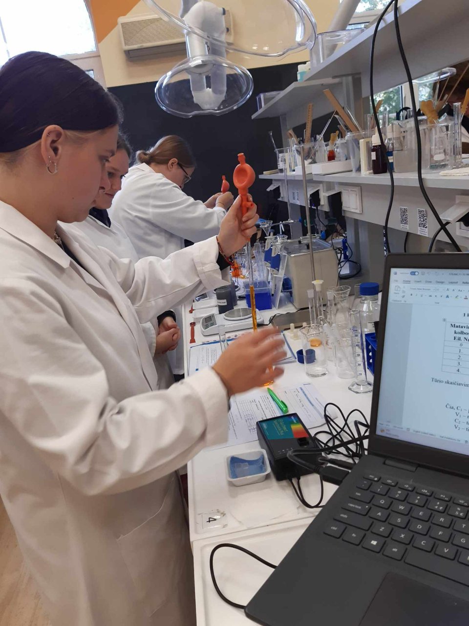 Spalio 7 d. grupė gimnazijos trečiokų dirbo VU Šiaulių akademijos STEAM atviros prieigos centro chemijos laboratorijoje. Atlikome integruotą tiriamąjį darbą „Dažikliais užterštų nuotekų valymas aktyvintomis anglimis“.