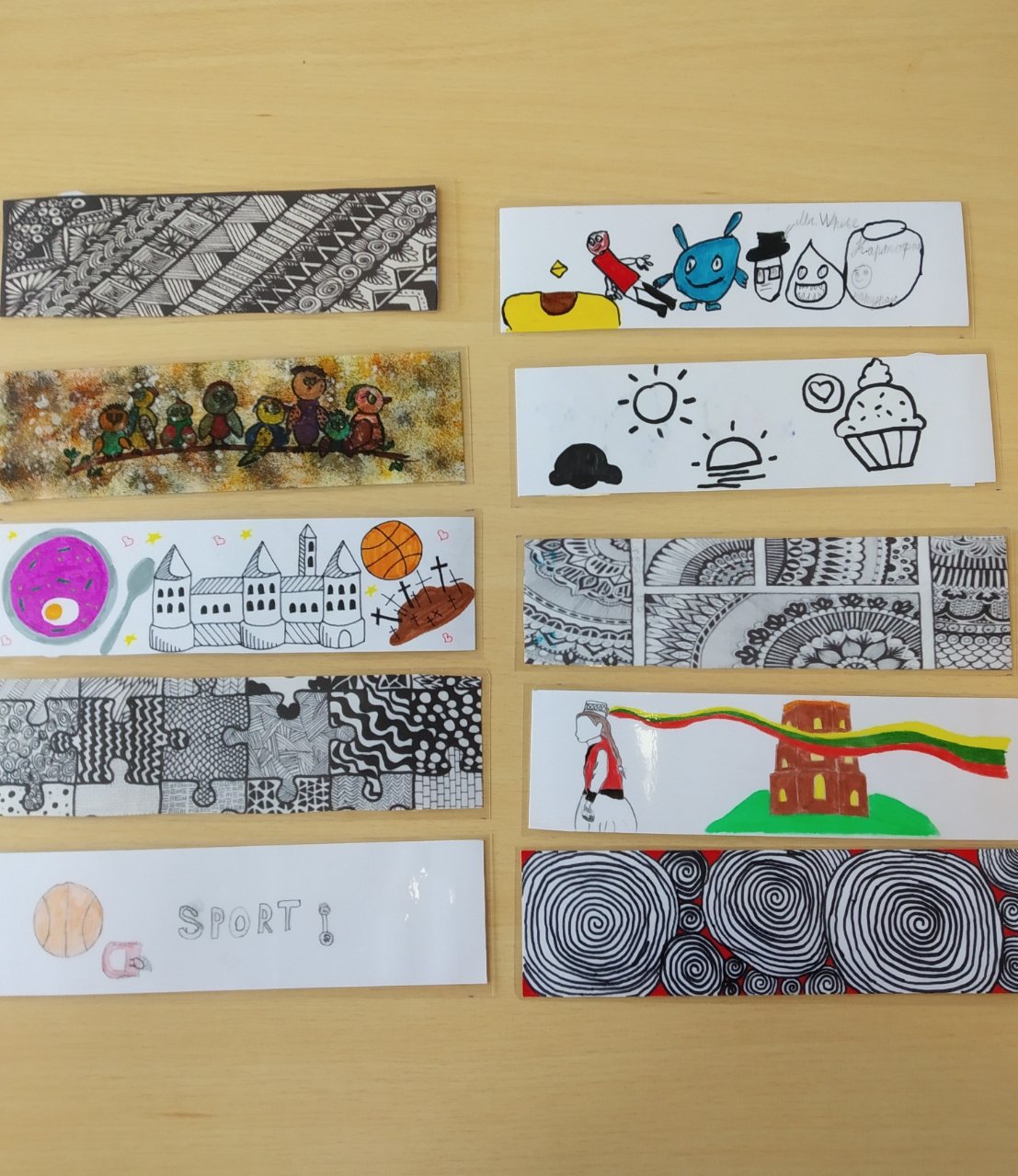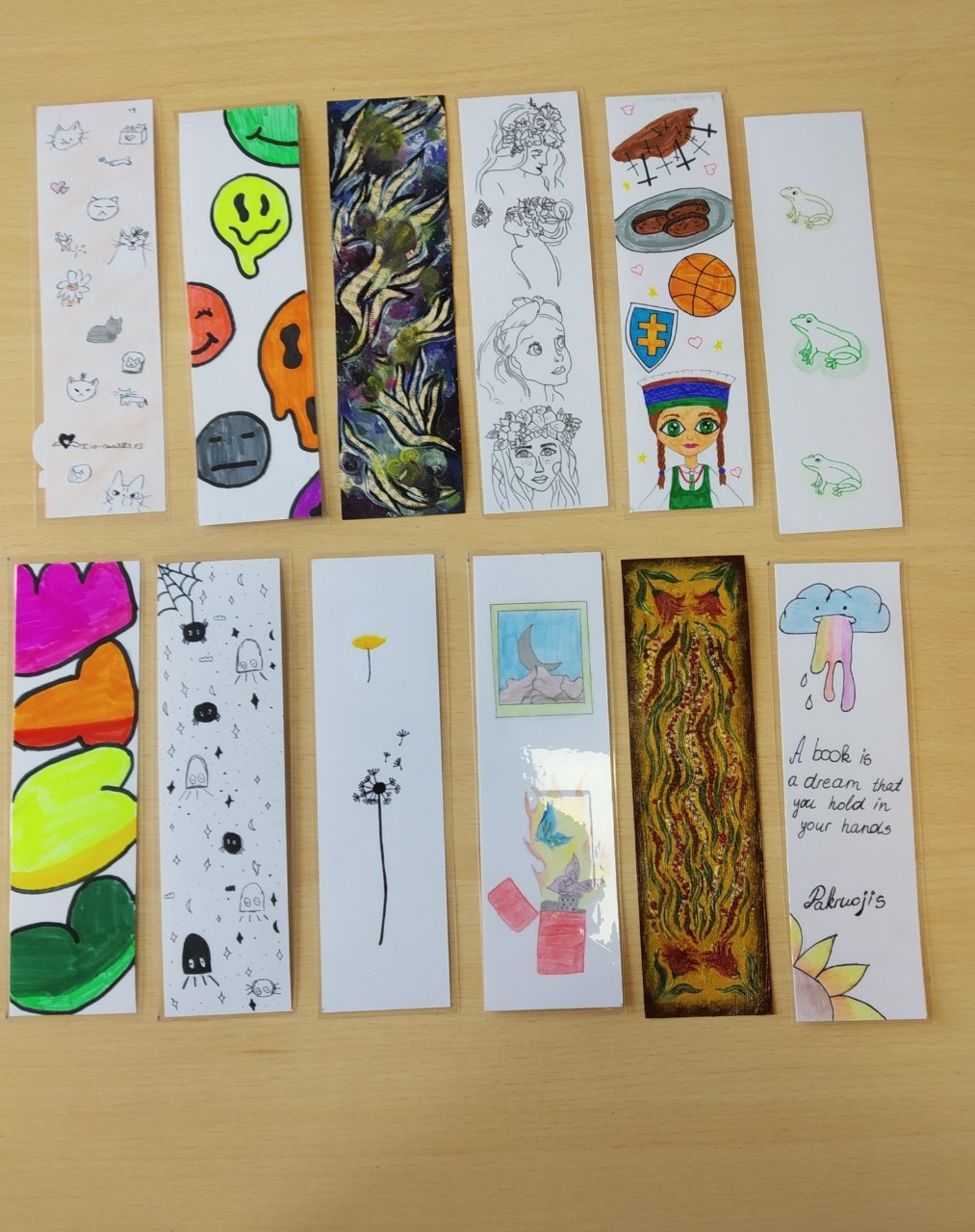 Knygų skirtukai jau paruošti ir ateinančią savaitę bus išsiųsti. Nuoširdžiai dėkojame mokiniams, sutikusiems dalyvauti projekte ir dalelę savo laiko skyrusiems kūrybai. Beje, šiemet ant kiekvieno skirtuko puikuojasi gimnazijos emblema – tokiu būdu mokiniai pristato „Atžalyno“ gimnaziją Indijos mokiniams.