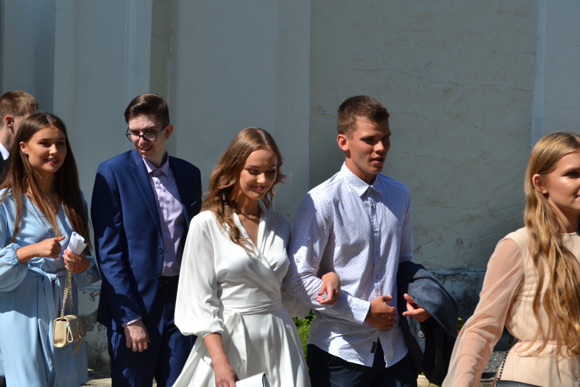 Kiek vėliau abiturientai, lydimi auklėtojų, įsikibę vienas kitam į parankę, patraukė į Pakruojo Šv. Jono Krikštytojo bažnyčią dalyvauti šv. Mišiose. Pakruojo dekanas, klebonas, kunigas Remigijus Čekavičius pasveikino abiturientus, gimnazijos administraciją, mokytojus, abiturientų tėvelius, rajono valdžios atstovus, politikus, svečius, parapijiečius. Dekanas drąsino jaunus žmones, kad, kai teks susidurti su sunkumais ar susimąstyti apie gyvenimo prasmę, nepamirštų, jog Dievas dovanoja viltį ir patiki ateitį savo vaikams.