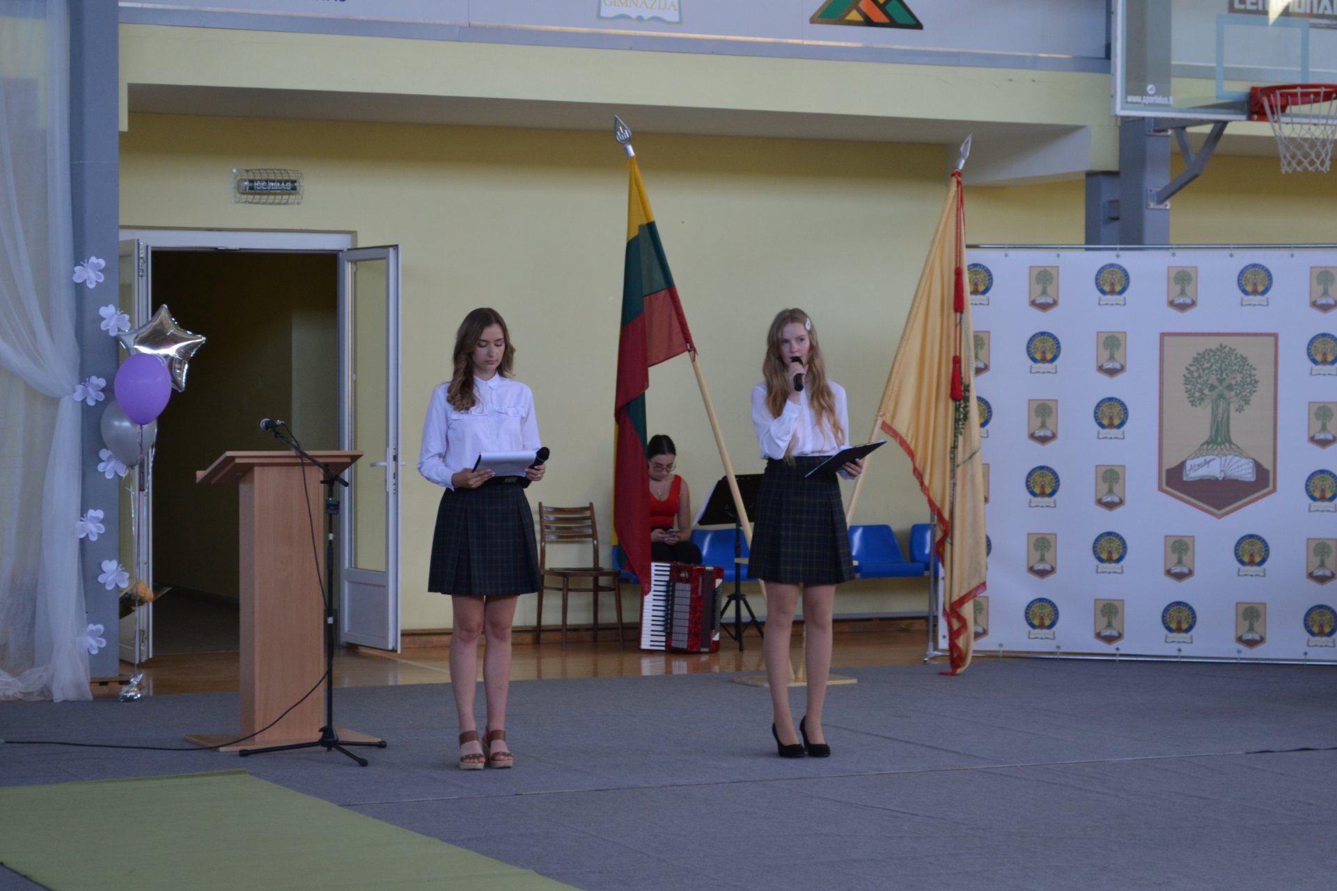 Sveikinimo žodį tarė direktoriaus pavaduotoja ugdymui, atliekanti direktoriaus funkcijas Rasa Bertulienė. Ji pasidžiaugė IV b klasės abituriento Kornelijaus Armono net keturiais 100-ukais už lietuvių kalbos ir literatūros, matematikos, biologijos ir anglų kalbos valstybinius brandos egzaminus, išvardijo abiturientus, gavusius aukščiausius įvertinimus. Direktoriaus pavaduotoja ugdymui, atliekanti direktoriaus funkcijas Rasa Bertulienė dėkojo auklėtojoms, mokytojams, tėveliams, o abiturientams linkėjo pagalvoti apie neribotą pasąmonės jėgą, kuri gali padėti įgyvendinti mintis ir svajones.