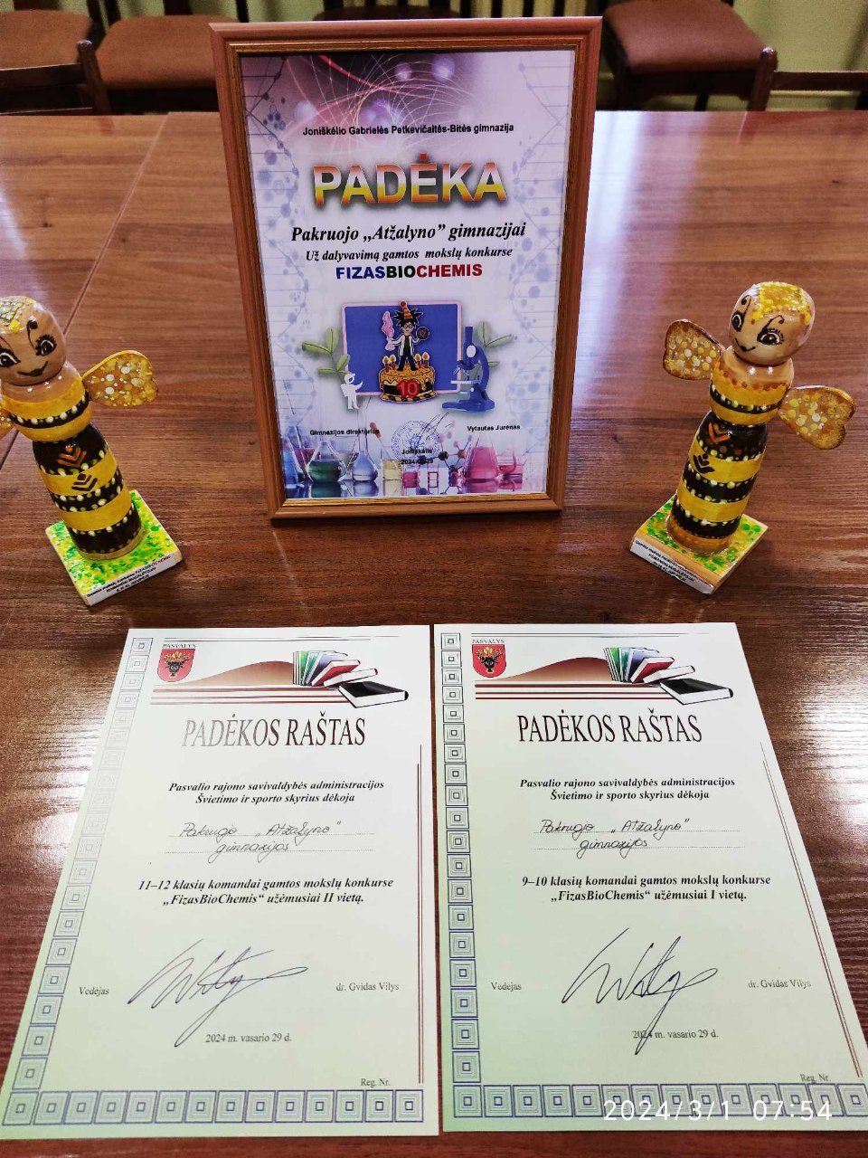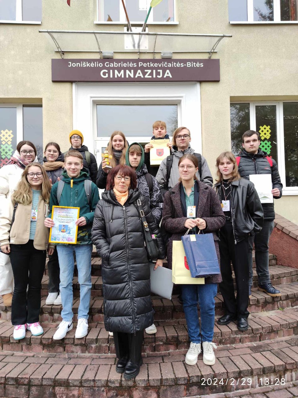 Šaltą vasario 29-osios rytą gamtos mokslais besidomintys Pakruojo „Atžalyno“ gimnazijos mokiniai kartu su fizikos mokytoja Vida Imanavičiūte ir Pakruojo „Žemynos“ progimnazijos mokiniais išvyko į 10-ąjį respublikinį konkursą „FizasBioChemis“, organizuojamą Joniškėlio Gabrielės Petkevičaitės-Bitės gimnazijoje. Proto miklumą išbandyti buvo smalsu ne tik mums, bet ir mokiniams iš Pasvalio, Joniškio, Biržų, Kupiškio ir net Skuodo mokyklų. Mūsų gimnazijai atstovavo dvi I-II ir III-IV klasių mokinių komandos. Renginį pradžioje buvę gimnazistai pasidalijo prisiminimais apie iniciatyvą organizuoti konkursą, džiaugėsi, kad tęsiamos tradicijos siekiant kilnaus tikslo – suburti visus mokinius, besidominčius gamtos mokslais, ir plečiamas jų akiratis. Konkurso organizatorė Rita Karpavičienė pasveikino visus susirinkusius, pasidžiaugė jubiliejine švente ir padėkojo prie renginio organizavimo prisidėjusioms mokytojoms bei mokiniams. Netrukus komandos jau skubėjo į atskirus kabinetus, kuriuose jų laukė fizikos, biologijos ir chemijos užduočių lapai. Kiekvieno dalyko užduotims atlikti buvo skirtas pusvalandis. Baigę spręsti uždavinius mokiniai buvo pakviesti į kūrybines dirbtuves, kuriose jiems reikėjo sukurti sveikinimą renginio 10-ojo gimtadienio proga. Vieni rašė eiles, kiti kūrė atvirukus, o dar kiti – dainas. Laukdami rezultatų mokiniai stebėjo sveikinimų pristatymus, kurie anaiptol nepaliko abejingų – jaunimas šypsojosi, salėje aidėjo juokas, o plojimai užpildė kiekvieną salės kampelį. Suskaičiavus taškus buvo apdovanotos abi mūsų gimnazijos komandos! 9-10 klasių grupėje Pakruojo „Atžalyno“ gimnazijos mokinių komanda iškovojo 1-ąją vietą, o 11-12 klasių – 2-ąją! Grįžome įgavę naujos patirties, sužinoję naujų dalykų ir, žinoma, pasikrovę geros energijos!