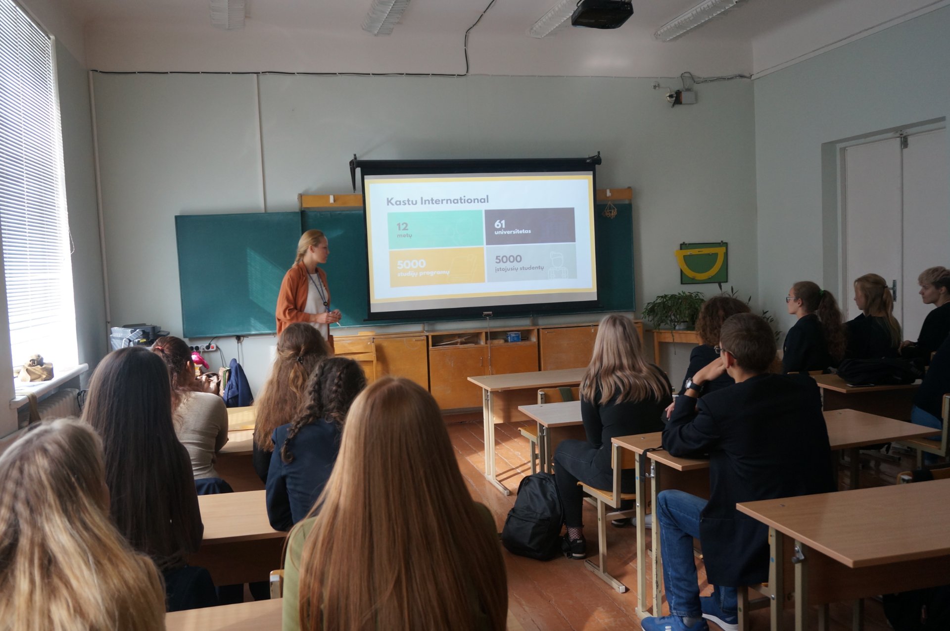 Rugsėjo 20 dieną gimnazijoje lankėsi „KASTU International“ organizacijos atstovė, kuri pasidalijo aktualia bei naudinga informacija apie studijų užsienyje galimybes.