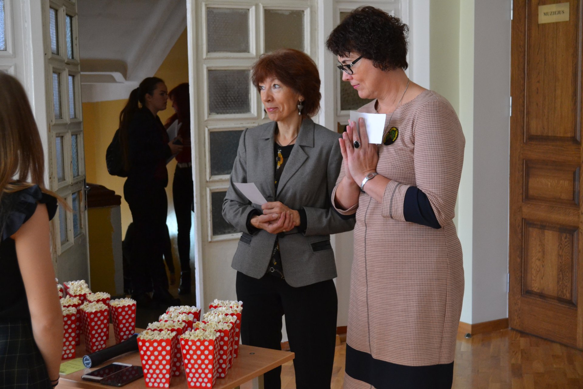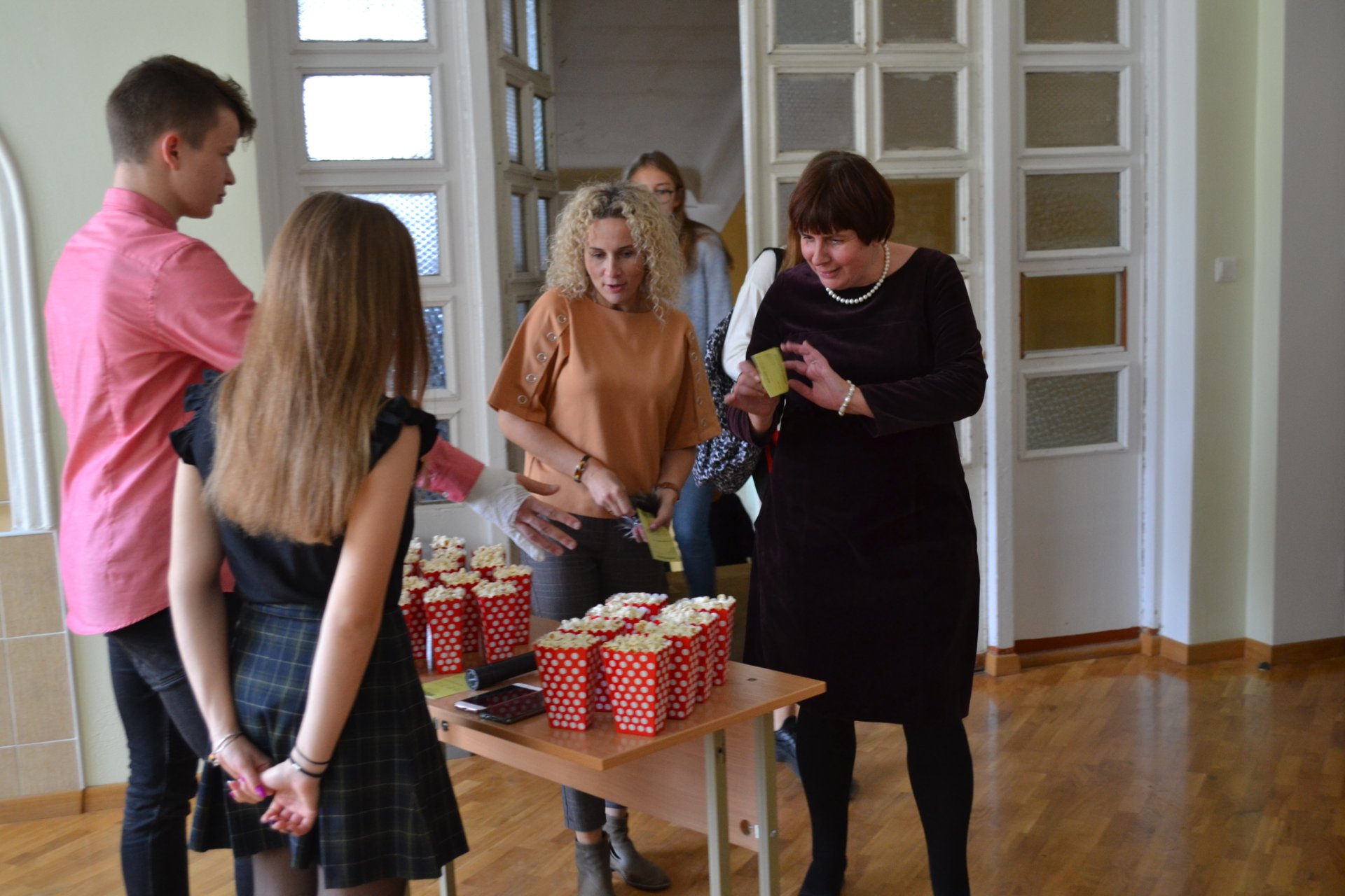 Po 4 pamokų visi pedagogai skubėjo į posėdžių ir konferencijų salę. Išsirinkę mėgstamų kukurūzų spragėsių, jie buvo maloniai palydėti prie biliete nurodytos vietos. Filmą kūrė, galima sakyti, visi gimnazistai, nes vieni dėkojo mokytojams, kiti deklamavo eilėraščius, treti rado įvairių minčių, kurių pirmosios raidės atitiko žodžio MOKYTOJAS raides, buvo ir tokių, kurie dainavo, vaidino. Originalūs vaikų pasveikinimai pedagogus nudžiugino, galbūt net ir nustebino. Po kino filmo peržiūros merginų ansamblis visiems dovanojo skambią dainą. Sveikinimo žodžius tarė abiturientai Dinas ir Titas Majauskai, mokytojų rankose pražydo kvapnūs rožių žiedai, kuriuos įteikė kiti ketvirtokai vaikinai. Vėliau ugdytojai galėjo prie kavos ir arbatos pasišnekučiuoti bei pasivaišinti tortu. Labai tikimės, kad mokytojai džiaugsmingai prisimins šią dieną, į atmintį įsirėš išgyventos emocijos...