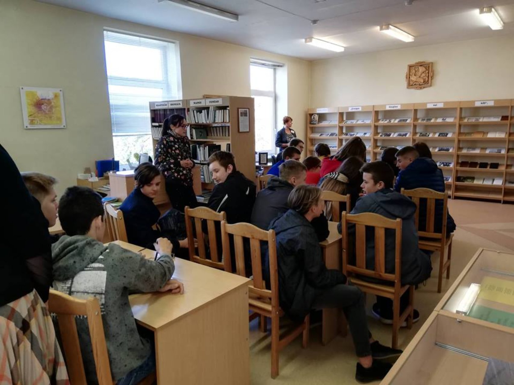 Ta proga rugsėjo 25 dieną Ic klasės gimnazistai ir lietuvių kalbos mokytoja Romualda Juknevičienė šiugždendami auksinio rudens paklotus lapus po kojomis keliavo į Pakruojo rajono savivaldybės Juozo Paukštelio viešosios bibliotekos skaityklą. Mus šiltai pasitiko skaitytojų aptarnavimo skyriaus vedėja Judita Jereckienė, kuri papasakojo apie parengtą dokumentų parodą „Įžvelgęs daugiau nei kiti“, skirtą Vydūnui. Buvo įdomu išgirsti nežinomų faktų apie rašytojo asmenybę, gyvenimą ir veiklą, pasklaidyti jo kūrinių puslapius. Nuoširdžiai dėkojame bibliotekininkei už papildytą žinių kraitelę, malonų priėmimą ir galimybę pabūti jaukioje aplinkoje.