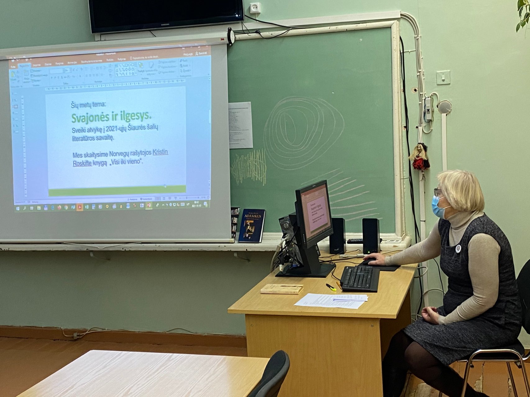 Lapkričio 9-15 dienomis organizuojami kasmetiniai Šiaurės šalių literatūros savaitės renginiai. Šių metų savaitės tema – „Svajonės ir ilgesys Šiaurėje“. Įvairios veiklos vyksta ir mūsų gimnazijoje. Širdingai dėkojame bibliotekininkei Danutei už padrąsinimą ir pagalbą organizuojant garsinius skaitymus žvakių šviesoje. I c, II a ir II c klasių gimnazistai kartu su bibliotekininke Danute Kučinskiene ir lietuvių kalbos mokytojomis Gražina Spudiene ir Romualda Juknevičiene leidosi į neįprastą kelionę po pasaulį: mokiniai skaitė norvegų rašytojos ir iliustruotojos Kristin Roskifte knygos „Visi iki vieno“ ištraukas, stabtelėjo prie iliustracijų. Nors kūrinys yra skirtas jaunesniojo mokyklinio amžiaus vaikams, tačiau mums kiekviena knygos mintis pasirodė prasminga, privertė susimąstyti: „Septyni su puse milijardo žmonių vienoje planetoje. Kiekvieno jų istorija ypatinga. Visi iki vieno svarbūs. O vienas jų esi tu!“ Be to, bibliotekininkė papasakojo apie Šiaurės šalis, visi kartu klausėmės norvegų grupės atliekamos dainos, mokiniai dalyvavo „protų mūšyje“ apie Šiaurės šalis. Be to, mokytojos kvietė gimnazistus pamąstyti, ar visi troškimai įgyvendinami, kokie iš viso jie būna, bibliotekininkė pristatė interneto puslapį, kuriame skelbiamos vaikų, augančių socialinės rizikos bei socialinių įgūdžių stokojančiose šeimose, svajonės. Lieka viltis, galbūt jų norus kas nors išpildys... Smagu, kad skaitydami galime keliauti, pažinti kitas šalis, susimąstyti apie vertybes.