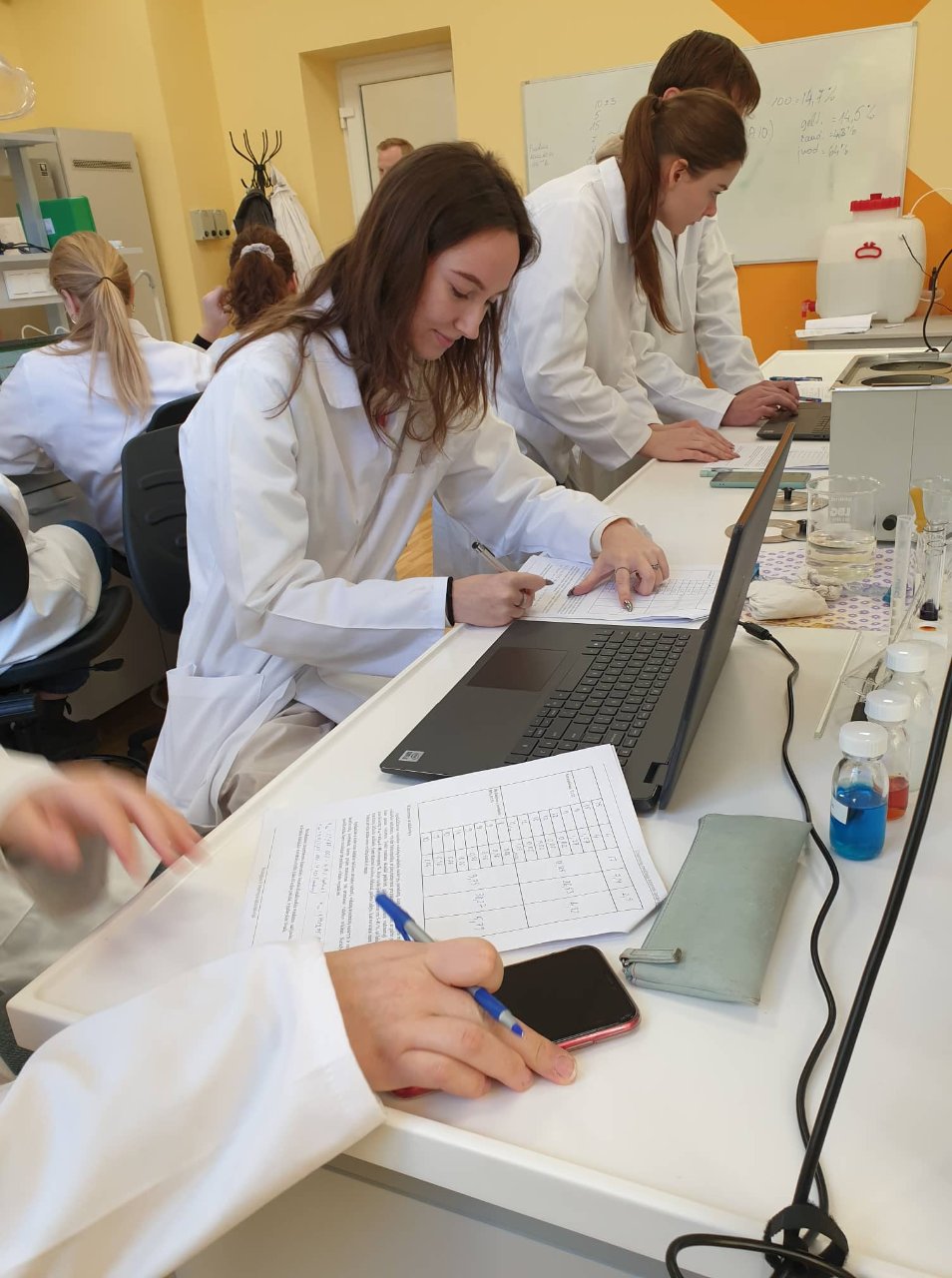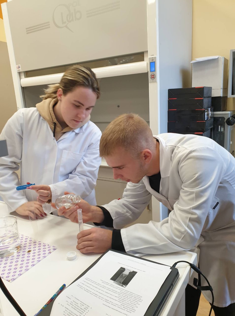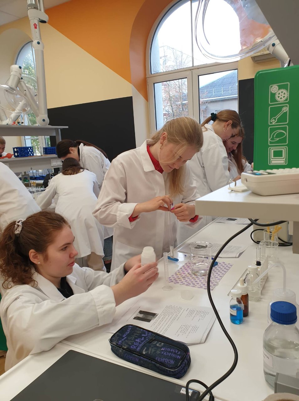 Spalio 17 d. abiturientų grupelė, viena trečiokė gimnazistė ir biologijos mokytoja Daiva Makauskienė lankėsi VU Šiaulių akademijos STEAM centre, kur biologijos chemijos laboratorijoje atliko tiriamąjį darbą „Cheminių medžiagų kelionės ląstelėje“.