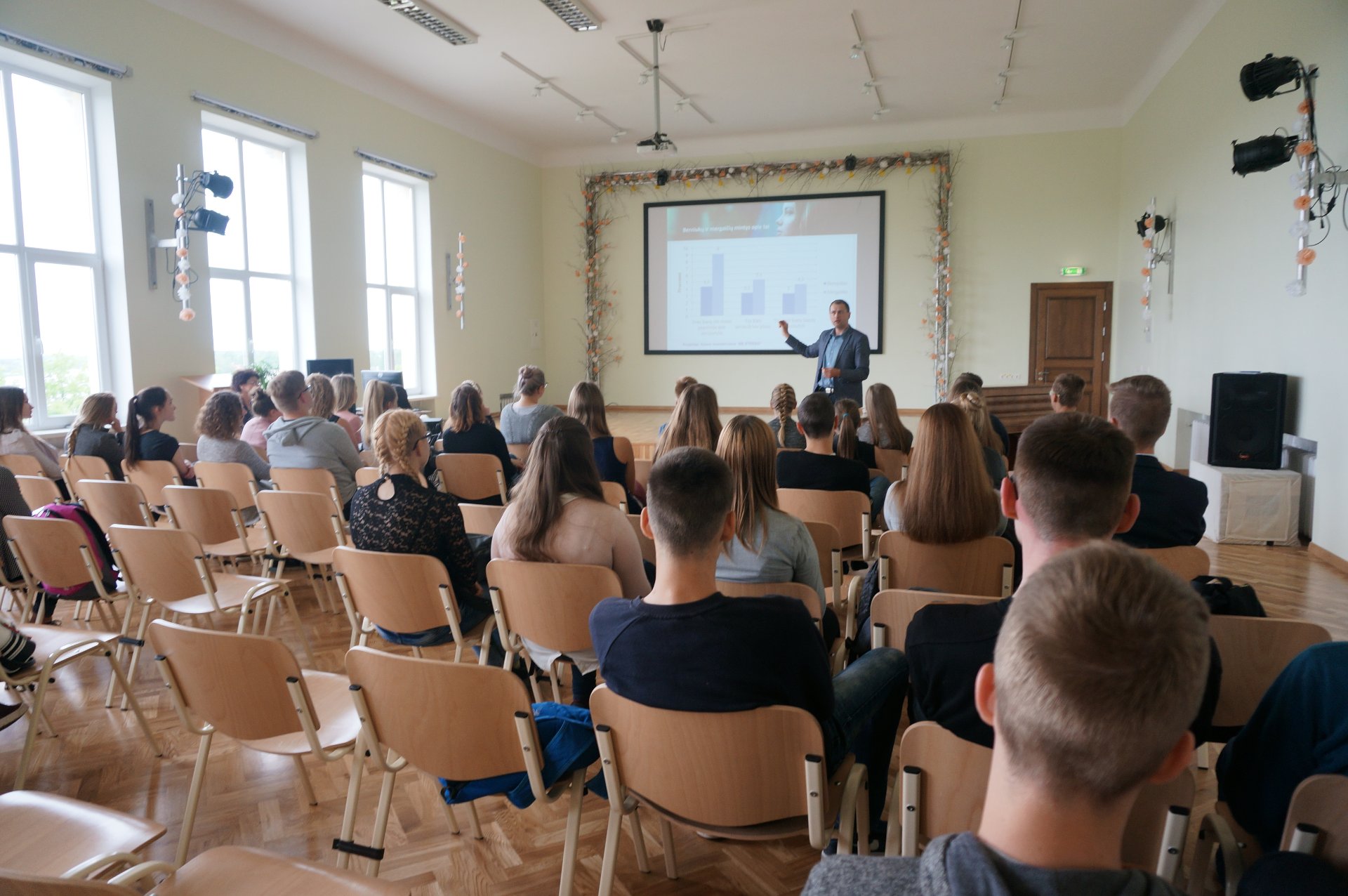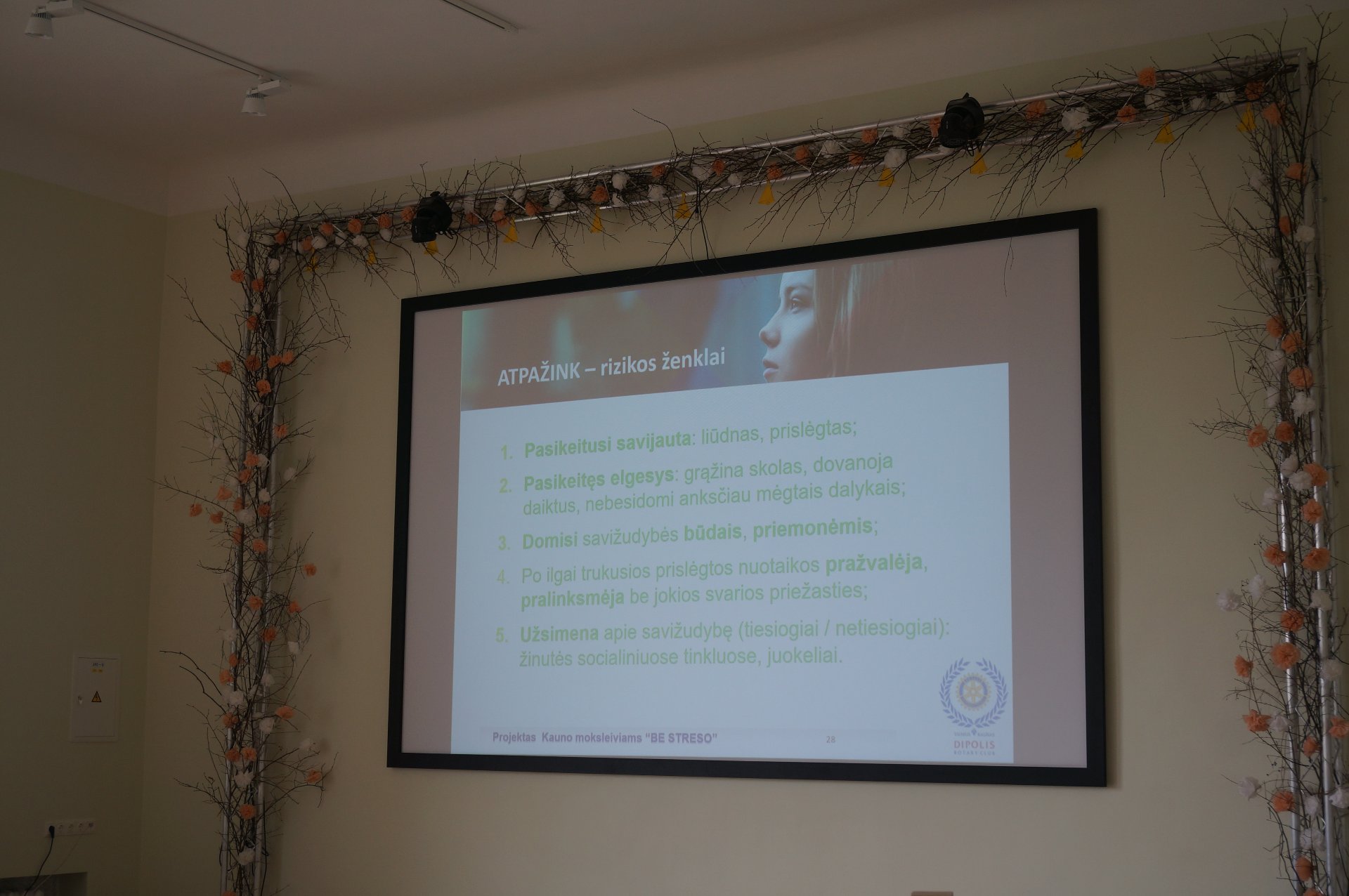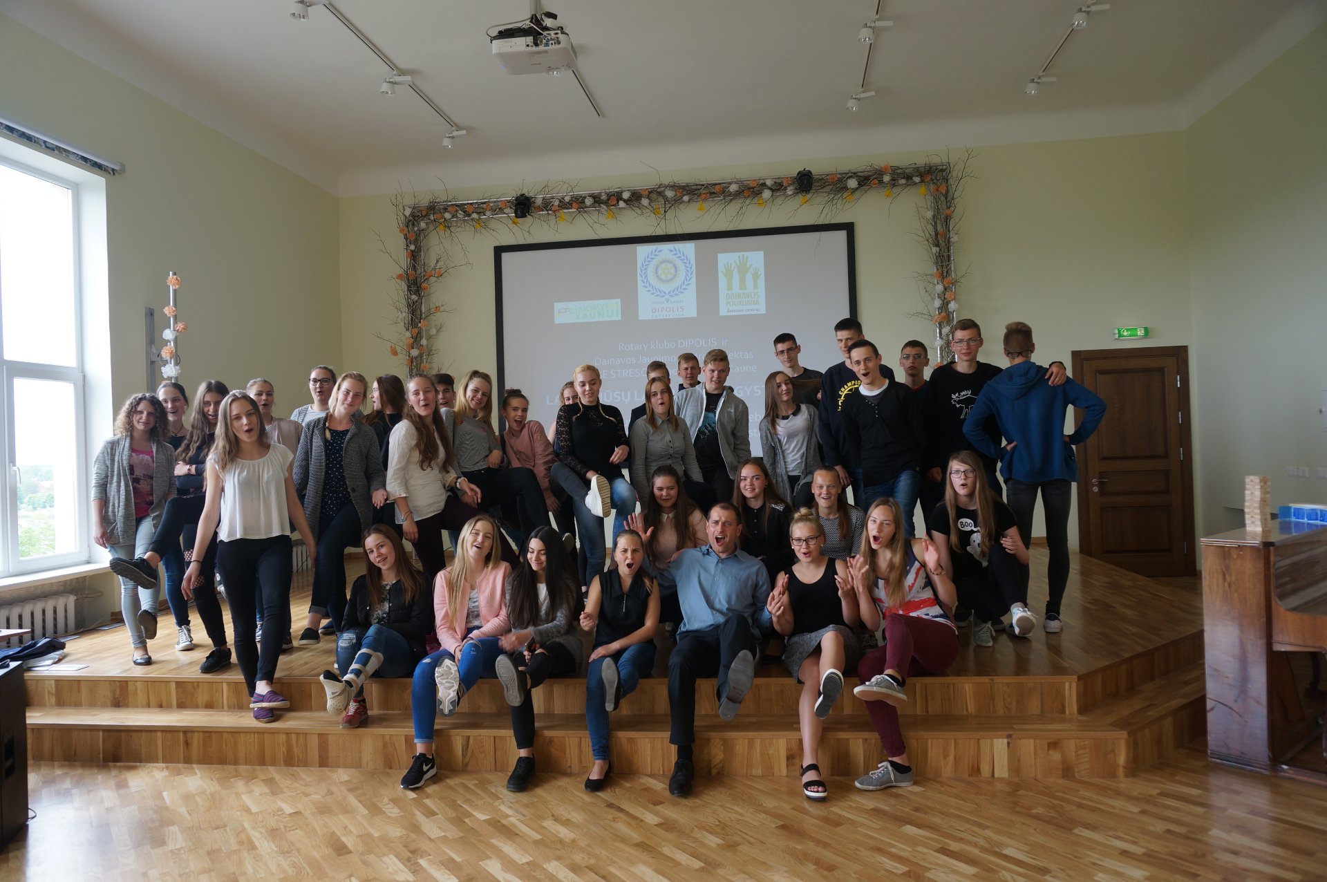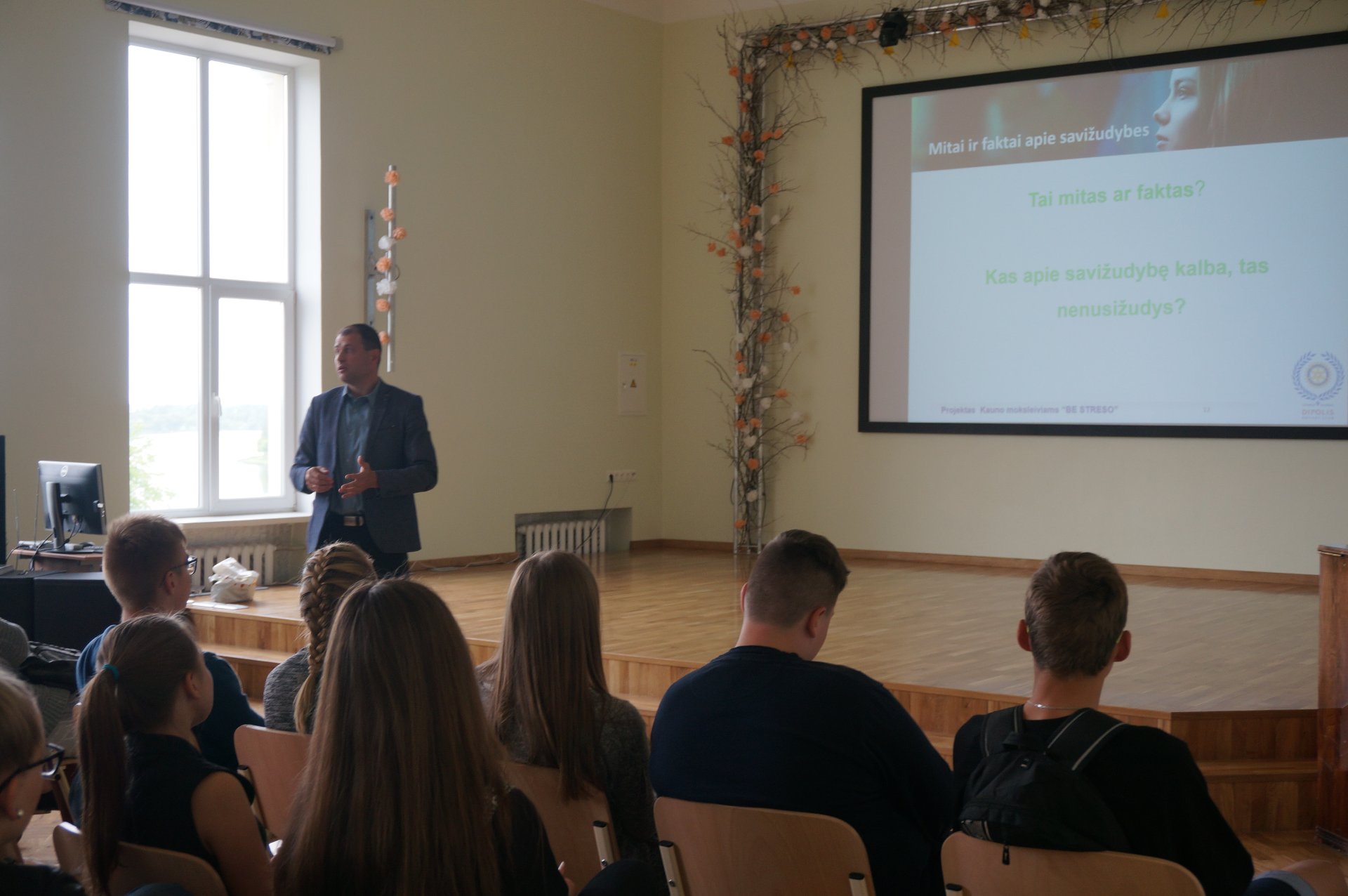 Rotary klubo „Dipolis“ narys Aurelijus Daškevičius gausiam moksleivių būriui vedė teorinį užsiėmimą – buvo diskutuojama savižudybių prevencijos tema. Paskui buvo organizuota praktinė veikla – svečias kvietė į gyvybingumo treniruotę norėdamas sužadinti gimnazistų emocijas. Mokiniai buvo aktyvūs, drąsiai reiškė savo nuomonę. Tokio susitikimo tikslas – prisidėti prie jaunų žmonių sveikatos stiprinimo teikiant psichologinį atsparumą didinančias konsultacijas, šviesti apie savižudybių mastą Lietuvoje.