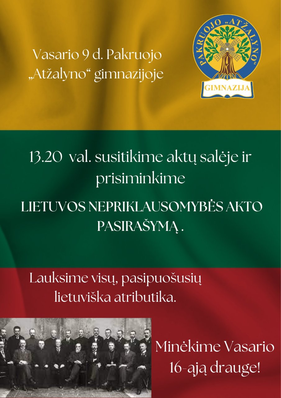 Ketvirtadienio popietę gimnazijos bendruomenė susibūrė aktų salėje ir nepaprastai jaukiai minėjo Vasario 16-ąją. Svarbiausiu šventės akcentu tapo Lietuvos Nepriklausomybės akto pasirašymo prisiminimas – jį kiek įmanoma tiksliau atkartojo mokiniai, kuriems pasiruošti padėjo istorijos mokytoja Gražina Kairiūkštienė. Beje, tardama sveikinimo žodį ji priminė, kad visada reikia prisiminti praeitį, nes tik taip jaunimas galės eiti pirmyn, kurti savo tautos istoriją. Renginį vedė mokinių prezidentė Greta Gudaitė, II b klasės gimnazistė. Dėkodama už gražų ir prasmingą reginį direktorė Asta Valuntienė kvietė atverti širdis ir branginti laisvės dovaną, kad būtume tikri jos saugotojai. Be to, gimnazijos vadovė už dalyvavimą įvairiuose renginiuose ir konkursuose mokiniams ir mokytojams įteikė padėkos raštus. Renginį paįvairino vokalinės-instrumentinės studijos ir I c klasės mokinės Martynos dovanojami muzikiniai numeriai (muzikos mokytoja Vaiva Klupšienė), skrabalais grojo technologijų mokytojas Egidijus Impolis. Šventės pabaigoje jautriai visų kartu atliekamos bendros dainos tik patvirtino, kad laisvės pojūtis gyvas mūsų širdyse, lūpose ir mintyse.