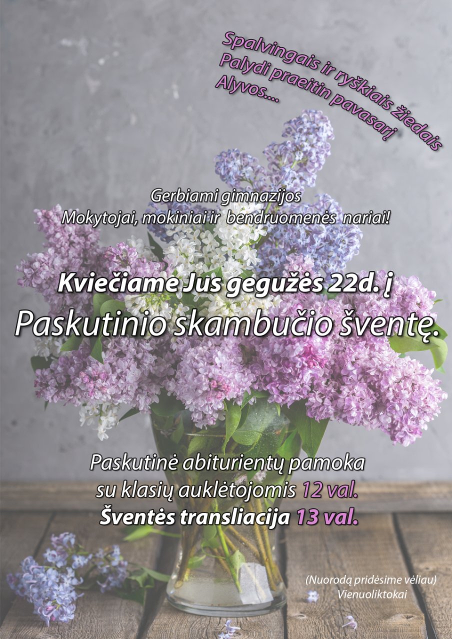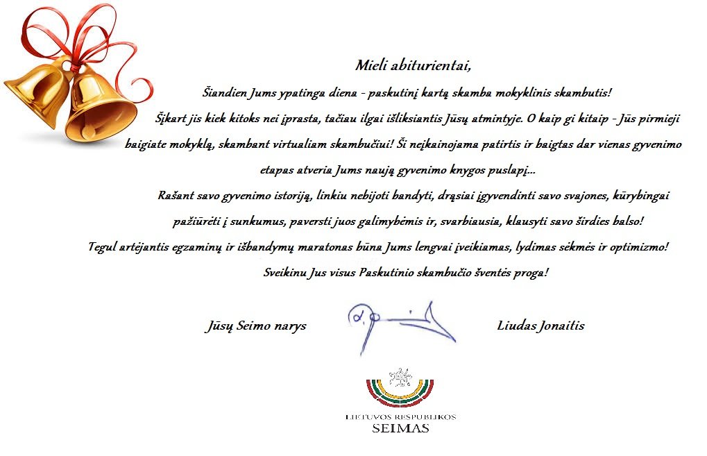 Paskutinio skambučio šventė šiemet nebus tokia, kokia būdavo įprastai. Abiturientai, Jūs verti to džiaugsmo, šventės nuotaikos. Tačiau šiandien turime rūpintis ir vieni kitų sveikata. Būkime sveiki, saugokime save ir savo artimuosius, draugus.