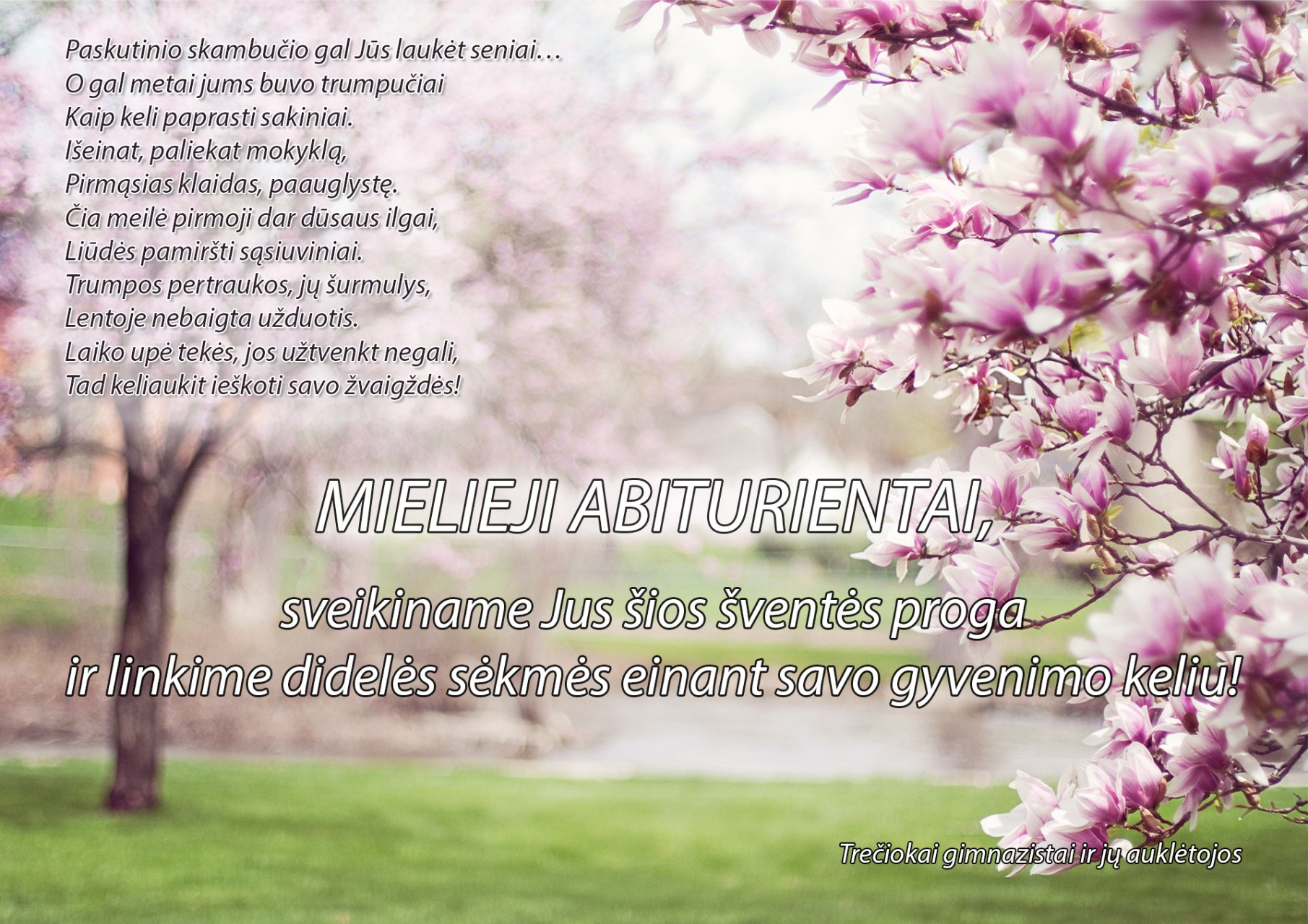 Be abejo, didžiausiais dėmesys Jums, ABITURIENTAI. Paskutinio skambučio proga Jus sveikina visos gimnazijos klasės. Būtinai pasklaidykite internetinio laikraštuko puslapius – rasite įvairių palinkėjimų. Brangieji, tegul Jūsų akys visada dega gyvenimu, puoselėkite paprastumą, nuoširdumą ir gerumą. Lengvos pradžios!