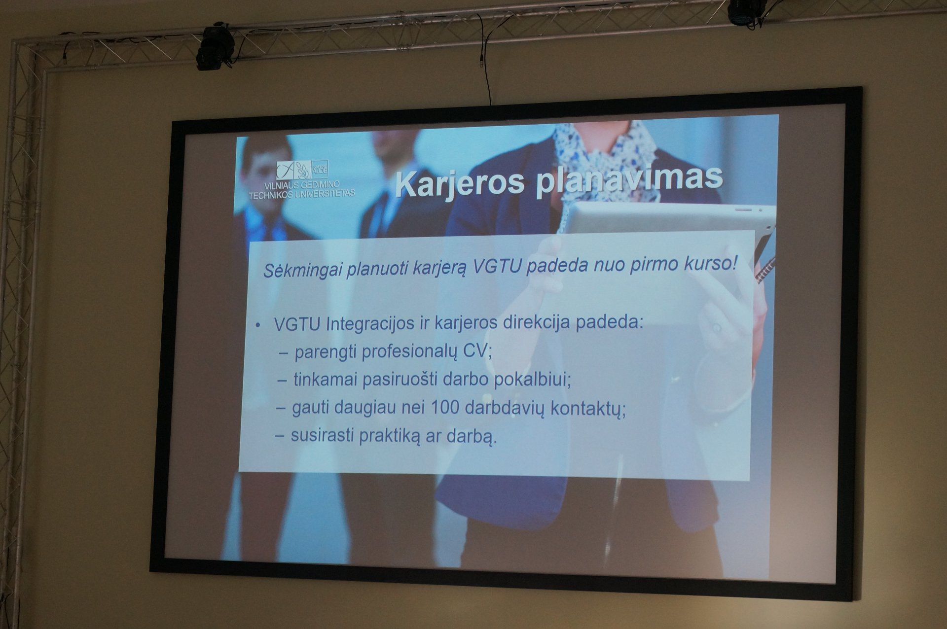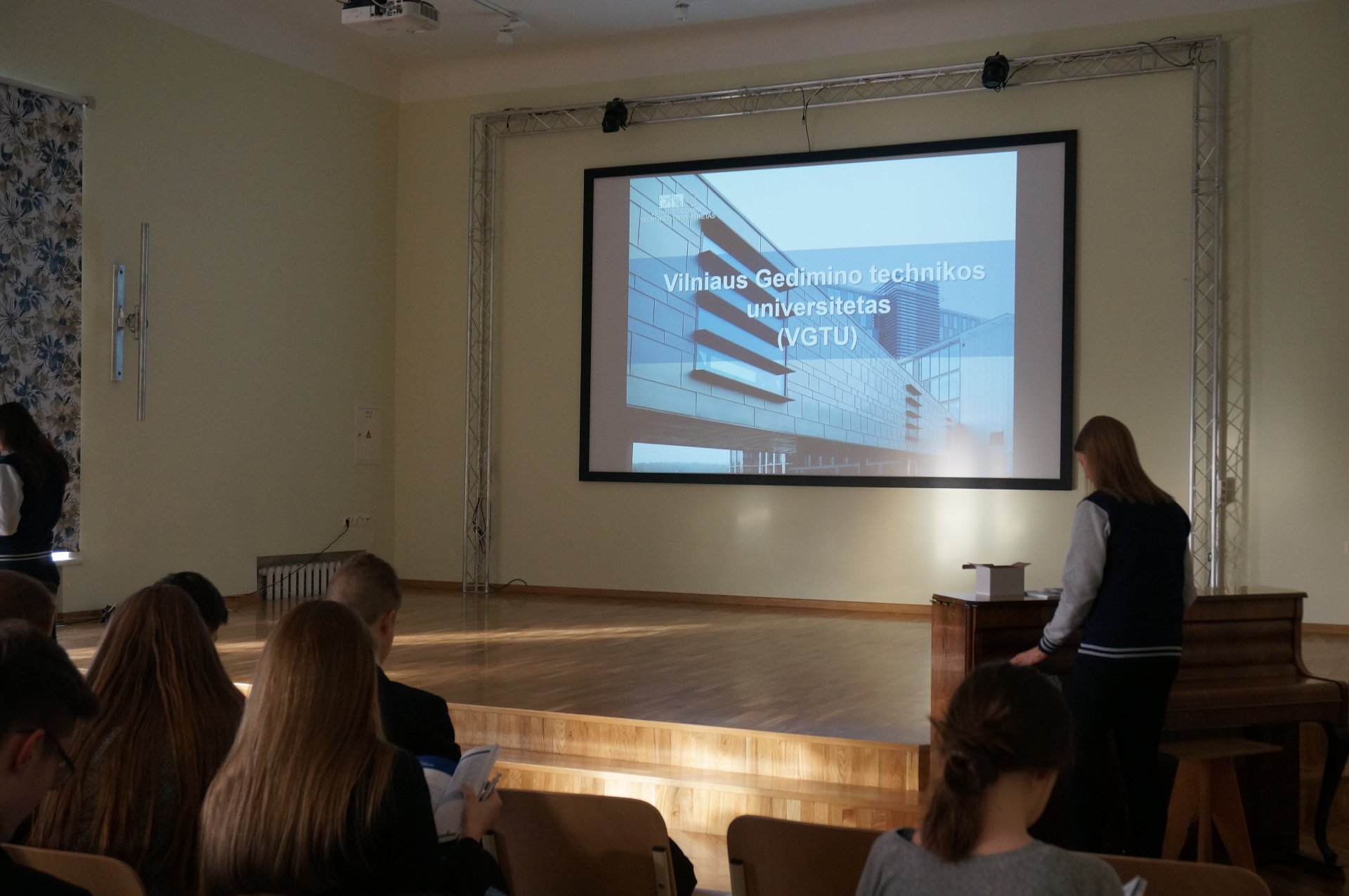 Dalis ketvirtų ir trečių gimnazijos klasių mokinių turėjo galimybę pabendrauti su atvykusiais Vilniaus Gedimino technikos universiteto studentais, kurie išsamiai pristatė visus universiteto fakultetus, įvairių sričių inžinerijos, informacinių technologijų, vadybos ir menų studijų programas. Gimnazistai domėjosi stojančiųjų konkursiniais balais, studijų tvarka, darbo perspektyvomis. Išvykdami universiteto atstovai mokiniams paliko įvairios informacijos apie studijas VGTU.