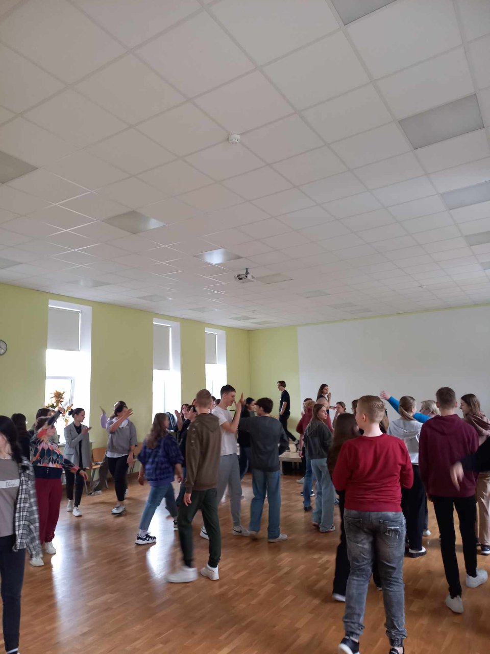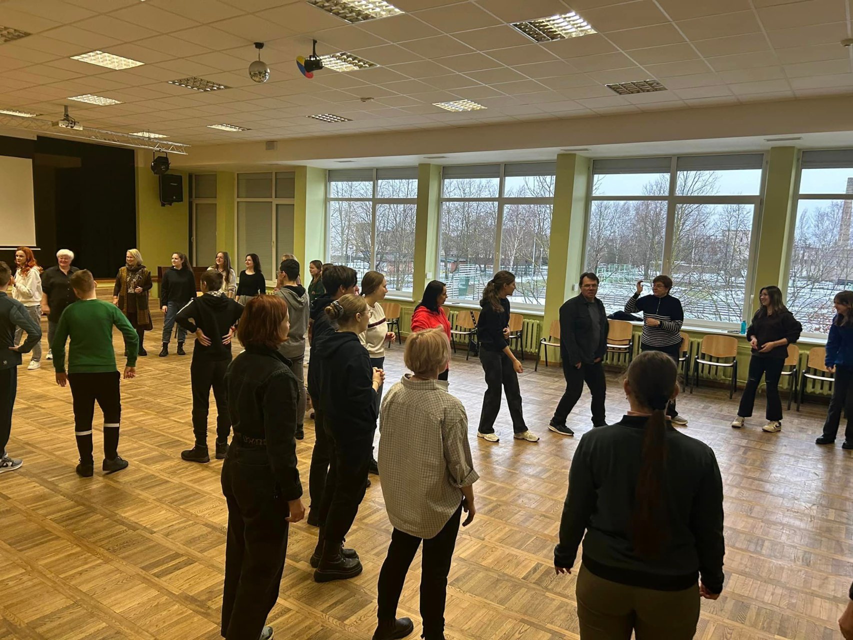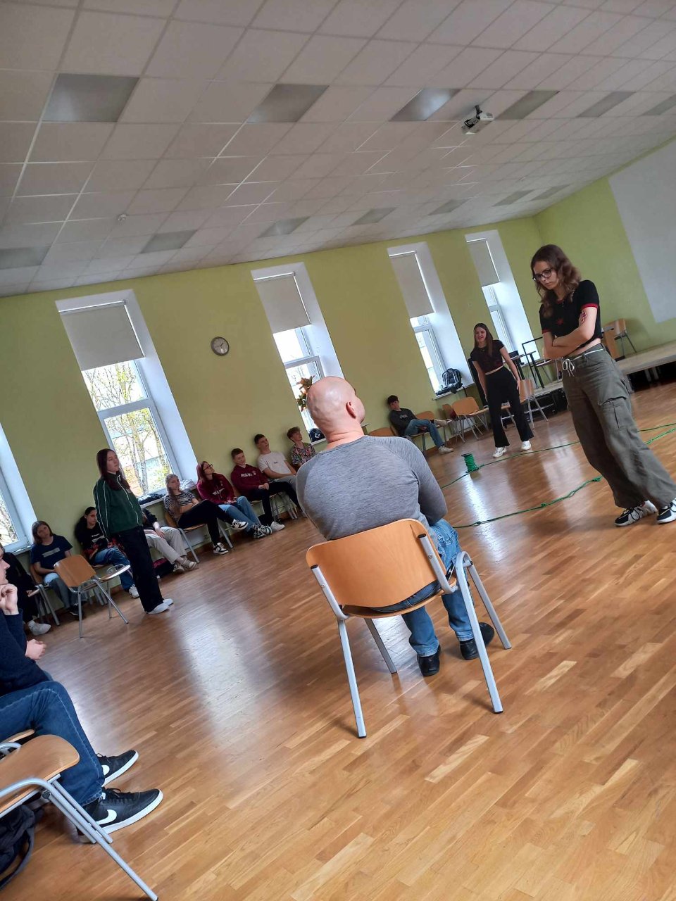 Pirmąjį užsiėmimą mokiniams ir mokytojams vedė Simonas. Su juo mokėmės susikaupimo, tvardymosi ir nejudėjimo ten, kur nereikia. Išmokome sutelkti dėmesį į aplinką. Daug dirbome prie mizanscenų. Mokėmės atsidurti nurodytoje vietoje tam tikru metu. Buvo daug painiavos, bet užduotis puikiai ugdė mūsų atmintį ir susikaupimą. Taip pat gilinome žinias apie mūsų pojūčius, ypač klausą, žaisdami tylos gaudynes. Diena su Simonu tikrai neprailgo. Buvo linksma, įgijome naujų patirčių. Kita diena buvo skirta pamokoms su Rugile. Beveik visą dieną mus lydėjo muzika ir ritmas. Daug dirbome grupėmis, lavinome susikaupimą ir greitį perduodami signalus, ritmiškai mėtėmės kamuoliukais, kūrėme judesių „mašinas" ir jas pristatėme, ugdėme savo bendradarbiavimo įgūdžius. Visą užsiėmimą vainikavo šokiai pagal populiarias dainas. Jie pareikalavo nepaprastai daug energijos, bet suteikė džiaugsmo!